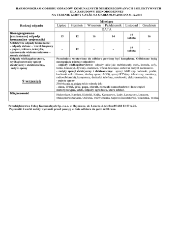 HARMONOGRAM ODBIORU ODPADÓW KOMUNALNYCH NIESEGREGOWANYCH I SELEKTYWNYCH DLA ZABUDOWY JEDNORODZINNEJ NA TERENIE GMINY CZYŻE NA OKRES 01.07.2016 DO 31.12.2016 Rodzaj odpadu Niesegregowane (zmieszane) odpady komunalne -pojemniki Selektywne odpady komunalne: - odpady zielone – worek brązowy - papier, tektura, tekstylia, opakowania wielomateriałowe – worek niebieski Odpady wielkogabarytowe, wyeksploatowany sprzęt elektryczny i elektroniczny, zużyte opony 9 wrzesień Miejscowość Miesiące Wrzesień Październik DATA Lipiec Sierpień 15 12 16 - 12 - Listopad Grudzień 14 19 sobota 16 - 19 sobota - Przedmioty wystawione do odbioru powinny być kompletne. Odbierane będą następujące rodzaje odpadów: - odpady wielkogabarytowe: odpady takie jak: meble(szafy, stoły, krzesła, sofy, łóżka, komody), dywany, materace, wózki dziecięce, zabawki dużych rozmiarów. - zużyty sprzęt elektryczny i elektroniczny: sprzęt AGD (np. lodówki, pralki, kuchenki mikrofalowe, drobny sprzęt AGD), sprzęt RTV(np. telewizory, monitory, radioodbiorniki), komputery, drukarki, telefony, notebooki, elektronarzędzia, itp.. - zużyte opony Zbiórką nie są objęte takie odpady jak: - okna, drzwi, gruz, papa, eternit, zderzaki samochodowe i inne części motoryzacyjne, szkło, odpady ogrodowe, stara odzież. Hukowicze, Kamień, Klejniki, Kojły, Kuraszewo, Lady, Leszczyny, Łuszcze, Maksymowszczyzna, Osówka, Podwieżanka, Sapowo,Szostakowo, Wieżanka, Wólka Przedsiębiorstwo Usług Komunalnych Sp. z o.o. w Hajnówce, ul. Łowcza 4, telefon:85 682 23 57 w.26. Pojemniki i worki należy wystawić przed posesję w dniu odbioru do godz. 6:00 rano. HARMONOGRAM ODBIORU ODPADÓW KOMUNALNYCH NIESEGREGOWANYCH I SELEKTYWNYCH DLA ZABUDOWY JEDNORODZINNEJ NA TERENIE GMINY CZYŻE NA OKRES 01.07.2016 DO 31.12.2016 Rodzaj odpadu Niesegregowane (zmieszane) odpady komunalne -pojemniki Selektywne odpady komunalne: - odpady zielone – worek brązowy - papier, tektura, tekstylia, opakowania wielomateriałowe – worek niebieski Odpady wielkogabarytowe, wyeksploatowany sprzęt elektryczny i elektroniczny, zużyte opony 8 wrzesień Miejscowość Miesiące Wrzesień Październik DATA Lipiec Sierpień 14 11 15 - 11 - Listopad Grudzień 13 10 15 - 10 - Przedmioty wystawione do odbioru powinny być kompletne. Odbierane będą następujące rodzaje odpadów: - odpady wielkogabarytowe: odpady takie jak: meble(szafy, stoły, krzesła, sofy, łóżka, komody), dywany, materace, wózki dziecięce, zabawki dużych rozmiarów. - zużyty sprzęt elektryczny i elektroniczny: sprzęt AGD (np. lodówki, pralki, kuchenki mikrofalowe, drobny sprzęt AGD), sprzęt RTV(np. telewizory, monitory, radioodbiorniki), komputery, drukarki, telefony, notebooki, elektronarzędzia, itp.. - zużyte opony Zbiórką nie są objęte takie odpady jak: - okna, drzwi, gruz, papa, eternit, zderzaki samochodowe i inne części motoryzacyjne, szkło, odpady ogrodowe, stara odzież. Czyże, Leniewo, Morze, Podrzeczany, Rakowicze, Zbucz. Przedsiębiorstwo Usług Komunalnych Sp. z o.o. w Hajnówce, ul. Łowcza 4, telefon:85 682 23 57 w.26. Pojemniki i worki należy wystawić przed posesję w dniu odbioru do godz. 6:00 rano. HARMONOGRAM ODBIORU ODPADÓW KOMUNALNYCH SELEKTYWNYCH DLA NA TERENIE GMINY CZYŻE NA OKRES OD 01.07.2016 r. DO 31.12.2016r. Miesiące Wrzesień Październik Data Rodzaj odpadu Lipiec Sierpień Tworzywa sztuczne, metale-pojemniki Szkło – pojemniki 4,18 1,16 2,19 5 2 8 Miejscowość Listopad Grudzień 3 4 5 4 3 8 Gmina Czyże