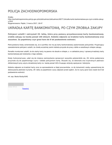 POLICJA ZACHODNIOPOMORSKA Źródło: http://zachodniopomorska.policja.gov.pl/sz/aktualnosci/aktualnosci/8277,Ukradla-karte-bankomatowa-po-czym-zrobila-zakup y.html Wygenerowano: Piątek, 3 marca 2017, 18:47 UKRADŁA KARTĘ BANKOMATOWĄ, PO CZYM ZROBIŁA ZAKUPY Policjanci ustalili i zatrzymali 29- latkę, która przy pomocy przywłaszczonej karty bankomatowej, zrobiła zakupy na kwotę ponad 140 złotych. Kobieta odpowie za kradzież karty bankomatowej oraz oszustwo. Za popełniony czyn grozi kara do 8 lat pozbawienia wolności. Pokrzywdzona kiedy zorientowała się, że w portfelu nie ma jej karty bankomatowej zaalarmowała policjantów. Przyjmujący zawiadomienie policjanci ustalili, że chwilę wcześniej zanim kobieta przyszła do pracy robiła w osiedlowym sklepie zakupy. Ponadto mundurowi ustalili, że do utarty karty na pewno nie doszło w sklepie, a w zakładzie pracy i sprawcą kradzieży karty bankomatowej jest koleżanka z tego zakładu. Kiedy funkcjonariusze, udali się do miejsca zamieszkania sprawczyni wszystko potwierdziło się. 29- letnia podejrzana przyznała się do popełnionego czynu i oddała policjantom kartę. Okazało się, że dokonała ona trzykrotnych płatności zbliżeniowych przy użyciu skradzionej karty na kwotę ponad 140 zł kupując artykuły spożywcze i tekstylne. Kobieta odpowie za kradzież karty oraz za wprowadzenie w błąd pracowników, co do tożsamości osoby upoważnionej do dokonywania płatności tą kartą. 29- latka za popełnione czyny odpowie przed sądem. Za te czyny grozi kara nawet do 8 lat pozbawienia wolności. mł. asp. Beata Budzyń/AG Ocena: 5/5 (1) Tweetnij
