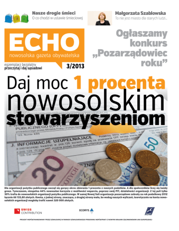 Nasze drogie śmieci www.facebook.com/echonowasol O co chodzi w ustawie śmieciowej egzemplarz bezpłatny przeczytaj i daj sąsiadowi 3/2013 Małgorzata 3/2013 Szablowska 1 To nie jest miasto dla starych ludzi… Ogłaszamy konkurs „Pozarządowiec roku” Daj moc 1 procenta nowosolskim stowarzyszeniom Dla organizacji pożytku publicznego zaczął się gorący okres zbierania 1 procenta z naszych podatków. A dla społeczników liczy się każdy grosz. Tymczasem, niespełna 44% nowosolan korzysta z możliwości wsparcia, poprzez swój PIT, działalności organizacji. Z tej puli tylko 30% trafia do nowosolskich organizacji pożytku publicznego. W samej Nowej Soli organizacje pozarządowe zebrały za rok podatkowy 2012 łącznie 66 133,80 złotych. Kwota, z jednej strony, znacząca, z drugiej strony mała, bo wedug naszych wyliczeń, teoretycznie na konta nowosolskich organizacji mogłoby trafić nawet 320 000 złotych. PROJEKT WSPÓŁFINANSOWANY PRZEZ SZWAJCARIĘ W RAMACH SZWAJCARSKIEGO PROGRAMU WSPÓŁPRACY Z NOWYMI KRAJAMI CZŁONKOWSKIMI UNII EUROPEJSKIEJ 2 3/2013 www.echo.nowasol24.pl Ogłaszamy pierwszy w historii miasta konkurs na „Pozarządowca roku”. Chcemy uhonorować tych, którzy w sposób szczególny, poprzez swoją działalność społeczną, przyczynili się do rozwoju sektora pozarządowego w Nowej Soli. Nowosolski pozarządowiec roku zują czas wolny dzieciom i młodzieży, prowadzą zajęcia sportowe, podejmują inicjatywy obywatelskie… I to często za przysłowiowe „dziękuję” nie oczekując nic w zamian. To oni tworzą świat, w którym żyjemy. Mówiąc krótko: zasługują na szczególne uznanie. Rafał Stasiński Pozarządowiec? Któż to jest? W słowniku polskim nawet nie ma takiego słowa. Dlatego je wymyśliliśmy. Chodzi o działacza organizacji pozarządowej, czyli stowarzyszenia czy fundacji. W Nowe Soli funkcjonuje przeszło setka organizacji. Robią rzeczy wielkie, o których mało się mówi. Pomagają osobom niepełnosprawnym, organi- Kogo szukamy? Konkurs „Pozarządowiec roku” jest skierowany do wszystkich działaczy i wolontariuszy organizacji pozarządowych z terenu Nowej Soli. Chcemy uhonorować tych, którzy w sposób szczególny poprzez swoją działalność społeczną przyczynili się do rozwoju sektora pozarządowego. Organizatorem przedsięwzięcia jest Stowarzyszenie Forum Inicjatyw Nowosolskich w part- nerstwie ze Stowarzyszeniem Europejskie Centrum Innowacji. Konkurs odbywa się w 2 kategoriach: nagroda indywidualna i nagroda zespołowa. W pierwszym przypadku można zgłaszać osoby (wolontariuszy, członków organizacji), które przyczyniły się do rozwoju organizacji pozarządowej. W drugim - organizację pozarządową (fundacje, stowarzyszenia itp.). Jak zgłosić kandydata? Aby zgłosić kandydata do konkursu, wystarczy wejść na stronę internetową www.echo.nowasol24.pl. Stamtąd można pobrać formularz zgłoszeniowy. Następnie, należy go wypełnić i przesłać na adres: ul. Wrocławska 31/25, 67-100 Nowa Sól. Soluś i Lusia W tej chwili powołujemy kapitułę honorową. Do kapituły zapraszamy wszystkich chętnych członków stowarzyszeń z Nowej Soli. Zgłoszenia proszę przesyłać na nasz redakcyjny e-mail: [email protected]. W treści proszę podać imię i nazwisko, nazwę organizacji pozarządowej oraz nr telefonu. Na zakończenie konkursu odbędzie się specjalna gala wręczenia upominkowych statuetek. Uhonorowana organizacja otrzyma bezpłatne doradztwo eksperta, o wartości 5 tys. złotych, w zakresie przygotowania wniosku o dofinansowanie oraz źródeł finansowania działalności. Rafał Stasiński Prezes Europejskiego Centrum Innowacji Zostań wolontariuszem ECHO! poszukujemy: fotografów, także fotografów amatorów, autorów tekstów, dziennikarzy i ludzi z fajnymi pomysłami oferujemy: umową wolontariacką, referencje, bezpłatne szkolenie dziennikarskie, możliwość zdobycia ciekawego doświadczenia wymagamy: otwartości na wyzwania, kreatywności, zmysłu do obserwacji i wyrażania swego zdania Najlepszym oferujemy docelowo możliwość pracy na umowę zlecenie Wydawca: Stowarzyszenie Forum Inicjatyw Nowosolskich Adres redakcji: 67-100 Nowa Sól, ul. Wrocławska 31/25 Redaktor naczelny: Wojciech Olszewski Kontakt: [email protected] www.echo.nowasol24.pl Nakład: 7000 egzemplarzy Egzemplarz bezpłatny Redakcja nie zwraca niezamówionych tekstów a także zastrzega sobie prawo ich redagowania i skracania. Rozpowszechnianie materiałów redakcyjnych bez zgody wydawcy jest zabronione. Skontakuj się z nami na facebooku lub poprzez e-mail: [email protected] www.facebook.com/echonowasol LICZBA MIESIĄCA 20 000 Tylu turystów ma przyjechać do Nowej Soli, by popływać statkiem. Przynajmniej tak zasugerował prezydent miasta Wadim Tyszkiewicz na spotkaniu we Wrocławiu. Jak donosi Gazeta Wyborcza nasz włodarz obwieścił, że Nowa Sól w 2014 roku spodziewa się przyjazdu co najmniej 20 tysięcy turystów. Wszyscy oni zjadą, by popływać nowym statkiem oczywiście. W towarzystwie włodarz miasta błysnął i zaimponował. Ale spróbujmy policzyć. Gdy 20 000 podzieli się przez 365 dni roku daje to wynik: 55 osób dziennie. Oczywiście, statek nie pływa w zimie. Trzeba zatem odliczyć kilka miesięcy. Sprawdźmy na stronie projektu „Odra dla turystów” – przerwa w kursach „Laguny” trwa od listopada do marca – równe 5 miesięcy czyli – 151 dni. Podzielmy zatem znów 20 000 turystów spragnionych rejsów Laguną, przez 214 pozo- stałych dni. Daje to 94 osoby, czyli mniej więcej tyle, ile zabiera statek w jeden rejs. Brzmi realnie? Ale, ale… Czy możliwe są codzienne rejsy w pełnym obłożeniu przyjezdnymi turystami? Pojawia się kolejny kłopot. Okazuje się, że według planów rejsów Laguną, Nowa Sól będzie dysponowała statkiem jedynie przez część miesiąca – bo będzie musiała podzielić się z innymi miejscowościami: Bytomiem Odrzańskim, Głogowem, Cigacicami. Wy