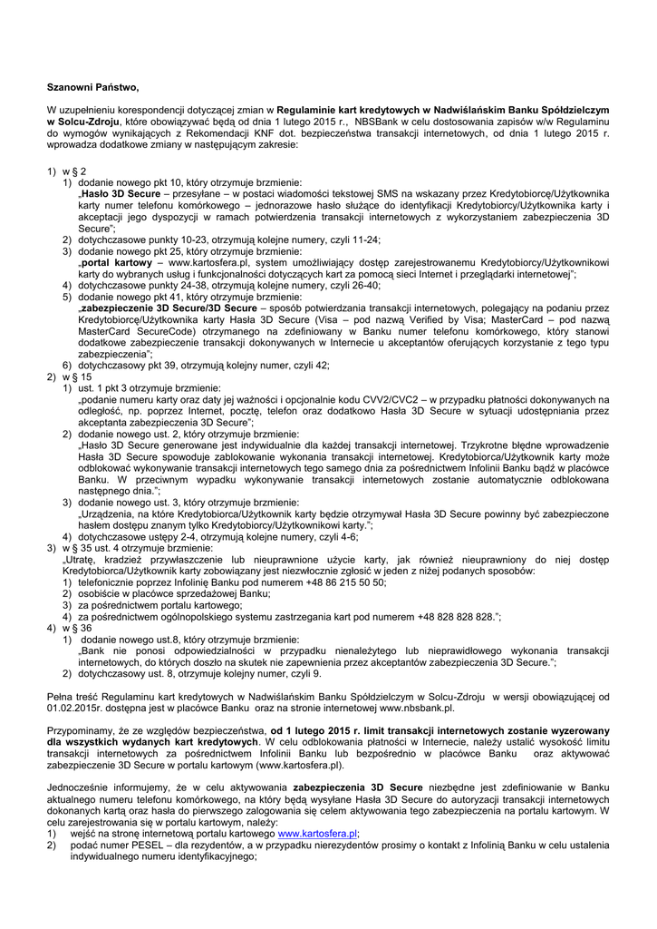 Szanowni Państwo, W uzupełnieniu korespondencji dotyczącej zmian w Regulaminie kart kredytowych w Nadwiślańskim Banku Spółdzielczym w Solcu-Zdroju, które obowiązywać będą od dnia 1 lutego 2015 r., NBSBank w celu dostosowania zapisów w/w Regulaminu do wymogów wynikających z Rekomendacji KNF dot. bezpieczeństwa transakcji internetowych, od dnia 1 lutego 2015 r. wprowadza dodatkowe zmiany w następującym zakresie: 1) w § 2 1) dodanie nowego pkt 10, który otrzymuje brzmienie: „Hasło 3D Secure – przesyłane – w postaci wiadomości tekstowej SMS na wskazany przez Kredytobiorcę/Użytkownika karty numer telefonu komórkowego – jednorazowe hasło służące do identyfikacji Kredytobiorcy/Użytkownika karty i akceptacji jego dyspozycji w ramach potwierdzenia transakcji internetowych z wykorzystaniem zabezpieczenia 3D Secure”; 2) dotychczasowe punkty 10-23, otrzymują kolejne numery, czyli 11-24; 3) dodanie nowego pkt 25, który otrzymuje brzmienie: „portal kartowy – www.kartosfera.pl, system umożliwiający dostęp zarejestrowanemu Kredytobiorcy/Użytkownikowi karty do wybranych usług i funkcjonalności dotyczących kart za pomocą sieci Internet i przeglądarki internetowej”; 4) dotychczasowe punkty 24-38, otrzymują kolejne numery, czyli 26-40; 5) dodanie nowego pkt 41, który otrzymuje brzmienie: „zabezpieczenie 3D Secure/3D Secure – sposób potwierdzania transakcji internetowych, polegający na podaniu przez Kredytobiorcę/Użytkownika karty Hasła 3D Secure (Visa – pod nazwą Verified by Visa; MasterCard – pod nazwą MasterCard SecureCode) otrzymanego na zdefiniowany w Banku numer telefonu komórkowego, który stanowi dodatkowe zabezpieczenie transakcji dokonywanych w Internecie u akceptantów oferujących korzystanie z tego typu zabezpieczenia”; 6) dotychczasowy pkt 39, otrzymują kolejny numer, czyli 42; 2) w § 15 1) ust. 1 pkt 3 otrzymuje brzmienie: „podanie numeru karty oraz daty jej ważności i opcjonalnie kodu CVV2/CVC2 – w przypadku płatności dokonywanych na odległość, np. poprzez Internet, pocztę, telefon oraz dodatkowo Hasła 3D Secure w sytuacji udostępniania przez akceptanta zabezpieczenia 3D Secure”; 2) dodanie nowego ust. 2, który otrzymuje brzmienie: „Hasło 3D Secure generowane jest indywidualnie dla każdej transakcji internetowej. Trzykrotne błędne wprowadzenie Hasła 3D Secure spowoduje zablokowanie wykonania transakcji internetowej. Kredytobiorca/Użytkownik karty może odblokować wykonywanie transakcji internetowych tego samego dnia za pośrednictwem Infolinii Banku bądź w placówce Banku. W przeciwnym wypadku wykonywanie transakcji internetowych zostanie automatycznie odblokowana następnego dnia.”; 3) dodanie nowego ust. 3, który otrzymuje brzmienie: „Urządzenia, na które Kredytobiorca/Użytkownik karty będzie otrzymywał Hasła 3D Secure powinny być zabezpieczone hasłem dostępu znanym tylko Kredytobiorcy/Użytkownikowi karty.”; 4) dotychczasowe ustępy 2-4, otrzymują kolejne numery, czyli 4-6; 3) w § 35 ust. 4 otrzymuje brzmienie: „Utratę, kradzież przywłaszczenie lub nieuprawnione użycie karty, jak również nieuprawniony do niej dostęp Kredytobiorca/Użytkownik karty zobowiązany jest niezwłocznie zgłosić w jeden z niżej podanych sposobów: 1) telefonicznie poprzez Infolinię Banku pod numerem +48 86 215 50 50; 2) osobiście w placówce sprzedażowej Banku; 3) za pośrednictwem portalu kartowego; 4) za pośrednictwem ogólnopolskiego systemu zastrzegania kart pod numerem +48 828 828 828.”; 4) w § 36 1) dodanie nowego ust.8, który otrzymuje brzmienie: „Bank nie ponosi odpowiedzialności w przypadku nienależytego lub nieprawidłowego wykonania transakcji internetowych, do których doszło na skutek nie zapewnienia przez akceptantów zabezpieczenia 3D Secure.”; 2) dotychczasowy ust. 8, otrzymuje kolejny numer, czyli 9. Pełna treść Regulaminu kart kredytowych w Nadwiślańskim Banku Spółdzielczym w Solcu-Zdroju w wersji obowiązującej od 01.02.2015r. dostępna jest w placówce Banku oraz na stronie internetowej www.nbsbank.pl. Przypominamy, że ze względów bezpieczeństwa, od 1 lutego 2015 r. limit transakcji internetowych zostanie wyzerowany dla wszystkich wydanych kart kredytowych. W celu odblokowania płatności w Internecie, należy ustalić wysokość limitu transakcji internetowych za pośrednictwem Infolinii Banku lub bezpośrednio w placówce Banku oraz aktywować zabezpieczenie 3D Secure w portalu kartowym (www.kartosfera.pl). Jednocześnie informujemy, że w celu aktywowania zabezpieczenia 3D Secure niezbędne jest zdefiniowanie w Banku aktualnego numeru telefonu komórkowego, na który będą wysyłane Hasła 3D Secure do autoryzacji transakcji internetowych dokonanych kartą oraz hasła do pierwszego zalogowania się celem aktywowania tego zabezpieczenia na portalu kartowym. W celu zarejestrowania się w portalu kartowym, należy: 1) wejść na stronę internetową portalu kartowego www.kartosfera.pl; 2) podać numer PESEL – dla rezydentów, a w przypadku nierezydentów prosimy o kontakt z Infolinią Banku w celu ustalenia indywidualnego numeru identyfikacyjnego; 3) wpisać otrzymane na numer telefonu komórkowego hasło do pierwszego zalogowania się w portalu kartowym. Portal kartowy będzie dostępny dla Państwa od 1 lutego 2015r. i za jego pośrednictwem będą Państwo mogli dokonać następujących czynności: - aktywować zabezpieczenie 3D Secure, - zmieniać kod PIN, - zastrzegać kartę. O dodaniu kolejnych funkcjonalności w portalu będziemy Państwa informować na bieżąco. Kredytobiorca ma prawo, przed proponowaną datą wejścia w życie zmian, wypowiedzieć Umowę ze skutkiem natychmiastowym. Zgłoszenie sprzeciwu bez dokonania wypowiedzenia Umowy, skutkuje wygaśnięciem Umowy z dniem poprzedzającym dzień wejścia w życie proponowanych zmian. Nie złożenie przez Kredytobiorcę oświadczenia o zgłoszeniu sprzeciwu lub wypowi