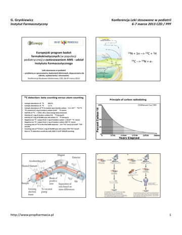 G. Grynkiewicz Instytut Farmaceutyczny Europejski program badań farmakokinetycznych (w populacji pediatrycznej) z zastosowaniem AMS - udział Instytutu Farmaceutycznego Konferencja Leki stosowane w pediatrii 6-7 marca 2013 CZD / PPF 14N + 1n --> 14C + 1H 14C --> 14N + e- Leki stosowane w pediatrii – problemy w opracowaniu, badaniach klinicznych, dopuszczaniu do obrotu, wytwarzaniu i stosowaniu Konferencja Naukowo-Szkoleniowa, CZD, 06-07 marca 2013 14C detection: beta counting versus atom counting Principle of carbon radiodating Isotopic abundance of 12C 98.9 % Isotopic abundance of 13C 1.1 % 14 Isotopic abundance of C in modern (pre-bomb) carbon: 1.2 x 10-12 14C/12C 14C content of 1 mg of modern carbon 6x107 14C atoms Half-life of 14C = 5730 ± 40 y (low energy beta emission) Activity of 1 mg of modern carbon 0.8 14C decays/h Activity of 1 mg of 50,000-year old carbon 17 14C decays/y Negative ion 12C− output from 1 mg of modern carbon 1.9x1014 12C− ions/s Negative ion 14C− output from 1 mg of modern carbon 230 14C− ions/s Counting rate of 14C in the final AMS detector : 115 14C3+ ions/s (4.1x105 14C3+ ions/h) • Counting rate of 14C from 1 mg of 50,000-year old carbon 970 14C3+ ions/h • Gain in 14C detection sensitivity with AMS 5.1x105 AMS/ß-counting. • • • • • • • • • • http://www.propharmacia.pl 1 G. Grynkiewicz Instytut Farmaceutyczny Konferencja Leki stosowane w pediatrii 6-7 marca 2013 CZD / PPF AMS Accelerator Mass Spectrometry Principle AMS Accelerator Mass Spectrometry Equippment AMS Facility at Xceleron Ltd., York, UK As the half-life of 14C is 5730 years, only 0.012% of 14C atoms decay in a given year. To observe one disintegration per second, 4.3 x 10^9 14C atoms must be present. For precise AMS count approx. 1000 14C atoms need to be recorded! (atto – zepto range) http://www.propharmacia.pl Accelerator Mass Spectrometry Accuracy AMS (Accelerator MassSpectrometry) is an extremely sensitive analytical technique with the ability to detect drugs down to 10-18 (attogram) to 10-21(zeptogram) moles AMS has the potential for analysing drug and metabolite concentrations in body fluids withdrawn at time intervals after dosing. AMS requires isotopically labeled candidate drugs, in contrast to liquid chromatography/mass spectrometry (LC/MS). However, the latter method does not currently have the necessary sensitivity to accurately measure drug concentrations at microdoses. Besides, the amount of radioactivity used is so low (nCi/Bqs) that it is not considered to be radioactive dose from a regulatory perspective. AMS measures isotopes at the single atom level and allows the determination of isotope ratio 12C/14C with exquisite precision. It measures isotope atoms by mass and not decay. As a result, AMS sensitivity is 1 million times higher than liquid scintillation counting and up to hundred thousand times higher than conventional mass spectrometry. 2 G. Grynkiewicz Instytut Farmaceutyczny European Union Microdose AMS Partnership Programme (EUMAPP 2006 - 2008) – Background The microdosing approach offers the opportunity of early human screening of many more drug candidates offering greater predictability versus animal and/or in vitro models. Hence, human microdosing studies offer the promise of (1) improved candidate selection (2) reduced attrition rates (3) safer clinical studies and (4) a potential reduction in the use of animals in early clinical development. The microdosing approach could by this means potentially reduce the time of pre-clinical testing from 18 months to 4 to 6 months and cut down the associated expenses by 10 times. The EUMAPP Consortium 1 XCELERON , Colin GARNER; York, UK 2 Institut de Recherches Internationales (IRIS), Roeline JOCHEMSEN; Courbevoie, FR 3 Pharma Bio-Research Group B.V. (PBR), Berend OOSTERHUIS ; Zuidlaren, NL 4 University of Manchester (CAPKR), Brian HOUSTON; Manchester , UK 5 Pharmaceutical Research Institute (PRI), Grzegorz GRYNKIEWICZ; Warsaw, PL 6 CYPROTEX Discovery Ltd (CYPROTEX) Simon THOMAS; Macclesfield, UK 7 University of Lund (L.U.), Kristina STENSTRÖM; Lund, SE 8 European Federation for Pharmaceutical Sciences (EUFEPS) O.J. BJERRUM; Stockholm, SE 9 Foundation for the Evaluation of Ethics in Biomedical Research (BEBO), Rokus DE ZEEUW; Assen NL 10 ACIES, David KOUBI; Lyon, FR Konferencja Leki stosowane w pediatrii 6-7 marca 2013 CZD / PPF European Union Microdose AMS Partnership Programme (EUMAPP; 2006 - 2008) experience: 1) Acetaminofen (Paracetamol) 2) Clarithromycin 3) Fexofenadine ( - ) 4) Phenobarbital 5) Propafenone 6) Sumatriptan 7) S-19812-1 (drug candidate) [IMPD documentation completed] 8) S-23361-1 (drug candidate active metabolite) Microdosing (< 100 microgram, microgram, single dose dose)) validated as method for collecting PK parameters and information about metabolism; metabolism; accepted as Phase 0 Clinical Study PRIOMEDCHILD (Pamper) Standard procedure for AMS – microdosing study on selected drug API: 1. Collecting information on drug metabolism 2. Critical survey of synthetic methods and choice of labeling proceure 3. Securing dedicated personnel, space and equipment 4. Cold synthesis, elaboration of analytical methods 5. Scale-down to a single miligram level 6. Execution of synthesis with use of radiotracer 7. Purification of the labeled sample 8. Starting stability study 9. Certification 10. Distribution to the project partners; storage of archive samples The PAMPER Consortium ERA-NET PRIOMEDCHILD Project 40-41800-98-022 (2011-2014) • • • • • • • • • University of Liverpool (UoLi), Liverpool UK; Prof. Kevin Park (project Coordinator) Garner Consulting Services (GCS), York, UK; Prof. Colin Garner (project Manager) Alderhey Children’s Hospital (AHCH), Liverpool, UK; Dr. T. Nunn Tartu University Hospital (TUH), Tartu, Estonia; Dr. Heili Varendi Pharmaceutical Research Institute (PRI), Warsaw, Poland; Prof. G. Grynkiewicz Addenbrooke’s Hospital, Cambridge, UK;