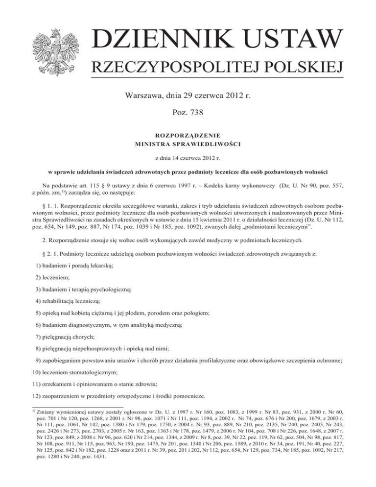 DZIENNIK USTAW RZECZYPOSPOLITEJ POLSKIEJ Warszawa, dnia 29 czerwca 2012 r. Poz. 738 ROZPORZĄDZENIE MINISTRA SPRAWIEDLIWOŚCI z dnia 14 czerwca 2012 r. w sprawie udzielania świadczeń zdrowotnych przez podmioty lecznicze dla osób pozbawionych wolności Na podstawie art. 115 § 9 ustawy z dnia 6 czerwca 1997 r. – Kodeks karny wykonawczy (Dz. U. Nr 90, poz. 557, z późn. zm.1)) zarządza się, co następuje: § 1. 1. Rozporządzenie określa szczegółowe warunki, zakres i tryb udzielania świadczeń zdrowotnych osobom pozbawionym wolności, przez podmioty lecznicze dla osób pozbawionych wolności utworzonych i nadzorowanych przez Ministra Sprawiedliwości na zasadach określonych w ustawie z dnia 15 kwietnia 2011 r. o działalności leczniczej (Dz. U. Nr 112, poz. 654, Nr 149, poz. 887, Nr 174, poz. 1039 i Nr 185, poz. 1092), zwanych dalej „podmiotami leczniczymi”. 2. Rozporządzenie stosuje się wobec osób wykonujących zawód medyczny w podmiotach leczniczych. § 2. 1. Podmioty lecznicze udzielają osobom pozbawionym wolności świadczeń zdrowotnych związanych z: 1) badaniem i poradą lekarską; 2) leczeniem; 3) badaniem i terapią psychologiczną; 4) rehabilitacją leczniczą; 5) opieką nad kobietą ciężarną i jej płodem, porodem oraz połogiem; 6) badaniem diagnostycznym, w tym analityką medyczną; 7) pielęgnacją chorych; 8) pielęgnacją niepełnosprawnych i opieką nad nimi; 9) zapobieganiem powstawaniu urazów i chorób przez działania profilaktyczne oraz obowiązkowe szczepienia ochronne; 10) leczeniem stomatologicznym; 11) orzekaniem i opiniowaniem o stanie zdrowia; 12) zaopatrzeniem w przedmioty ortopedyczne i środki pomocnicze. 1) Zmiany wymienionej ustawy zostały ogłoszone w Dz. U. z 1997 r. Nr 160, poz. 1083, z 1999 r. Nr 83, poz. 931, z 2000 r. Nr 60, poz. 701 i Nr 120, poz. 1268, z 2001 r. Nr 98, poz. 1071 i Nr 111, poz. 1194, z 2002 r. Nr 74, poz. 676 i Nr 200, poz. 1679, z 2003 r. Nr 111, poz. 1061, Nr 142, poz. 1380 i Nr 179, poz. 1750, z 2004 r. Nr 93, poz. 889, Nr 210, poz. 2135, Nr 240, poz. 2405, Nr 243, poz. 2426 i Nr 273, poz. 2703, z 2005 r. Nr 163, poz. 1363 i Nr 178, poz. 1479, z 2006 r. Nr 104, poz. 708 i Nr 226, poz. 1648, z 2007 r. Nr 123, poz. 849, z 2008 r. Nr 96, poz. 620 i Nr 214, poz. 1344, z 2009 r. Nr 8, poz. 39, Nr 22, poz. 119, Nr 62, poz. 504, Nr 98, poz. 817, Nr 108, poz. 911, Nr 115, poz. 963, Nr 190, poz. 1475, Nr 201, poz. 1540 i Nr 206, poz. 1589, z 2010 r. Nr 34, poz. 191, Nr 40, poz. 227, Nr 125, poz. 842 i Nr 182, poz. 1228 oraz z 2011 r. Nr 39, poz. 201 i 202, Nr 112, poz. 654, Nr 129, poz. 734, Nr 185, poz. 1092, Nr 217, poz. 1280 i Nr 240, poz. 1431. Dziennik Ustaw –2– Poz. 738 2. W uzasadnionych przypadkach, gdy świadczenia zdrowotne wymienione w ust. 1 nie mogą być udzielone osobom pozbawionym wolności przez podmioty lecznicze w szczególności z powodu: 1) konieczności natychmiastowego udzielenia świadczeń zdrowotnych ze względu na zagrożenie życia lub zdrowia osoby pozbawionej wolności, 2) konieczności przeprowadzenia specjalistycznych badań lekarskich, leczenia lub rehabilitacji osoby pozbawionej wolności, 3) konieczności przeprowadzenia badań diagnostycznych z powodu braku specjalistycznego sprzętu medycznego, 4) konieczności zapewnienia świadczeń zdrowotnych podczas korzystania przez osobę pozbawioną wolności z przepustki lub czasowego zezwolenia na opuszczenie zakładu karnego lub aresztu śledczego, zwanych dalej „zakładem karnym” – świadczenia te są udzielane przez pozawięzienne podmioty lecznicze. 3. O konieczności udzielenia świadczenia zdrowotnego przez pozawięzienne podmioty lecznicze w przypadkach, o których mowa w ust. 2 pkt 1–3, decyduje kierownik podmiotu leczniczego lub lekarz podmiotu leczniczego, lub lekarz dentysta podmiotu leczniczego właściwego dla miejsca osadzenia osoby pozbawionej wolności, wobec której mają być udzielane te świadczenia zdrowotne. 4. Udzielanie świadczeń zdrowotnych w przypadkach, o których mowa w ust. 2, nie może naruszać zasad regulujących wykonywanie kar, środków karnych, zabezpieczających i zapobiegawczych. 5. Osobom pozbawionym wolności zapewnia się transport sanitarny – w uzasadnionych przypadkach. § 3. Osobę pozbawioną wolności poddaje się badaniom wstępnym, okresowym i kontrolnym. § 4. 1. Badaniom wstępnym: podmiotowym (wywiad chorobowy) i przedmiotowym (fizykalnym) poddaje się osobę pozbawioną wolności niezwłocznie po przyjęciu do zakładu karnego, nie później jednak niż w terminie 3 dni roboczych od dnia przyjęcia. 2. W terminie 14 dni od dnia przyjęcia do zakładu karnego wykonuje się profilaktyczne radiologiczne badanie klatki piersiowej oraz badanie stanu uzębienia. 3. Lekarz podmiotu leczniczego może odstąpić od wykonania profilaktycznego radiologicznego badania klatki piersiowej po przeprowadzeniu badania lekarskiego, jeżeli osoba pozbawiona wolności przedstawi wynik takiego badania wykonanego w okresie 6 miesięcy poprzedzających datę przyjęcia do zakładu karnego. 4. Lekarz podmiotu leczniczego odstępuje od wykonania profilaktycznego radiologicznego badania klatki piersiowej po przeprowadzeniu badania lekarskiego, w przypadku podejrzenia lub stwierdzenia ciąży. 5. Fakt odstąpienia od profilaktycznego radiologicznego badania klatki piersiowej lekarz podmiotu leczniczego odnotowuje w książce zdrowia, podając przyczynę odstąpienia od badania. 6. Lekarz podmiotu leczniczego lub lekarz dentysta podmiotu leczniczego może zlecić przeprowadzenie badań innych niż wymienione w ust. 2, jeżeli jest to uzasadnione stanem zdrowia osoby pozbawionej wolności. § 5. 1. Badaniu okresowemu polegającemu na wykonaniu profilaktycznego radiologicznego badania klatki piersiowej osobę pozbawioną wolności poddaje się co najmniej raz na 24 miesiące. 2. Od wykonania profilaktycznego radiologicznego badania klatki piersiowej można odstąpić po przeprowadzeniu badania le
