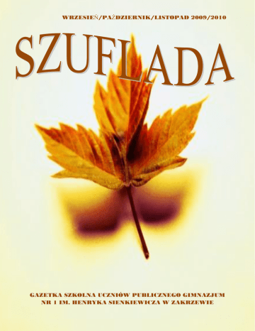WRZESIEŃ/PAŹDZIERNIK/LISTOPAD 2009/2010 GAZETKA SZKOLNA UCZNIÓW PUBLICZNEGO GIMNAZJUM NR 1 IM. HENRYKA SIENKIEWICZA W ZAKRZEWIE Nr 1 2009/2010 GAZETKA SZKOLNA PUBLICZNEGO GIMNAZJUM NR 1 IM. HENRYKA SIENKIEWICZA W ZAKRZEWIE MAMY NADZIEJĘ, ŻE SPEŁNIMY WASZE OCZEKIWANIA!!! Redakcja „opiekunowie” – M. Sobień, J. Bińkowska Oprawa graficzna- J. Bińkowska W bieżącym roku szkolnym szeregi naszej REDAKCJI zasilą: 1. Aldona Wawrzyńska kl. I b 2. Monika Majchrzak kl. III d; 3. Magdalena Mortka kl. III d; 4. Dorota Kszczotek, kl. III d; 5. Anita Żurek, kl. III d; 6. Paweł Leśniewski kl. III d; 7. Michał Głogowski III d; 8. Izabela Rogala II a; 9. Kinga Słowik II a; 10. Olga Rdzanek II a; 11. Magdalena Falińska II d; 12. Kinga Pogodzińska II a; 13. Justyna Gulińska II a; 14. Milena Górka II a; 15. Sylwia Kowal II a; Wszystkim nauczycielom oraz osobom pracującym w naszej szkole z okazji Dnia Nauczyciela spełnienia marzeń, dużo radości i satysfakcji z wykonywanej pracy oraz samych grzecznych i zdolnych uczniów życzą: Uczniowie Publicznego Gimnazjum nr 1 im. H. Sienkiewicza! W NUMERZE * UCZNIOWIE KL. I * NOWINKI Z ŻYCIA SZKOŁY * PO LEKCJACH * HUMOR * ROZWIJAJMY SIĘ… * KĄCIK KULINARNY * KRZYŻÓWKA TEMATYCZNA * HALLOWEEN * JAK JĄ PODERWAĆ * MODA NA JESIEŃ * CO SIĘ STAŁO Z „NASZĄ KLASĄ” * PRZYBLIZENIE SYLWETKI POLSKIEGO PAPIEŻA JANA PAWŁA II * 25 ROCZNICA ŚMIERCI KSIĘDZA JERZEGO POPIEŁUSZKI * MICHEL JECKSON * LISTOPADOWA ZADUMA KLASA Ib Klasa do której chodzę jest z dwóch szkół: z Woli Taczowskiej i z Gulina. Z Woli Taczowskiej jest 15 osób, a 7 z Gulina. W klasie jest w sumie 24 uczniów w tym 11 dziewcząt i 13 chłopców. Miejscowości, z których pochodzimy to: Taczów, Legęzów, Dąbrówka Nagórna, Nieczatów, Gulin, Gulinek i Kozinki. Wychowawcą naszej klasy jest Pani Małgorzata Białkowska, którą bardzo lubimy. Uważam, że jesteśmy zgraną klasą i zawsze się dogadujemy. Aldona Wawrzyńska Kl. 1f W klasie 1f jest dwadzieścia cztery osoby w tym cztery dziewczynki i dwudziestu chłopców. Nasza wychowawczyni to pani Małgorzata Koprowska. Jest nauczycielką geografii . Wszyscy chłopcy z naszej klasy uwielbiają grać w piłkę nożną. Biorą udział w wielu zawodach sportowych związanych właśnie z tą dyscypliną. Dziewczyny lubią lekkoatletykę oraz grę w siatkówkę. Lubimy także przedmioty szkolne, a w szczególności chemię, na której mieszamy przeróżne substancje i składniki. Nasza klasa ma oryginalne poczucie humoru i lubi czasem płatać figle. W klasie I d przewagę stanowią dziewczęta- jest ich dwanaście, a chłopców dziesięciu. Wszyscy bardzo się lubimy i staramy się być dla siebie mili. W poprzednim roku szkolnym uczęszczaliśmy do Publicznej Szkoły Podstawowej im. Jana Kochanowskiego w Zakrzewie. Tam też chętnie uczestniczyliśmy w konkursach przyrodniczych matematycznych i polonistycznych. Wielu z nas należało do zespołu Zakrzewiak. Klasa I e składa się z osób, które pochodzą z sześciu miejscowości, a mianowicie z Jaszowic, Kolonii, Golędzina, Marianowic, Zakrzewa Kolonii, Zakrzewa oraz Wacyna. Większość z nas, bo aż 19 osób uczęszczało do Publicznej Szkoły Podstawowej w Zakrzewie, trzy osoby zaś do PSP w Wacynie. Jesteśmy niezwykle zżyci mamy na koncie parę sukcesów m.in. zajecie pierwszego miejsca międzyszkolnych zawodach piłki nożnej chłopców oraz drugiego miejsca tej samej konkurencji dziewcząt. Ponadto wielu z nas ma swoje indywidualne osiągnięcia. Lubimy zdrową i uczciwą rywalizację. Cieszymy się, gdy wygrywamy. Chętnie podejmujemy się niecodziennych zadań. Mamy za sobą wiele wspaniałych wspomnień, jak również przyjemnych zdarzeń, dzięki którym lepiej się poznaliśmy. Jesteśmy klasą pełna optymizmu, dziecięcej beztroski, łatwo ulegamy emocjom. Mamy zróżnicowane hobby. pasjonujemy się aktorstwem, uwielbiamy brać udział w ogólno-poglądowych spektaklach Z ŻYCIA SZKOŁY Dożynki W dniu 13 września w gminie Zakrzew odbyły się dożynki zorganizowane przez nauczycieli z Publicznego Gimnazjum. im. Henryka Sienkiewicza. O godzinie 11.30 odbyła się uroczysta msza św., po której wszyscy udali się na plac kościelny, na którym odbyły się konkursy i zabawy dożynkowe. Nie zabrakło kawiarenki przygotowanej przez panie Justynę Janus, D. Olędzką I. Olędzką i M. Sobień i grilla „dzielnie” prowadzonego przez panów K. Bartolda, M. Rdzanka i R. Kulaka. Największym powodzeniem cieszyła się jednak loteria prowadzona przez panią Monikę Rdzanek, Annę Włodarczyk i Katarzynę Kamińską . Był też stół wiejski i salon piękności. Po zabawach i konkursach o godzinie 16.30 odbyły się zawody sportowe. 50- lecie pożycia par małżeńskich 27 września w gminie Zakrzew odbyła się uroczysta msza z okazji 50- lecia pożycia par małżeńskich. Po mszy, która odbyła się o godz. 10.00 pary obchodzące ZŁOTE GODY wraz zaproszonymi gośćmi i wójtem gminy przybyli do Publicznego Gimnazjum, gdzie pan wójt wręczył sędziwym staruszkom obchodzącym 50- lecie pożycia małżeńskiego odznaczenia i dyplomy. Po tym uroczystym otwarciu odbyła się akademia przygotowana przez panie Justynę Bińkowską i Annę Romaniuk. Wzięli w niej udział uczniowie kl. III. Ich partie dialogowe przeplatane były muzycznymi podkładami. Nie zabrakło też innych atrakcji wystąpił bowiem także zespół ludowy, który zagrał swoje skoczne piosenki. Po jego występie wszyscy udali się na poczęstunek. „Dzień Chłopaka”. W dn. 1 października 2008r. o godz. 10.00 w Publicznym Gimnazjum im. H. Sienkiewicza odbył się „Dzień Chłopaka”. Nie zabrakło oczywiście życzeń i upominków dla wszystkich chłopców i panów pracujących w naszej szkole i to zarówno ze strony Samorządu Uczniowskiego, jak i Pani Dyrektor Krystyny Smolińskiej. Rano odbyły się także zawody sportowe dla chłopców zorganizowane przez nauczycieli 