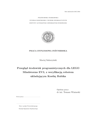 Rok akademicki 2015/2016 POLITECHNIKA WARSZAWSKA WYDZIAŁ ELEKTRONIKI I TECHNIK INFORMACYJNYCH INSTYTUT AUTOMATYKI I INFORMATYKI STOSOWANEJ PRACA DYPLOMOWA INŻYNIERSKA Maciej Safarzyński Przegląd środowisk programistycznych dla LEGO Mindstorms EV3, z weryfikacją robotem układającym Kostkę Rubika Opiekun pracy: dr inż. Tomasz Winiarski Ocena pracy: . . . . . . . . . . . . . . . . . . . . . . . . . . . . ......................................... Data i podpis Przewodniczącego Komisji Egzaminu Dyplomowego 2 Streszczenie Celem pracy był przegląd różnych środowisk programistycznych dla LEGO Mindstorms EV3. Przegląd miał charakter praktyczny, bowiem opierał się na stworzeniu programu robota zbudowanego z LEGO Mindstorms. Robot miał za zadanie układać kostkę Rubika. Zadanie to zostało zrealizowane, poprzez napisanie trzech programów w środowiskach, ROBOTC, ev3dev oraz Matlab. Wszystkie trzy programy pomimo realizacji w różnych językach programistycznych łączy ta sama funkcjonalność. Słowa kluczowe: Mindstorms EV3, ROBOTC, Matlab, ev3dev, Kostka Rubika. Abstract Title: Overview of programming environments for LEGO Mindstorms EV3, verified by Rubik’s Cube solving robot. The aim of this thesis was an overview of different programming environments for LEGO Mindstorms EV3. The overview had a practical nature, because it was based on the creation of a program for the robot built with LEGO Mindstorms. Robot built with LEGO had the task of solving Rubik’s cube. This task was accomplished by writing three programs in environments, ROBOTC, ev3dev and Matlab. All three programs despite the implementation in different programming languages share the same functionality. Keywords: Mindstorms EV3, ROBOTC, Matlab, ev3dev, Rubik’s cube. 4 Spis treści 1 Wstęp 7 1.1 Wprowadzenie . . . . . . . . . . . . . . . . . . . . . . . . . . . . . . . 7 1.2 Motywacja . . . . . . . . . . . . . . . . . . . . . . . . . . . . . . . . . 9 1.3 Cel pracy . . . . . . . . . . . . . . . . . . . . . . . . . . . . . . . . . 10 1.4 Struktura pracy . . . . . . . . . . . . . . . . . . . . . . . . . . . . . . 11 2 Wykorzystane technologie 2.1 13 Wykorzystany sprzęt . . . . . . . . . . . . . . . . . . . . . . . . . . . 13 2.1.1 LEGO Mindstorms EV3 Education Core Set . . . . . . . . . . 13 2.1.2 Kostka Rubika . . . . . . . . . . . . . . . . . . . . . . . . . . 16 2.2 Wykorzystane algorytmy . . . . . . . . . . . . . . . . . . . . . . . . . 17 2.3 Wykorzystane oprogramowanie . . . . . . . . . . . . . . . . . . . . . 17 2.3.1 ROBOTC . . . . . . . . . . . . . . . . . . . . . . . . . . . . . 17 2.3.2 Matlab . . . . . . . . . . . . . . . . . . . . . . . . . . . . . . . 19 2.3.3 ev3dev . . . . . . . . . . . . . . . . . . . . . . . . . . . . . . . 20 3 Projekt systemu 23 3.1 Przebieg zadania . . . . . . . . . . . . . . . . . . . . . . . . . . . . . 23 3.2 Założenia projektu . . . . . . . . . . . . . . . . . . . . . . . . . . . . 27 4 Realizacja 4.1 31 Implementacja w środowisku ROBOTC . . . . . . . . . . . . . . . . . 31 4.1.1 Główna pętla programu - plik “main“ . . . . . . . . . . . . . . 31 4.1.2 Moduł zmiennych globalnych - plik “globals“ . . . . . . . . . . 32 4.1.3 Moduł manipulacji - plik “manipulate“ . . . . . . . . . . . . . 32 4.1.4 Moduł kalibracji - plik “calibrate“ . . . . . . . . . . . . . . . . 33 4.1.5 Moduł wyświetlania - plik “display“ . . . . . . . . . . . . . . . 33 4.1.6 Moduł skanowania - plik “scan_cube“ . . . . . . . . . . . . . . 33 4.1.7 Moduł rozwiązywania - plik “solve“ . . . . . . . . . . . . . . . 33 4.1.8 Moduł skanuj i rozwiąż - plik “scan_and_solve“ . . . . . . . . 34 5 6 SPIS TREŚCI 4.2 Próba implementacji w środowisku Matlab . . . . . . . . . . . . . . . 34 4.3 Implementacja w systemie ev3dev . . . . . . . . . . . . . . . . . . . . 35 4.3.1 Moduł zmiennych globalnych - plik “globals“ . . . . . . . . . . 35 4.3.2 Moduł manipulacji - klasa “manipulate“ 4.3.3 Moduł kalibracji - klasa “calibrate“ . . . . . . . . . . . . . . . 36 4.3.4 Moduł wyświetlania - klasa “display“ . . . . . . . . . . . . . . 36 4.3.5 Moduł skanowania - klasa “scan_cube“ . . . . . . . . . . . . . 37 4.3.6 Moduł rozwiązywania - klasa “solver“ . . . . . . . . . . . . . . 37 4.3.7 Moduł skanuj i rozwiąż - klasa “scan_and_solve“ . . . . . . . 37 5 Podsumowanie . . . . . . . . . . . . 36 39 5.1 Wyniki analizy porównawczej . . . . . . . . . . . . . . . . . . . . . . 39 5.2 Wnioski . . . . . . . . . . . . . . . . . . . . . . . . . . . . . . . . . . 41 5.2.1 Charakterystyka projektów dla środowiska ROBOTC . . . . . 41 5.2.2 Charakterystyka projektów dla środowiska ev3dev . . . . . . . 41 5.2.3 Charakterystyka projektów dla środowiska Matlab . . . . . . . 42 5.2.4 Wniosek ogólny . . . . . . . . . . . . . . . . . . . . . . . . . . 42 Bibliografia 45 Rozdział 1 Wstęp Rozdział ten zawiera wprowadzenie do tematyki pracy (sekcja 1.1), motywację autora do napisania pracy (sekcja 1.2), cel pracy (sekcja 1.3) oraz opisuje jej strukturę (sekcja 1.4). 1.1 Wprowadzenie Praca ta jest ściśle związana z zagadnieniem robotyki. W celu właściwego odbioru pracy warto na wstępie wyjaśnić znaczenie terminu “robotyka“, a najłatwiej to zrobić zaczynając od definicji słowa “robot“. Według definicji wprowadzonej w 1979 roku przez Robotics Industries Association, “robot“ to: “Programowalny, wielofunkcyjny manipulator zaprojektowany do przenoszenia materiałów, części, narzędzi lub specjalizowanych urządzeń poprzez różne programowalne ruchy, w celu realizacji różnorodnych zadań“. [3] Natomiast szersze pojęcie “robotyki“ dr inż. Wojciech Szynkiewicz tłumaczy: “Robotyka zajmuje się projektowaniem, budową, badaniem i wykorzystaniem robotów“. [11] Robotyka jest jedną z najszybciej rozwijających się technologii dzisiejszych czasów. Zakres jej zastosowań jest coraz większy, a ilość d