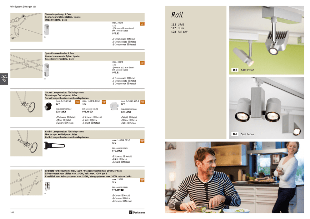 Wire Systems | Halogen 12V Rail Stromeinspeisung, 1 Paar Connecteur d‘alimentation, 1 paire stroomvoeding, 1 set max. 300 W 12 V 330 mm ⌀12 mm 6 mm² Halogen 12V EAN 4000870 972830 972.83 2x 162 URail 192 ULine 198 Rail 12 V f Chrom matt m Metall f Chrome mate m Métal f Chroom mat m Metaal Spice Kreuzverbinder, 1 Paar Connecteur en croix Spice, 1 paire Spice kruisverbinding, 1 set max. 300 W 12 V 340 mm ⌀12 mm 6 mm² Halogen 12V EAN 4000870 972816 972.81 Socket Lampenhalter, für Seilsysteme Tête de spot Socket pour câbles Socket lampenhouder, voor kabelsystemen Halogen max. 1×35 W, G4 max. 1×50 W, GX5,3 12V 12 V 12 V Halogen 12V max. 1×50 W, GX5,3 12 V EAN 4000870 978412 EAN 4000870 978450 EAN 4000870 978443 978.41¥ 978.45¥ 978.44¥ f Schwarz m Metall f Noir m Métal f Zwart m Metaal f Schwarz m Metall f Noir m Métal f Zwart m Metaal f Weiß m Metall f Blanc m Métal f Wit m Metaal 167 Spot Tecno Halogen 12V Kolibri Lampenhalter, für Seilsysteme Tête de spot Kolibri pour câbles Kolibri lampenhouder, voor kabelsystemen max. 1×50 W, GX5,3 12 V Halogen 12V EAN 4000870 975176 975.17¥ f Schwarz m Metall f Noir m Métal f Zwart m Metaal Seilklotz für Seilsysteme max. 150W / Stangensysteme max. 300W 2er Pack Sabot contact pour câbles max. 150W / rails max. 300W par 2 Kabelblok voor kabelsystemen max. 150W / stangsystemen max. 300W set van 2 stks max. 150 W 12 V EAN 4000870 978191 978.019¥ 160 Spot Vision f Chrom matt m Metall f Chrome mate m Métal f Chroom mat m Metaal 2x 2x 163 f Chrom m Metall f Chrome m Métal f Chroom m Metaal Halogen 12V