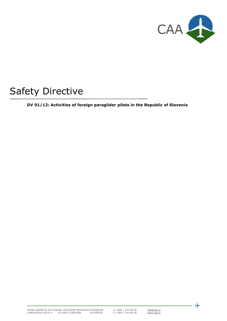 Safety Directive DV 01/12: Activities of foreign paraglider pilots in the Republic of Slovenia JAVNA AGENCIJA ZA CIVILNO LETALSTVO REPUBLIKE SLOVENIJE LANGUSOVA ULICA 4 SI-1000 LJUBLJANA SLOVENIJA T:+386 1 244 66 00 F:+386 1 244 66 99 [email protected] www.caa.si 1. Paraglider and hang glider pilots who are not nationals of the Republic of Slovenia and who are not holders of a licence issued by the competent aviation authority of the Republic of Slovenia, who fly independently in the airspace of the Republic of Slovenia shall hold, in addition to the national licence, which proves his or her competence to fly the aircraft, an IPPI Card with a Safe/Para Pro Stage 4 or 5 rating issued by the International Air Sports Federation (FAI), which proves international competence of the pilot of an aircraft. 2. Flight instructors who are not nationals of the Republic of Slovenia and who are holders of a foreign paragliding and hang gliding instructor certificate shall obtain a special authorisation and instructions from the Civil Aviation Agency of the Republic of Slovenia to perform activity within the Slovene territory. 3. Paraglider and hang glider pilots who are holders of a foreign licence, and who are not holders of an IPPI Card with a Safe/Para Pro Stage 4 or 5 rating, or who are involved in training, shall fly under supervision of a flight instructor, as provided in Paragraph 2 of the Safety Directive. 4. Foreign pilots participating in cross-country flying competitions, regardless of the organizer of the competition and the country organizing the event, within the Slovene territory, shall hold a national licence and have to comply with the requirements of the IPPI Safe/Para Pro Stage 5, implied by Paragrah 1 of the Safety Directive. II. Commentary: Paragraph 1 The Regulation on hang gliding and paragliding (Official Gazette of RS, No. 13/1999) (hereafter the Regulation) in Article 33, Paragraph 1, stipulates: »In the Republic of Slovenia, aircraft may be operated by foreign pilots who hold a valid licence issued by a foreign country or its competent Authority, and a Sporting Licence (FAI) or the International Pilot Proficiency Identification Card (IPPI), issued by The International Air Sports Federation (FAI).« According to the cited provision of the Regulation, foreigners flying within the territory of the Republic of Slovenia have to satisfy two requirements. Firstly, they have to hold a licence issued by the competent Authority of a foreign country. Secondly, they have to be holders of a Sporting Licence (FAI) or the International Pilot Proficiency Identification Card (IPPI), issued by the International Air Sports Federation (hereafter FAI). A Sporting Licence, issued by FAI at the request of a pilot, is not a proof of the pilot's competence to fly a paraglider or hang glider because it is obtained solely on request of the pilot and against payment. For this reason, the IPPI card, issued in compliance with requirements of FAI, is the most appropriate means of proving the experience and skill of a pilot at international level. An IPPI card is issued by a competent national organisation which is a member of FAI, or any other approved organisation on the basis of experience of the holder of a national licence. With regard to the fact, that competence and skills of a pilot who did not perform the entire training in accordance with the directive, and the fact that some pilot are not 2 od 3 familiar with flying technique and conditions that are characteristic of the Slovene territory, especially orographic and microclimatic conditions of the north and northwest Slovenia, the most objective method of verifying the competence of a pilot is to check the rating on the IPPI card, issued by a competent national organisation which is a member of FAI. With regard to the above statements, an IPPI Card with a Safe/Para Pro Stage 4 or 5 rating is required for pilots who fly independently in the airspace of the Republic of Slovenia. As stipulated in the prescribed international paragliding standards, a pilot who reached an IPPI stage 4 rating is qualified to fly in thermal conditions or engage in thermal soaring. A pilot who reached an IPPI stage 5 is qualified to perform cross country flights. Paragraph 2 The Regulation on hang gliding and paragliding (Official Gazette of RS, No. 13/1999) (hereafter the Regulation) in Article 33, Paragraph 2, stipulates: »Foreign flight instructors may give flying lessons in the Republic of Slovenia on condition that that they obtain a special permission from the Agency.« With regard to the fact that the Civil Aviation Agency of the Republic of Slovenia became operational on 1 May 2011 (hereafter: the Agency) and took up surveillance and regulatory professional tasks from the field of civil aviation in the territory of the Republic of Slovenia, foreign citizens who hold a foreign licence with a paragliding and hang gliding instructor certificate must obtain the approval and instructions from the Agency. The Agency may or may not approve the request for the provision of training conducted by a foreign instructor. In addition, the Agency or an appointed, qualified person informs the applicant about the characteristics of flying within the Slovene territory, rules of the air, restrictions and take-off points suitable for the training of pilots. 3 od 3