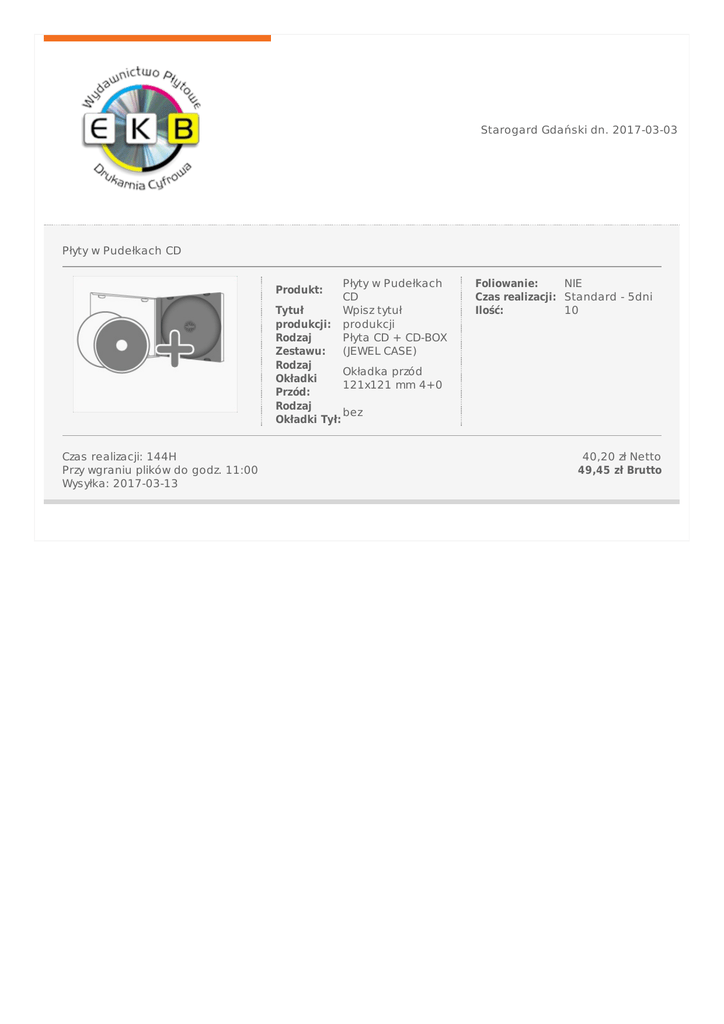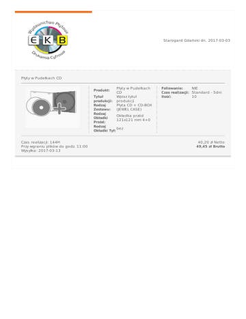 StarogardGdańskidn.2017-03-03 PłytywPudełkachCD Produkt: PłytywPudełkach CD Wpisztytuł produkcji PłytaCD+CD-BOX (JEWELCASE) Tytuł produkcji: Rodzaj Zestawu: Rodzaj Okładkaprzód Okładki 121x121mm4+0 Przód: Rodzaj bez OkładkiTył: Czasrealizacji:144H Przywgraniuplikówdogodz.11:00 Wysyłka:2017-03-13 Foliowanie: NIE Czasrealizacji: Standard-5dni Ilość: 10 40,20złNetto 49,45złBrutto