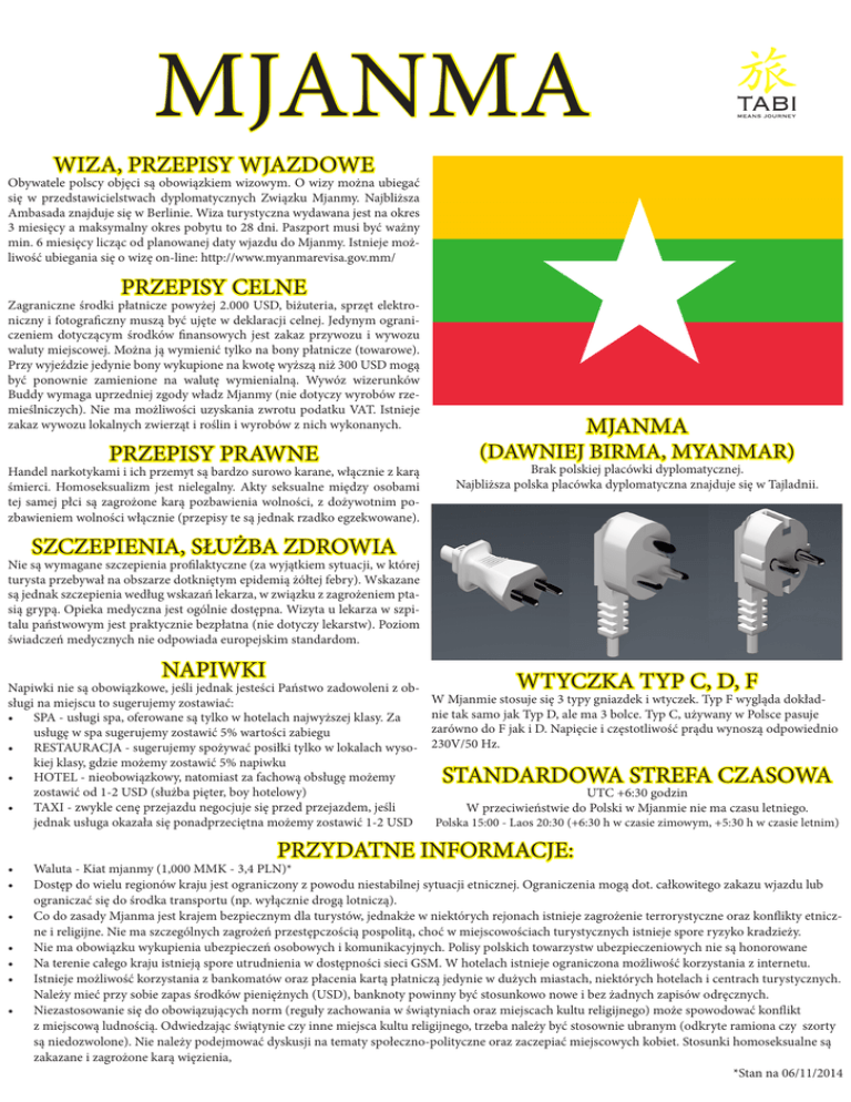 MJANMA WIZA, PRZEPISY WJAZDOWE Obywatele polscy objęci są obowiązkiem wizowym. O wizy można ubiegać się w przedstawicielstwach dyplomatycznych Związku Mjanmy. Najbliższa Ambasada znajduje się w Berlinie. Wiza turystyczna wydawana jest na okres 3 miesięcy a maksymalny okres pobytu to 28 dni. Paszport musi być ważny min. 6 miesięcy licząc od planowanej daty wjazdu do Mjanmy. Istnieje możliwość ubiegania się o wizę on-line: http://www.myanmarevisa.gov.mm/ PRZEPISY CELNE Zagraniczne środki płatnicze powyżej 2.000 USD, biżuteria, sprzęt elektroniczny i fotograficzny muszą być ujęte w deklaracji celnej. Jedynym ograniczeniem dotyczącym środków finansowych jest zakaz przywozu i wywozu waluty miejscowej. Można ją wymienić tylko na bony płatnicze (towarowe). Przy wyjeździe jedynie bony wykupione na kwotę wyższą niż 300 USD mogą być ponownie zamienione na walutę wymienialną. Wywóz wizerunków Buddy wymaga uprzedniej zgody władz Mjanmy (nie dotyczy wyrobów rzemieślniczych). Nie ma możliwości uzyskania zwrotu podatku VAT. Istnieje zakaz wywozu lokalnych zwierząt i roślin i wyrobów z nich wykonanych. PRZEPISY PRAWNE Handel narkotykami i ich przemyt są bardzo surowo karane, włącznie z karą śmierci. Homoseksualizm jest nielegalny. Akty seksualne między osobami tej samej płci są zagrożone karą pozbawienia wolności, z dożywotnim pozbawieniem wolności włącznie (przepisy te są jednak rzadko egzekwowane). MJANMA (DAWNIEJ BIRMA, MYANMAR) Brak polskiej placówki dyplomatycznej. Najbliższa polska placówka dyplomatyczna znajduje się w Tajladnii. SZCZEPIENIA, SŁUŻBA ZDROWIA Nie są wymagane szczepienia profilaktyczne (za wyjątkiem sytuacji, w której turysta przebywał na obszarze dotkniętym epidemią żółtej febry). Wskazane są jednak szczepienia według wskazań lekarza, w związku z zagrożeniem ptasią grypą. Opieka medyczna jest ogólnie dostępna. Wizyta u lekarza w szpitalu państwowym jest praktycznie bezpłatna (nie dotyczy lekarstw). Poziom świadczeń medycznych nie odpowiada europejskim standardom. NAPIWKI Napiwki nie są obowiązkowe, jeśli jednak jesteści Państwo zadowoleni z obsługi na miejscu to sugerujemy zostawiać: • SPA - usługi spa, oferowane są tylko w hotelach najwyższej klasy. Za usługę w spa sugerujemy zostawić 5% wartości zabiegu • RESTAURACJA - sugerujemy spożywać posiłki tylko w lokalach wysokiej klasy, gdzie możemy zostawić 5% napiwku • HOTEL - nieobowiązkowy, natomiast za fachową obsługę możemy zostawić od 1-2 USD (służba pięter, boy hotelowy) • TAXI - zwykle cenę przejazdu negocjuje się przed przejazdem, jeśli jednak usługa okazała się ponadprzeciętna możemy zostawić 1-2 USD • • • • • • • WTYCZKA TYP C, D, F W Mjanmie stosuje się 3 typy gniazdek i wtyczek. Typ F wygląda dokładnie tak samo jak Typ D, ale ma 3 bolce. Typ C, używany w Polsce pasuje zarówno do F jak i D. Napięcie i częstotliwość prądu wynoszą odpowiednio 230V/50 Hz. STANDARDOWA STREFA CZASOWA UTC +6:30 godzin W przeciwieństwie do Polski w Mjanmie nie ma czasu letniego. Polska 15:00 - Laos 20:30 (+6:30 h w czasie zimowym, +5:30 h w czasie letnim) PRZYDATNE INFORMACJE: Waluta - Kiat mjanmy (1,000 MMK - 3,4 PLN)* Dostęp do wielu regionów kraju jest ograniczony z powodu niestabilnej sytuacji etnicznej. Ograniczenia mogą dot. całkowitego zakazu wjazdu lub ograniczać się do środka transportu (np. wyłącznie drogą lotniczą). Co do zasady Mjanma jest krajem bezpiecznym dla turystów, jednakże w niektórych rejonach istnieje zagrożenie terrorystyczne oraz konflikty etniczne i religijne. Nie ma szczególnych zagrożeń przestępczością pospolitą, choć w miejscowościach turystycznych istnieje spore ryzyko kradzieży. Nie ma obowiązku wykupienia ubezpieczeń osobowych i komunikacyjnych. Polisy polskich towarzystw ubezpieczeniowych nie są honorowane Na terenie całego kraju istnieją spore utrudnienia w dostępności sieci GSM. W hotelach istnieje ograniczona możliwość korzystania z internetu. Istnieje możliwość korzystania z bankomatów oraz płacenia kartą płatniczą jedynie w dużych miastach, niektórych hotelach i centrach turystycznych. Należy mieć przy sobie zapas środków pieniężnych (USD), banknoty powinny być stosunkowo nowe i bez żadnych zapisów odręcznych. Niezastosowanie się do obowiązujących norm (reguły zachowania w świątyniach oraz miejscach kultu religijnego) może spowodować konflikt z miejscową ludnością. Odwiedzając świątynie czy inne miejsca kultu religijnego, trzeba należy być stosownie ubranym (odkryte ramiona czy szorty są niedozwolone). Nie należy podejmować dyskusji na tematy społeczno-polityczne oraz zaczepiać miejscowych kobiet. Stosunki homoseksualne są zakazane i zagrożone karą więzienia, *Stan na 06/11/2014