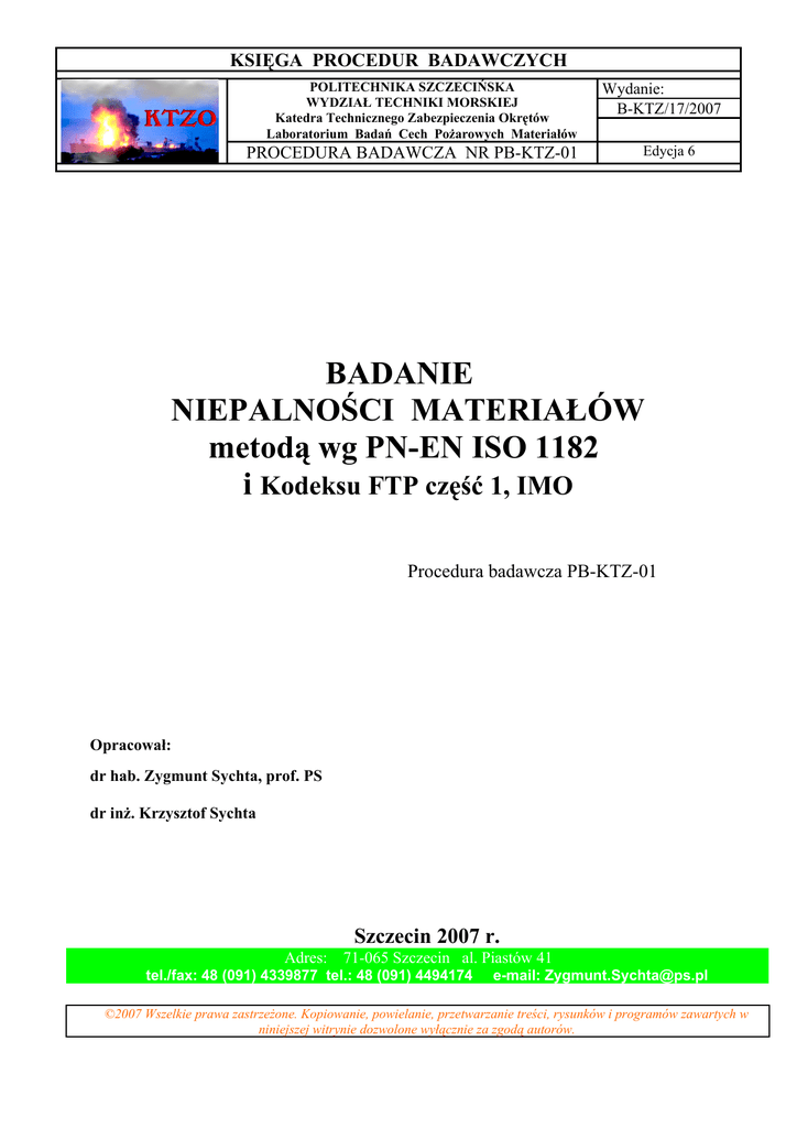 KSIĘGA PROCEDUR BADAWCZYCH POLITECHNIKA SZCZECIŃSKA WYDZIAŁ TECHNIKI MORSKIEJ Katedra Technicznego Zabezpieczenia Okrętów Laboratorium Badań Cech Pożarowych Materiałów PROCEDURA BADAWCZA NR PB-KTZ-01 Wydanie: B-KTZ/17/2007 Edycja 6 BADANIE NIEPALNOŚCI MATERIAŁÓW metodą wg PN-EN ISO 1182 i Kodeksu FTP część 1, IMO Procedura badawcza PB-KTZ-01 Opracował: dr hab. Zygmunt Sychta, prof. PS dr inż. Krzysztof Sychta Szczecin 2007 r. Adres: 71-065 Szczecin al. Piastów 41 tel./fax: 48 (091) 4339877 tel.: 48 (091) 4494174 e-mail: [email protected] ©2007 Wszelkie prawa zastrzeżone. Kopiowanie, powielanie, przetwarzanie treści, rysunków i programów zawartych w niniejszej witrynie dozwolone wyłącznie za zgodą autorów. Spis treści 1. 2. 3. 4. 5. 6. WPROWADZENIE 1.1. Zasady podziału materiałów na palne i niepalne 1.2. Norma ISO 1182 1.2.1. Polska norma 1.2.2. Rez. MSC 61(67) 1.3. Komentarz do PN-B-02862 1.3.1. Podstawa opracowania metodyki badania 1.3.2. Materiały wielowarstwowe 1.2.3. Materiały termicznie niestabilne 1.3.4. Wykluczenie samonagrzewania 1.4. Zakres stosowania normy METODA BADANIA I KLASYFIKACJA MATERIAŁÓW 2.1. Metoda badania palności materiałów 2.2. Klasyfikacja materiałów budowlanych wg PN-B-02862 2.3. Klasyfikacja materiałów okrętowych wg MSC 61(67) 2.4. Klasy materiałów wyrobów wg EN 13501-1 OPIS STANOWISKA 3.1. Wyposażenie stanowiska 3.2. Piec stanowiska 3.3. Układ do mocowania i wprowadzania próbek 3.4. Zasilanie pieca 3.5. Układ kontrolno-pomiarowy 3.5.1. Termopary i ich rozmieszczenie 3.5.2. Czujnik termiczny 3.5.3. Układ pomiaru temperatury WYMAGANIA OGÓLNE PRZEPROWADZENIA BADAŃ 4.1. Warunki badania 4.2. Przygotowanie próbek 4.3. Sezonowanie próbek 4.4. Metodyka badań URUCHOMIENIE STANOWISK 5.1. Pomieszczenie do przeprowadzenia badań 5.2. Podłączenia podzespołów i ich uruchomienie 5.3. Parametry układu pomiarowego stanowiska 5.4. Parametry wzorcowania 5.4.1. Wzorcowanie kanałów pomiarowych 5.4.2. Charakterystyka rozkładu temperatury wzdłuż osi pieca 5.5. Temperatura ściany pieca 5.6. Zachowanie parametrów 5.7. Kontrola okresowa PRZEPROWADZENIE BADAŃ 2 Strona 4 4 4 4 5 5 5 5 5 6 6 7 7 7 8 8 10 10 10 13 14 14 14 16 16 18 18 18 18 19 20 20 20 22 23 23 26 27 30 30 31 7. 9. 6.1. Parametry pomiaru 6.2. Pomiar 6.2.1. Dane początkowe pomiaru 6.2.2. Stabilizacja warunków początkowych stanowiska 6.2.3. Pomiar parametrów odniesienia 6.2.4. Pomiary zasadnicze 6.3. Zakończenie programu 6.4. Wyłączenie stanowiska OPRACOWANIE WYNIKÓW 7.1. Obliczenia 7.2. Sprawozdanie z badań ZAŁĄCZNIK - MIĘDZYNARODOWY KODEKS STOSOWANIA PROCEDUR PRÓB OGNIOWYCH (KODEKS FTP) 3 31 32 32 32 33 34 37 37 38 38 38 40 1. WPROWADZENIE 1.1. Zasady podziału materiałów na palne i niepalne Z punktu widzenia stwarzanego przez materiały zagrożenia pożarowego materiały umownie dzielimy na niepalne i palne. Materiałami niepalnymi (definicja międzynarodowa) przyjęto umownie nazywać materiały, które podgrzane do temperatury 750 oC nie palą się i nie wydzielają gazów palnych w ilości dostatecznej do ich zapalenia się oraz nie wydzielają ciepła powodującego wzrost temperatury pieca. Materiały nie spełniające tego warunku zalicza się do grupy materiałów palnych. Mimo wspólnej międzynarodowej definicji materiału niepalnego istnieje wiele metod badań i kryteriów oceny niepalności materiału. Do charakterystycznych i najbardziej rozpowszechnionych należy metoda badań niepalności materiałów wg ISO 1182, którą, z pewnymi modyfikacjami, przyjęto w okrętownictwie oraz w polskim budownictwie lądowym. 1.2. Norma ISO 1182 ISO 1182-1990:2002 Fire test. Building materials. Non-combustibility test Przedmiotem normy jest metoda badania, na podstawie której ocenia się właściwości palne materiałów budowlanych w umownych warunkach rozkładu termicznego i spalania. Niniejszą metodą badania i jej wyniki zaleca się stosować jedynie do opisu palności lub niepalności materiałów, w odniesieniu do ciepła wydzielanego w warunkach laboratoryjnych. Nie powinna być natomiast stosowana do opisu lub oceny zagrożenia pożarowego powodowanego przez materiał w warunkach rzeczywistego pożaru lub jako jedyna podstawa, na której może być oparta ta ocena. Przewiduje się, że metoda ta będzie stosowana głównie dla potrzeb budownictwa lądowego i przemysłu okrętowego. 1.2.1. Polska norma „Ochrona przeciwpożarowa budynków. Metoda badania niepalności materiałów budowlanych ”. Zgłoszona przez Ministerstwo Gospodarki Przestrzennej i Budownictwa. Ustanowiona przez Polski Komitet Normalizacji dnia 29 grudnia 1993 r. Jako norma obowiązująca od dnia 1 lipca 1994 r. (Dz. Norm. i Miar Uchwała nr 14/1993, poz. 31). Tekst Polskiej Normy jest tłumaczeniem normy ISO 1182, 3 wydanie z 1990 r. z następującymi zmianami: - nie wprowadzono do normy wzoru protokołu badań (pominięto załącznik C normy ISO), 4 - wprowadzono do stanowiącej części normy wymagania dotyczące oceny wyników badań opracowane na podstawie zalecenia normy ISO znajdującego się w Załączniku A i tym samym pominięto Załącznik A, - wyjaśnienia znajdujące się w komentarzu stanowiącym Załącznik B do normy ISO włączono do Informacji dodatkowych Polskiej Normy, - zmieniono numerację i tytuły punktów w stosunku do normy ISO. 1.2.2. Rez. MSC 61(67) Stosowaną w okrętownictwie metodę badań wg Rez. A. 472 XII IMO "Improved recommendation on test method for qualifying marine construction materials as non-comustibility" zastąpiono (Rez. MSC 61(67)) metodą badań niepalności materiałów wg ISO 1182 zmieniając w tej ostatniej kryteria klasyfikacji materiałów. 1.3. Komentarz do polskiej normy 1.3.1. Podstawa opracowania metodyki badania Metoda badania niepalności została opracowana dla materiałów wydzielających niewielkie ilość ciepła i palących się płomieniem wówczas, gdy są podgrzane do temperatury zbliżonej do 7