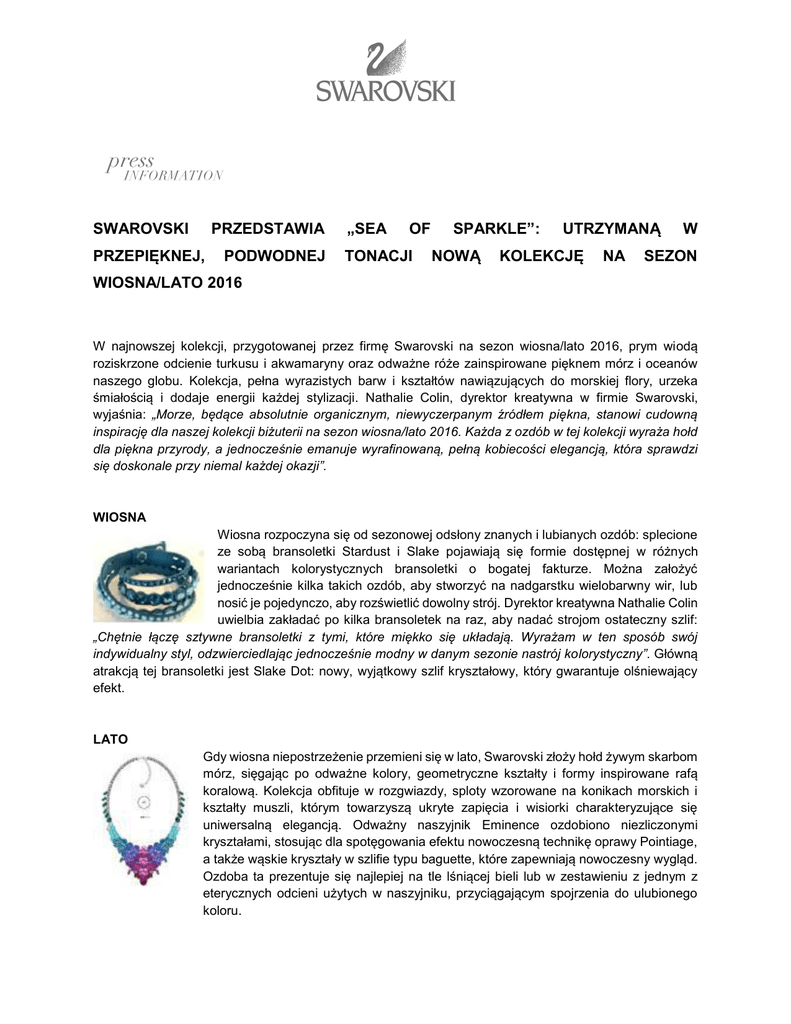 PRZEDSTAWIA SWAROVSKI PRZEPIĘKNEJ, PODWODNEJ „SEA OF TONACJI SPARKLE”: NOWĄ UTRZYMANĄ KOLEKCJĘ NA W SEZON WIOSNA/LATO 2016 W najnowszej kolekcji, przygotowanej przez firmę Swarovski na sezon wiosna/lato 2016, prym wiodą roziskrzone odcienie turkusu i akwamaryny oraz odważne róże zainspirowane pięknem mórz i oceanów naszego globu. Kolekcja, pełna wyrazistych barw i kształtów nawiązujących do morskiej flory, urzeka śmiałością i dodaje energii każdej stylizacji. Nathalie Colin, dyrektor kreatywna w firmie Swarovski, wyjaśnia: „Morze, będące absolutnie organicznym, niewyczerpanym źródłem piękna, stanowi cudowną inspirację dla naszej kolekcji biżuterii na sezon wiosna/lato 2016. Każda z ozdób w tej kolekcji wyraża hołd dla piękna przyrody, a jednocześnie emanuje wyrafinowaną, pełną kobiecości elegancją, która sprawdzi się doskonale przy niemal każdej okazji”. WIOSNA Wiosna rozpoczyna się od sezonowej odsłony znanych i lubianych ozdób: splecione ze sobą bransoletki Stardust i Slake pojawiają się formie dostępnej w różnych wariantach kolorystycznych bransoletki o bogatej fakturze. Można założyć jednocześnie kilka takich ozdób, aby stworzyć na nadgarstku wielobarwny wir, lub nosić je pojedynczo, aby rozświetlić dowolny strój. Dyrektor kreatywna Nathalie Colin uwielbia zakładać po kilka bransoletek na raz, aby nadać strojom ostateczny szlif: „Chętnie łączę sztywne bransoletki z tymi, które miękko się układają. Wyrażam w ten sposób swój indywidualny styl, odzwierciedlając jednocześnie modny w danym sezonie nastrój kolorystyczny”. Główną atrakcją tej bransoletki jest Slake Dot: nowy, wyjątkowy szlif kryształowy, który gwarantuje olśniewający efekt. LATO Gdy wiosna niepostrzeżenie przemieni się w lato, Swarovski złoży hołd żywym skarbom mórz, sięgając po odważne kolory, geometryczne kształty i formy inspirowane rafą koralową. Kolekcja obfituje w rozgwiazdy, sploty wzorowane na konikach morskich i kształty muszli, którym towarzyszą ukryte zapięcia i wisiorki charakteryzujące się uniwersalną elegancją. Odważny naszyjnik Eminence ozdobiono niezliczonymi kryształami, stosując dla spotęgowania efektu nowoczesną technikę oprawy Pointiage, a także wąskie kryształy w szlifie typu baguette, które zapewniają nowoczesny wygląd. Ozdoba ta prezentuje się najlepiej na tle lśniącej bieli lub w zestawieniu z jednym z eterycznych odcieni użytych w naszyjniku, przyciągającym spojrzenia do ulubionego koloru. Nathalie dodaje, że dla uzyskania niepowtarzalnego efektu łączyć delikatne fasony z większymi formami: „W tym sezonie polecam połączenie masywnego pierścionka z subtelną obrączką ozdobioną kryształami w oprawie pave, gwarantujące fantastyczny kontrast. Można też założyć kilka pierścionków idealnie dobranych do olśniewających barw naszyjnika”. Aby wykreować naprawdę wyrafinowaną stylizację, naszyjnik warto zestawić z oryginalnym pierścionkiem koktajlowym Euphory, który jest przykładem kunsztu jubilerskiego najwyższej próby. Ten pierścionek na metalowej bazie ozdobionej odcieniami Amethyst, Emerald i Siam ma pełen przepychu, nowoczesny charakter. Można go łatwo dostosować do dowolnej okazji, czy to będzie dzień na mieście, czy eleganckie wieczorne przyjęcie. IDEALNY PREZENT Oprócz nowej kolekcji na sezon wiosna/lato 2016, firma Swarovski jak zwykle oferuje idealną biżuterię na wyjątkowe okazje i świąteczne uroczystości. Tegoroczna kolekcja Walentynkowa obejmuje najszerszy jak dotąd asortyment serc, w tym wisiorek Cupid ozdobiony kryształami w oprawie pave na stonowanym tle w kolorze różowego złota, które nadaje tej ozdobie kobiecy charakter. Inne zestawy upominkowe, takie jak naszyjnik Dear z dwoma sercami, i naszyjnik Exist z symbolem nieskończoności, można nosić warstwowo, dla uzyskania nowoczesnej stylizacji, lub oddzielnie, dla podkreślenia pełnego delikatności romantyzmu. W tym sezonie także wszystkie mamy mogą się spodziewać prezentów z pięknej, inspirowanej perłami kolekcji, która jest wprost stworzona na Dzień Matki. Ozdoby przygotowane na rok 2016 w oparciu o ponadczasową kolekcję Delta w kultowym kształcie litery V zostały unowocześnione poprzez dodanie subtelnych pereł, nadających tej biżuterii lśniący i wytworny wygląd. Krótki i długi naszyjnik na łańcuszku będą pięknym, a zarazem modnym prezentem, który sprawi, że obdarowana mama poczuje się naprawdę wyjątkowo w dniu swojego święta. Nathalie Colin swoje naszyjniki uwielbia nosić w komplecie: „Najchętniej zakładam na szyję po dwie albo trzy wyrafinowane ozdoby, dzięki czemu powstaje swobodny wizerunek odpowiedni na co dzień. Lubię też połączenie krótkiego kolorowego naszyjnika i wisiorka na długim łańcuszku, które zapewnia mi stylowy i modny wygląd”. Oferta Swarovskiego na nadchodzący sezon obejmuje idealne prezenty na każdą okazję, które niezawodnie wzbudzą zachwyt tych, których kochasz. Od delikatnych, roziskrzonych serc po lśniące perły, znajdziesz tu biżuterię, która pozwoli ci przypomnieć wyjątkowej osobie, jak wiele dla ciebie znaczy. Swarovski Firma Swarovski dysponuje zróżnicowaną ofertą produktów cechujących się niezrównaną jakością, kunsztem i kreatywnością. Założona w 1895 roku w Austrii firma Swarovski zajmuje się projektowaniem, produkcją i sprzedażą najwyższej jakości kryształów, kamieni szlachetnych i syntetycznych, a także gotowych wyrobów w postaci biżuterii, akcesoriów i elementów oświetleniowych. Prowadzone już przez piąte pokolenie rodzinne przedsiębiorstwo Swarovski Crystal Business, które świętuje 120-lecie swojego istnienia, działa obecnie na całym świecie, a jego sieć 2560 sklepów obejmuje obszar 170 krajów; firma zatrudnia ponad 25 tys. pracowników, a w 2014 roku osiągnęła przychód rzędu 2,33 miliarda euro. W