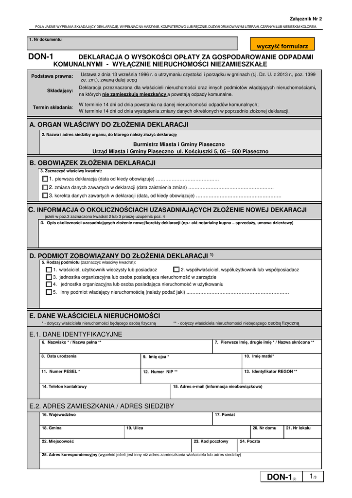 Załącznik Nr 2 POLA JASNE WYPEŁNIA SKŁADAJĄCY DEKLARACJĘ, WYPEŁNIAĆ NA MASZYNIE, KOMPUTEROWO LUB RĘCZNIE, DUŻYMI DRUKOWANYMI LITERAMI, CZARNYM LUB NIEBIESKIM KOLOREM. 1. Nr dokumentu wyczyść formularz DON-1 DEKLARACJA O WYSOKOŚCI OPŁATY ZA GOSPODAROWANIE ODPADAMI KOMUNALNYMI - WYŁĄCZNIE NIERUCHOMOŚCI NIEZAMIESZKAŁE Podstawa prawna: Ustawa z dnia 13 września 1996 r. o utrzymaniu czystości i porządku w gminach (t.j. Dz. U. z 2013 r., poz. 1399 ze. zm.), zwaną dalej ucpg Składający: Deklaracja przeznaczona dla właścicieli nieruchomości oraz innych podmiotów władających nieruchomościami, na których nie zamieszkują mieszkańcy a powstają odpady komunalne. Termin składania: W terminie 14 dni od dnia powstania na danej nieruchomości odpadów komunalnych; W terminie 14 dni od dnia wystąpienia zmiany danych określonych w poprzednio złożonej deklaracji. A. ORGAN WŁAŚCIWY DO ZŁOŻENIA DEKLARACJI 2. Nazwa i adres siedziby organu, do którego należy złożyć deklarację Burmistrz Miasta i Gminy Piaseczno Urząd Miasta i Gminy Piaseczno ul. Kościuszki 5, 05 – 500 Piaseczno B. OBOWIĄZEK ZŁOŻENIA DEKLARACJI 3. Zaznaczyć właściwy kwadrat: 1. pierwsza deklaracja (data od kiedy obowiązuje) …………………………………. 2. zmiana danych zawartych w deklaracji (data zaistnienia zmian) ……………………………………………… 3. korekta danych zawartych w deklaracji (data, od kiedy obowiązuje) ……………………………………………… C. INFORMACJA O OKOLICZNOŚCIACH UZASADNIAJĄCYCH ZŁOŻENIE NOWEJ DEKARACJI jeżeli w poz.3 zaznaczono kwadrat 2 lub 3 proszę uzupełnić poz. 4 4. Opis okoliczności uzasadniających złożenie nowej/korekty deklaracji (np.: akt notarialny kupna – sprzedaży, umowa dzierżawy) D. PODMIOT ZOBOWIĄZANY DO ZŁOŻENIA DEKLARACJI 1) 5. Rodzaj podmiotu (zaznaczyć właściwy kwadrat): 1. właściciel, użytkownik wieczysty lub posiadacz 2. współwłaściciel, współużytkownik lub współposiadacz 3. jednostka organizacyjna lub osoba posiadająca nieruchomość w zarządzie 4. jednostka organizacyjna lub osoba posiadająca nieruchomość w użytkowaniu 5. inny podmiot władający nieruchomością (należy podać jaki) ..……………………………………………………… E. DANE WŁAŚCICIELA NIERUCHOMOŚCI * - dotyczy właściciela nieruchomości będącego osobą fizyczną ** - dotyczy właściciela nieruchomości niebędącego osobą fizyczną E.1. DANE IDENTYFIKACYJNE 6. Nazwisko * / Nazwa pełna ** 7. Pierwsze Imię, drugie imię * / Nazwa skrócona ** 8. Data urodzenia 9. Imię ojca * 10. Imię matki* 11. Numer PESEL * 12. Numer NIP ** 13. Identyfikator REGON ** 15. Adres e-mail (informacja nieobowiązkowa) 14. Telefon kontaktowy E.2. ADRES ZAMIESZKANIA / ADRES SIEDZIBY 16. Województwo 18. Gmina 22. Miejscowość 17. Powiat 19. Ulica 20. Nr domu 23. Kod pocztowy 21. Nr lokalu 24. Poczta 25. Adres korespondencyjny (wypełnić jeżeli jest inny niż adres zamieszkania właściciela lub adres siedziby) DON-1 (2) 1/3 POLA JASNE WYPEŁNIA SKŁADAJĄCY DEKLARACJĘ, WYPEŁNIAĆ NA MASZYNIE, KOMPUTEROWO LUB RĘCZNIE, DUŻYMI DRUKOWANYMI LITERAMI, CZARNYM LUB NIEBIESKIM KOLOREM. F. ADRES NIERUCHOMOŚCI, DLA KTÓREJ SKŁADANA JEST DEKLARACJA 26. Ulica 27. Nr domu 28. Nr lokalu 30. Miejscowość 31. Kod pocztowy 32 Poczta Adres punktu wywozowego – miejscowość, ulica, nr domu, inne dane identyfikujące lokalizację pojemników 2) 29. Numer ewidencyjny działki 33. G. DANE DO OKREŚLENIA OPŁATY ZA GOSPODAROWANIE ODPADAMI KOMUNALNYMI (nieruchomość, na której prowadzona jest działalność gospodarcza) Oświadczam, że na terenie nieruchomości wskazanej w części F. niniejszej deklaracji odpady komunalne gromadzone są w sposób (zaznaczyć właściwy kwadrat) 3) 34. 1.SELEKTYWNY 2.NIESELEKTYWNY 35. Rodzaj prowadzonej działalności gospodarczej H. WYLICZENIE OPŁATY ZA GOSPODAROWANIE ODPADAMI Rodzaj pojemnika/kontenera pojemnik o objętości do 0,12 m3 pojemnik o objętości 0,24 m3 pojemnik o objętości 1,1 m3 pojemnik o objętości do 2,5 m3 kontener o pojemności 5 m3 kontener o pojemności 7 m3 kontener o pojemności 10 m3 Ilość pojemników/kontenerów Stawka opłaty4) 36. 37. 39. 40. 42. 43. 45. 46. 48. 49. 51. 52. 54. 55. Kwota opłaty 38. …………. zł. 0 41. ………….. zł. 0 44. …………. zł. 0 47. …………. zł. 0 50. …………. zł. 0 53. ………….. zł. 0 56. ………….. zł. 0 I. KWOTA OPŁATY ZA GOSPODAROWANIE ODPADAMI 57. Wysokość opłaty 0 (Łączna kwota opłaty za pojemniki tj, suma poz. 38 i 41 i 44 i 47 i 50 i 53 i 56) J. INFORMACJA O ZAŁĄCZNIKACH (do niniejszej deklaracji dołączono) 58. Liczba i rodzaj załącznika załączniki K. OŚWIADCZENIE I PODPIS SKŁADAJĄCEGO DEKLARACJĘ Oświadczam, że są mi znane przepisy Kodeksu karnego skarbowego o odpowiedzialności za podanie danych niezgodnych z rzeczywistością. 59. Imię 60. Nazwisko 61. Data i miejsce wypełnienia deklaracji (dzień - miesiąc - rok, miejscowość) 62. Podpis (pieczęć) składającego DON-1 (2) 2/3 POLA JASNE WYPEŁNIA SKŁADAJĄCY DEKLARACJĘ, WYPEŁNIAĆ NA MASZYNIE, KOMPUTEROWO LUB RĘCZNIE, DUŻYMI DRUKOWANYMI LITERAMI, CZARNYM LUB NIEBIESKIM KOLOREM. L. ADNOTACJE URZĘDOWE 63. Uwagi 64. Data (dzień - miesiąc - rok) 65. Podpis i pieczęć Pouczenie: 1. Niniejsza deklaracja stanowi podstawę do wystawienia tytułu wykonawczego zgodnie z przepisami ustawy z dnia 17 czerwca 1966r. o postępowaniu egzekucyjnym w administracji (Dz. U. z 2014 r., poz. 1619 ze zm.). 2. Właściciel nieruchomości jest zobowiązany złożyć deklarację o wysokości opłaty za gospodarowanie odpadami komunalnymi w terminie 14 dni od dnia powstania na danej nieruchomości odpadów komunalnych. 3. Obowiązek ponoszenia opłaty za gospodarowanie odpadami komunalnymi powstaje za każdy miesiąc, w którym na danej nieruchomości powstają odpady komunalne. Wyliczon