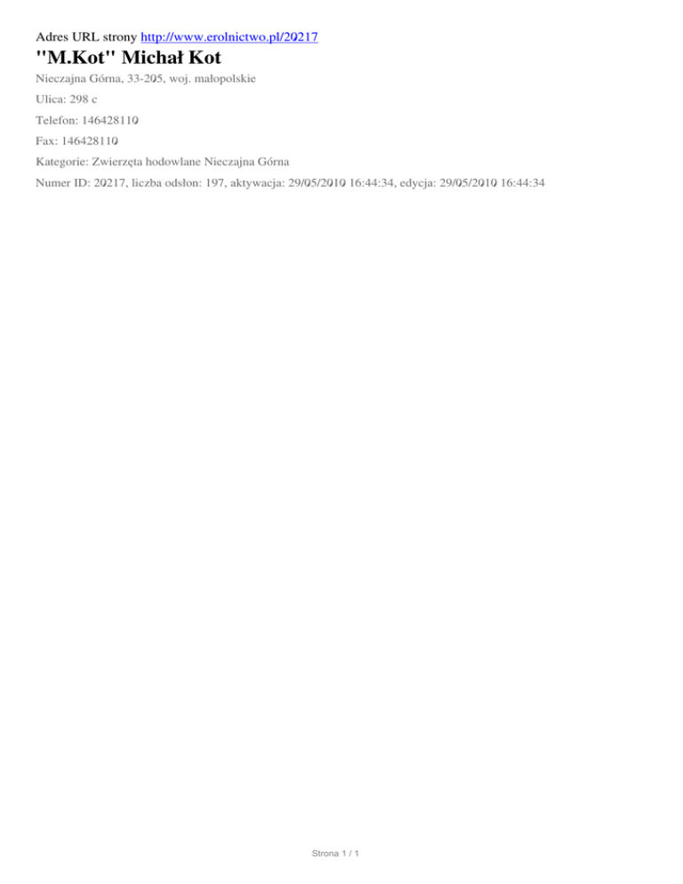 Adres URL strony http://www.erolnictwo.pl/20217 "M.Kot" Michał Kot Nieczajna Górna, 33-205, woj. małopolskie Ulica: 298 c Telefon: 146428110 Fax: 146428110 Kategorie: Zwierzęta hodowlane Nieczajna Górna Numer ID: 20217, liczba odsłon: 197, aktywacja: 29/05/2010 16:44:34, edycja: 29/05/2010 16:44:34 Strona 1 / 1