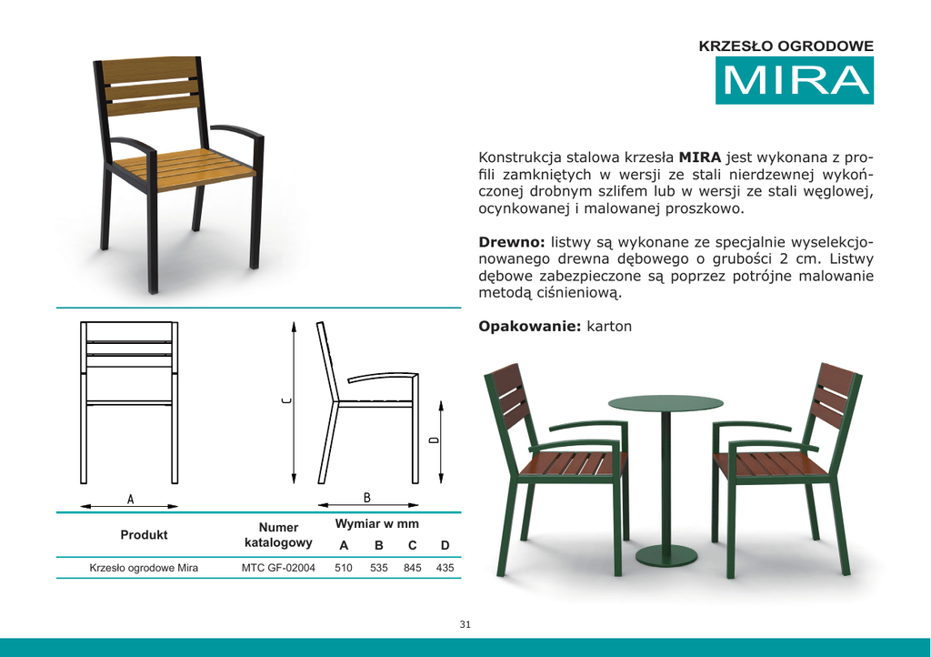 $ % KRZESŁO OGRODOWE .U]HVáRRJURGRZH0DULR,, & MIRA ' Konstrukcja stalowa krzesła MIRA jest wykonana z profili zamkniętych w wersji ze stali nierdzewnej wykończonej drobnym szlifem lub w wersji ze stali węglowej, ocynkowanej i malowanej proszkowo. $ Drewno: listwy są wykonane ze specjalnie wyselekcjonowanego drewna dębowego o grubości 2 cm. Listwy dębowe zabezpieczone są poprzez potrójne malowanie metodą ciśnieniową. % .U]HVáRRJURGRZH0LUD ' & Opakowanie: karton % $ Produkt Numer katalogowy Wymiar w mm A B C D Krzesło ogrodowe Mira MTC GF-02004 510 535 845 435 31 & .U]HVáRRJURGRZH&HVDUH