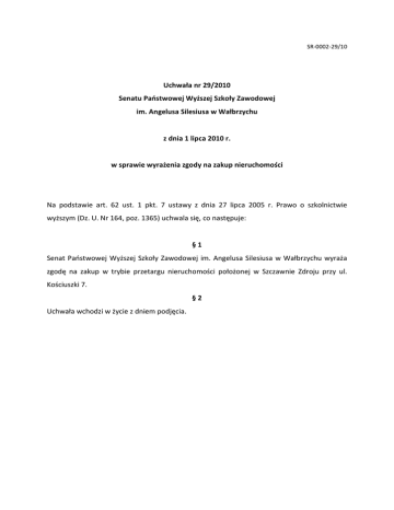 SR-0002-29/10 Uchwała nr 29/2010 Senatu Państwowej Wyższej Szkoły Zawodowej im. Angelusa Silesiusa w Wałbrzychu z dnia 1 lipca 2010 r. w sprawie wyrażenia zgody na zakup nieruchomości Na podstawie art. 62 ust. 1 pkt. 7 ustawy z dnia 27 lipca 2005 r. Prawo o szkolnictwie wyższym (Dz. U. Nr 164, poz. 1365) uchwala się, co następuje: §1 Senat Państwowej Wyższej Szkoły Zawodowej im. Angelusa Silesiusa w Wałbrzychu wyraża zgodę na zakup w trybie przetargu nieruchomości położonej w Szczawnie Zdroju przy ul. Kościuszki 7. §2 Uchwała wchodzi w życie z dniem podjęcia.