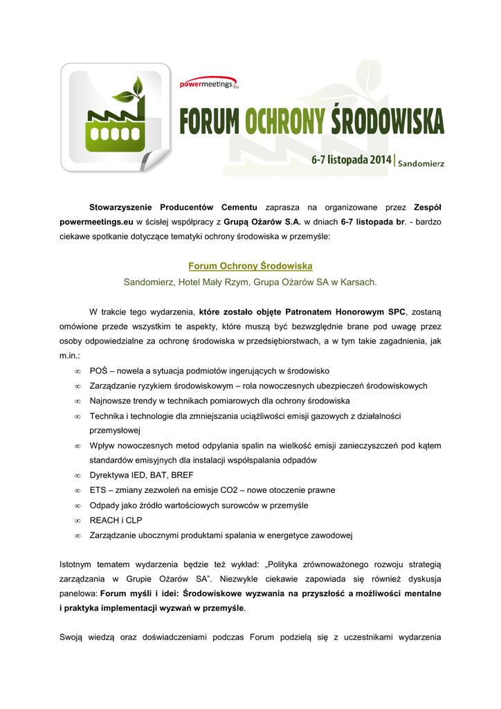 Stowarzyszenie Producentów Cementu zaprasza na organizowane przez Zespół powermeetings.eu w ścisłej współpracy z Grupą Ożarów S.A. w dniach 6-7 listopada br. - bardzo ciekawe spotkanie dotyczące tematyki ochrony środowiska w przemyśle: Forum Ochrony Środowiska Sandomierz, Hotel Mały Rzym, Grupa Ożarów SA w Karsach. W trakcie tego wydarzenia, które zostało objęte Patronatem Honorowym SPC, zostaną omówione przede wszystkim te aspekty, które muszą być bezwzględnie brane pod uwagę przez osoby odpowiedzialne za ochronę środowiska w przedsiębiorstwach, a w tym takie zagadnienia, jak m.in.: • POŚ – nowela a sytuacja podmiotów ingerujących w środowisko • Zarządzanie ryzykiem środowiskowym – rola nowoczesnych ubezpieczeń środowiskowych • Najnowsze trendy w technikach pomiarowych dla ochrony środowiska • Technika i technologie dla zmniejszania uciążliwości emisji gazowych z działalności przemysłowej • Wpływ nowoczesnych metod odpylania spalin na wielkość emisji zanieczyszczeń pod kątem standardów emisyjnych dla instalacji współspalania odpadów • Dyrektywa IED, BAT, BREF • ETS – zmiany zezwoleń na emisje CO2 – nowe otoczenie prawne • Odpady jako źródło wartościowych surowców w przemyśle • REACH i CLP • Zarządzanie ubocznymi produktami spalania w energetyce zawodowej Istotnym tematem wydarzenia będzie też wykład: „Polityka zrównoważonego rozwoju strategią zarządzania w Grupie Ożarów SA”. Niezwykle ciekawie zapowiada się również dyskusja panelowa: Forum myśli i idei: Środowiskowe wyzwania na przyszłość a możliwości mentalne i praktyka implementacji wyzwań w przemyśle. Swoją wiedzą oraz doświadczeniami podczas Forum podzielą się z uczestnikami wydarzenia wieloletni praktycy rynku, w tym Andrzej Ptak, Prezes Zarządu, Dyrektor Generalny, Grupa Ożarów S.A. oraz Jan Deja, Dyrektor Biura, Stowarzyszenie Producentów Cementu, a także tacy Eksperci jak: Bogusława Rutkowska, Dyrektor, Departament Inspekcji i Orzecznictwa, Główny Inspektorat Ochrony Środowiska Małgorzata Janiszewska, Świętokrzyski Wojewódzki Inspektor Ochrony Środowiska Małgorzata Typko, Dyrektor, Departament Ochrony Środowiska, Ministerstwo Środowiska Karolina Ubysz, Radca Prawny, Departament Ochrony Powietrza, Wydział ds. Zarządzania Emisjami Gazów Cieplarnianych, Ministerstwo Środowiska Monika Wasiak-Gromek, Naczelnik Wydziału Krajowego Centrum Informacyjnego ds. REACH i CLP, Departament ds. Substancji i Mieszanin Niebezpiecznych, Biuro do spraw Substancji Chemicznych Mieczysław Kobylarz, Dyrektor Biura Zarządzania Procesami Wytwarzania, Jakością, Środowiskiem i Wsparciem BHP, GDF Suez Energia Polska Marzena Jasińska-Łodyga, Szef Ochrony Środowiska, Grupa Ożarów S.A. Paweł Holnicki-Szulc, Dyrektor Generalny, AIG Marcin Żak, Kierownik Operacyjny, Laboratorium Pomiarów Emisji Wessling Polska Sp. z o.o. Ludomir K. Błeszyński, SIEMENS Industry Software Sp. z o.o. Dariusz Janasz, Starszy Specjalista ds. Marketingu i Sprzedaży, Urządzenia Pomiarowe – Analityka Procesowa, ABB Sp z o.o. Włodzisław Ćwiąkalski, Prezes Zarządu EMIPRO Sp. z o.o. Patryk Weisser, p.o. Dyrektora Oddziału, Instytut Ceramiki i Materiałów Budowlanych, Oddział Inżynierii Procesowej Materiałów Budowlanych w Opolu Joanna Poluszyńska, Kierownik Techniczny, Laboratorium Pomiarów Przemysłowych i Środowiska, Oddział Inżynierii Procesowej Materiałów Budowlanych w Opolu Józef Mokrzycki, Prezes Zarządu, Mo-BRUK S.A. Robert Żmuda, Dyrektor Działu Rozwoju, Remark-Rozruch S.A. Marek Grzesiuk, OMC ENVAG Tadeusz Gralec, Szef Produkcji, Grupa Ożarów S.A. Zdzisław Hoda, Kierownik Wydziału Produkcji i Współspalania, Grupa Ożarów S.A. Piotr Gozdek, Kierownik Zmiany w Wydziale Współspalania, Grupa Ożarów S.A. Beata Brynczak, Radca Prawny, Brynczak Ubysz Kancelaria Radców Prawnych Zachęcamy do zapoznania się z pełnym programem Forum. Więcej informacji pod tym linkiem: http://www.powermeetings.eu/konferencje/en/forum-ochrony-srodowiska/. Zapraszamy do kontaktu z organizatorem: Agnieszka Kozłowska Project Manager tel.: +48 22 740 67 80 faks: +48 22 672 95 89 e-mail: [email protected] www.powermeetings.eu