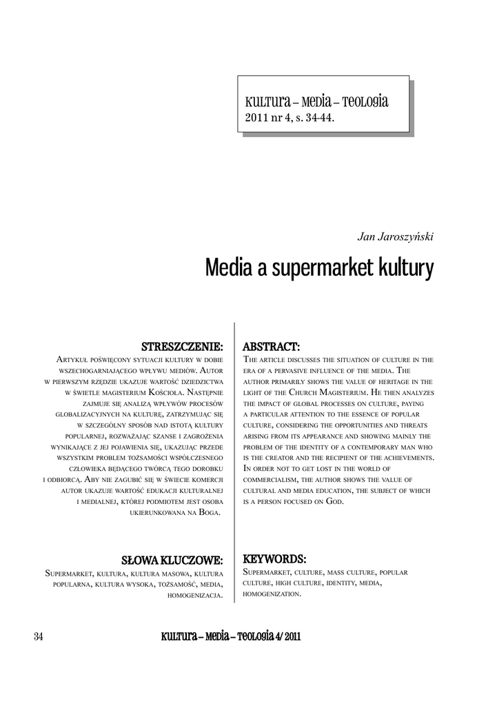 Kultura – Media – Teologia 2011 nr 4, s. 34-44. Jan Jaroszyński Media a supermarket kultury STRESZCZENIE: THE ARTICLE DISCUSSES THE SITUATION OF CULTURE IN THE ERA OF A PERVASIVE INFLUENCE OF THE MEDIA. THE W PIERWSZYM RZĘDZIE UKAZUJE WARTOŚĆ DZIEDZICTWA AUTHOR PRIMARILY SHOWS THE VALUE OF HERITAGE IN THE W ŚWIETLE MAGISTERIUM KOŚCIOŁA. NASTĘPNIE ZAJMUJE SIĘ ANALIZĄ WPŁYWÓW PROCESÓW GLOBALIZACYJNYCH NA KULTURĘ, ZATRZYMUJĄC SIĘ W SZCZEGÓLNY SPOSÓB NAD ISTOTĄ KULTURY LIGHT OF THE CHURCH MAGISTERIUM. HE THEN ANALYZES THE IMPACT OF GLOBAL PROCESSES ON CULTURE, PAYING A PARTICULAR ATTENTION TO THE ESSENCE OF POPULAR CULTURE, CONSIDERING THE OPPORTUNITIES AND THREATS POPULARNEJ, ROZWAŻAJĄC SZANSE I ZAGROŻENIA ARISING FROM ITS APPEARANCE AND SHOWING MAINLY THE WYNIKAJĄCE Z JEJ POJAWIENIA SIĘ, UKAZUJĄC PRZEDE PROBLEM OF THE IDENTITY OF A CONTEMPORARY MAN WHO WSZYSTKIM PROBLEM TOŻSAMOŚCI WSPÓŁCZESNEGO CZŁOWIEKA BĘDĄCEGO TWÓRCĄ TEGO DOROBKU I ODBIORCĄ. ABY NIE ZAGUBIĆ SIĘ W ŚWIECIE KOMERCJI AUTOR UKAZUJE WARTOŚĆ EDUKACJI KULTURALNEJ I MEDIALNEJ, KTÓREJ PODMIOTEM JEST OSOBA UKIERUNKOWANA NA IS THE CREATOR AND THE RECIPIENT OF THE ACHIEVEMENTS. IN ORDER NOT TO GET LOST IN THE WORLD OF COMMERCIALISM, THE AUTHOR SHOWS THE VALUE OF CULTURAL AND MEDIA EDUCATION, THE SUBJECT OF WHICH IS A PERSON FOCUSED ON GOD. BOGA. SŁOWA KLUCZOWE: SUPERMARKET, KULTURA, KULTURA MASOWA, KULTURA POPULARNA, KULTURA WYSOKA, TOŻSAMOŚĆ, MEDIA, HOMOGENIZACJA. 34 ABSTRACT: ARTYKUŁ POŚWIĘCONY SYTUACJI KULTURY W DOBIE WSZECHOGARNIAJĄCEGO WPŁYWU MEDIÓW. AUTOR KEYWORDS: SUPERMARKET, CULTURE, MASS CULTURE, POPULAR CULTURE, HIGH CULTURE, IDENTITY, MEDIA, HOMOGENIZATION. Kultura – Media – Teologia 4/ 2011 J. Jaroszyński, Media w supermarkecie kultury C złowiek został obdarzony przez Boga wyjątkową mocą tworzenia. Sobór Waty kański II w konstytucji duszpasterskiej o Kościele w świecie współczesnym „Gaudium et spes” podkreśla, że kulturą w znaczeniu ogólnym określa się wszystko to, za pomocą czego człowiek rozwija różnorodne dary ducha i ciała, usiłując uczynić bardziej ludzkim życie społeczne. W ten sposób społeczeństwo na przestrzeni dziejów wyraża, przekazuje, zachowuje w swoich dziełach wielkie pragnienia i doświadczenia duchowe, służąc rozwojowi kolejnych pokoleń 1. Kościół dostrzegając wartość kultury, nieustannie zachęca do jej tworzenia, akcentując wymiar wspólnototwórczy. Jan Paweł II podkreśla, że tworzy ona zespół relacji pomiędzy osobami żyjącymi w danej grupie. Dzięki temu, że kultura jest przestrzenią dla komunikacji to charakter relacjonistyczny pozwala budować ład społeczny. Dla utrwalenia tego porządku papież zwraca uwagę na media, by stawały się narzędziem budowy dziedzictwa kultural nego, dzięki któremu człowiek, świadomy swego związku z Bogiem, staje się bardziej człowiekiem2. Niestety media jako narzędzie w tworzeniu i rozpowszechnianiu kultury ulegają różnym wpływom wypaczającym jej prawdziwy sens. Dlatego artykuł ten jest próbą zwrócenia uwagi na zmieniające się w dobie narzędzi komunikowania społecznego oblicza kultury i wyzwania jakie stoją przed człowiekiem. Jedno z nich dotyczy procesu globalizacji ściśle związanego z rodzącym się społeczeństwem informacyjnym. Zjawisko to w sposób szczególny dotyka dziedzinę kultury, akcentując przede wszystkim jej powszechny zasięg i dostęp. To podstawowe kryterium, stanowiące o popularności owoców twórczej pracy człowieka, rodzi kolejne dylematy. Jednym z nich jest problematyka tożsamości kulturowej poszczególnych grup etnicznych, zwłaszcza w wielomilionowych metropoliach, w których człowiek przestaje być podmiotem za sprawą zjawiska homogenizacji. Ponadto tworzące się tygle kulturowe są często przyczyną różnych konfliktów społecznych. Kolejne dylematy dotyczą traktowania dorob ku kulturowego jak towaru, a nie jak dzieła. Takie podejście sprawia, że dziedzictwo, podlegając regułom handlowym, zostaje wpisane w konsumpcyjny styl życia, pozbawiony wartości, które są fundamentem procesu humanizacji. Kultura w takim wydaniu przypomina supermarket w którym spotykają się anonimowe osoby, zaintrygowane kolejnymi promocjami. W takiej rzeczywistości specjaliści od sprzedaży mają kolejną okazję do powiększenia zysku, zarabiając na tym, to co najbardziej rozreklamowa ne, a często mało wartościowe. W artykule tym zostaną przede wszystkim uwypuklone zagrożenia płynące z postępującego procesu globalizacji w dziedzinie niezwykle wrażliwej na wszelkie zmiany - kulturze. Aby uchronić człowieka przed zagrażającym zjawiskiem dehumanizacji, należy położyć szczególny nacisk na edukację kulturalną dopełnioną przez wychowanie do mediów. Autor w refleksji nad tym zagadnieniem posłużył się w głównej mierze doświadczeniem, które zdobył w sektorze kultury, pracując jako artysta oraz inicjator i promotor przedsięwzięć kulturalnych. 1 2 Zob. KDK, a. 53. Por. Jan Paweł II, XVIII ŚDKS, Rola komunikacji społecznej wobec zadań rodziny (01.05.1980 r.), OP, s. 121122. Kultura – Media – Teologia 4/2011 35 „ SUPERMARKET KULTURY Często owoce kultury wysokiej nie są rentowne, ich zrealizowanie pochłania bowiem znaczną część środków. O wiele lepiej radzi sobie kultura popularna. Są to jednak bardzo często kulturalne fast foody, które dają tylko chwilowe zadowolenie. Dziedzictwo artystyczne ma ogromną wartość, ale nie zawsze można je przeliczyć na pieniądze. Dlatego bycie konkurencyjnym w dziedzinie kultury to wielkie niebezpieczeństwo, ale i wyzwanie dla człowieka. Globalizacja kultury Globalizacja jest pojęciem stosowanym dla określenia procesów integracyjnych rozwijających się na skalę światową. Początków tego zjawiska należy łączyć z rewolucją informacyjną upatrywać zainicjowaną przez wynalezienie druku, odkrycia geograf