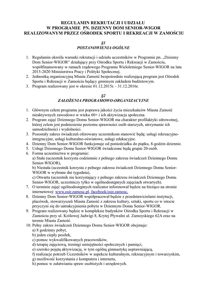 REGULAMIN REKRUTACJI I UDZIAŁU W PROGRAMIE PN. DZIENNY DOM SENIOR-WIGOR REALIZOWANYM PRZEZ OŚRODEK SPORTU I REKREACJI W ZAMOŚCIU §1 POSTANOWIENIA OGÓLNE 1. Regulamin określa warunki rekrutacji i udziału uczestników w Programie pn. „Dzienny Dom Senior-WIGOR” działający przy Ośrodku Sportu i Rekreacji w Zamościu, współfinansowany w ramach rządowego Programu Wieloletniego Senior-WIGOR na lata 2015-2020 Ministerstwa Pracy i Polityki Społecznej. 2. Jednostką organizacyjną Miasta Zamość bezpośrednio realizującą program jest Ośrodek Sportu i Rekreacji w Zamościu będący gminnym zakładem budżetowym. 3. Program realizowany jest w okresie 01.12.2015r. - 31.12.2016r. §2 ZAŁOŻENIA PROGRAMOWO-ORGANIZACYJNE 1. Głównym celem programu jest poprawa jakości życia mieszkańców Miasta Zamość nieaktywnych zawodowo w wieku 60+ i ich aktywizacja społeczna. 2. Program zajęć Dziennego Domu Senior-WIGOR ma charakter profilaktyki zdrowotnej, której celem jest podniesienie poziomu sprawności osób starszych, utrzymanie ich samodzielności i wydolności. 3. Pozostały zakres świadczeń oferowany uczestnikom stanowić będą: usługi rekreacyjnointegracyjne, usługi kulturalno-oświatowe, usługi edukacyjne. 4. Dzienny Dom Senior-WIGOR funkcjonuje od poniedziałku do piątku, 8-godzin dziennie. 5. Usługi Dziennego Domu Senior-WIGOR świadczone będą grupie 20-osób. 6. Forma uczestnictwa w programie: a) Stała (uczestnik korzysta codziennie z pełnego zakresu świadczeń Dziennego Domu Senior-WIGOR), b) Niestała (uczestnik korzysta z pełnego zakresu świadczeń Dziennego Domu SeniorWIGOR w wybrane dni tygodnia), c) Otwarta (uczestnik nie korzystający z pełnego zakresu świadczeń Dziennego Domu Senior-WIGOR, uczestniczy tylko w ogólnodostępnych zajęciach otwartych). 7. O terminie zajęć ogólnodostępnych realizator informował będzie na bieżąco na stronie internetowej: www.osir.zamosc.pl, facebook/osir.zamosc. 8. Dzienny Dom Senior-WIGOR współpracował będzie z przedstawicielami instytucji, placówek, stowarzyszeń Miasta Zamość z zakresu kultury, sztuki, sportu co w istocie przyczyni się do uatrakcyjnienia pobytu w Dziennym Domu Senior-WIGOR. 9. Program realizowany będzie w kompleksie budynków Ośrodka Sportu i Rekreacji w Zamościu przy ul. Królowej Jadwigi 8, Krytej Pływalni ul. Zamoyskiego 62A oraz na terenie Miasta Zamość. 10. Pełny zakres świadczeń Dziennego Domu Senior-WIGOR obejmuje: a) 8 godzinny pobyt, b) jeden ciepły posiłek, c) pomoc wykwalifikowanych pracowników, d) terapię zajęciową, treningi umiejętności społecznych i pamięci, e) szeroko pojętą aktywizację, w tym ogólną gimnastykę usprawniającą, f) realizacje potrzeb Uczestników w aspekcie kulturalnym, rekreacyjnym i towarzyskim, g) możliwość korzystania z komputera i internetu, h) pomoc w załatwianiu spraw osobistych i urzędowych. §3 OPŁATY 1. Udział w zajęciach Dziennego Domu Senior-WIGOR jest odpłatny zgodnie z Uchwała Nr XII/131/2015 Rady Miasta Zamość z dnia 26 października 2015r. w sprawie szczegółowych zasad ponoszenia odpłatności za pobyt w Dziennym Domu „Senior-WIGOR” prowadzonym przez Ośrodek Sportu i Rekreacji w Zamościu, ul. Królowej Jadwigi 8. 2. Opłatę za pobyt stały w Dziennym Domu Senior-WIGOR ustala Dyrektor Ośrodka Sportu i Rekreacji w Zamościu. 3. Miesięczną opłatę za stały pobyt w Dziennym Domu Senior-WIGOR określa poniższa tabela: Dochód osoby samotnie Kwota odpłatności dla osób Kwota odpłatności dla gospodarującej lub dochód samotnie osoby w rodzinie na osobę w rodzinie w gospodarujących stosunku do kryterium dochodowego określonego w art. 8 ust. 1 pkt 1 i 2 ustawy z dnia 12 marca 2004 r. o pomocy społecznej (t.j. Dz.U. z 2015 r. poz. 163 z późn zm.) wyrażony w % Do 100 % Nieodpłatnie Nieodpłatnie Powyżej 100 % do150 % 150 zł 175 zł Powyżej 150% do 200% 175 zł 200 zł Powyżej 200% do 250% 200 zł 225 zł Powyżej 250% do 300% 225 zł 250 zł Powyżej 300% do 350% 250 zł 275 zł Powyżej 350% 275 zł 300 zł 4. Osoby korzystające z pobytu w Dziennym Domu Senior-WIGOR przez okres krótszy niż miesiąc kalendarzowy ponoszą odpłatność w kwocie 12 złotych za każdy dzień pobytu. 5. W szczególnie uzasadnionych przypadkach osoba korzystająca z usług Dziennego Domu Senior-WIGOR, na jej wniosek lub pracownika socjalnego, może zostać częściowo lub całkowicie zwolniona z ponoszenia odpłatności. §4 REKRUTACJA 1. Beneficjentami programu są osoby w wieku 60+ nieaktywne zawodowo zamieszkujące na terenie Miasta Zamość. 2. Rekrutacja uczestników ubiegających się o objęcie działaniami Programu Dziennego Domu Senior-WIGOR będzie odbywała się w terminie od 09.11.2015r. do 20.11.2015r. 3. Podczas wyboru uczestników realizator programu kierował się będzie: sytuacją rodzinną, dochodową i mieszkaniową. 4. Dokumentem rekrutacyjnym, który należy złożyć jest: a) wypełniony wniosek o przyjęcie do Dziennego Domu Senior-WIGOR, b) wypełniony kwestionariusz zgłoszeniowy. 5. Dokumenty rekrutacyjne dostępne są do pobrania w siedzibie Ośrodka Sportu i Rekreacji w Zamościu, ul. Królowej Jadwigi 8, Dział Sportu i Organizacji Imprez, pokój nr 14 od poniedziałku do piątku w godzinach 07:30 – 15:30 lub do pobrania ze strony internetowej www.osir.zamosc.pl. 6. Wypełnione zgłoszenia do programu (wniosek/kwestionariusz) będą przyjmowane w siedzibie Ośrodka Sportu i Rekreacji w Zamościu przy ul. Królowej Jadwigi 8, Dział Sportu i Organizacji Imprez, pokój nr 14 od poniedziałku do piątku w godzinach 07:30 – 15:30 w terminie do dnia 20.11.2015r.. 7. Aplikacje, które wpłyną po wyżej określonym terminie nie będą rozpatrywane. 8. Komisja rekrutacyjna decyzję o kwalifikacji do Programu Dziennego Domu Senior-WIGOR podejmie w terminie do dnia 25.11.2015r. na podstawie: a) informacji zamieszczonych w kwestionariuszu zgłoszeniowym, b) spełnienia kry