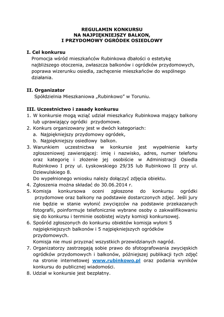 REGULAMIN KONKURSU NA NAJPIĘKNIEJSZY BALKON, I PRZYDOMOWY OGRÓDEK OSIEDLOWY I. Cel konkursu Promocja wśród mieszkańców Rubinkowa dbałości o estetykę najbliższego otoczenia, zwłaszcza balkonów i ogródków przydomowych, poprawa wizerunku osiedla, zachęcenie mieszkańców do wspólnego działania. II. Organizator Spółdzielnia Mieszkaniowa „Rubinkowo” w Toruniu. III. Uczestnictwo i zasady konkursu 1. W konkursie mogą wziąć udział mieszkańcy Rubinkowa mający balkony lub uprawiający ogródki przydomowe. 2. Konkurs organizowany jest w dwóch kategoriach: a. Najpiękniejszy przydomowy ogródek, b. Najpiękniejszy osiedlowy balkon. 3. Warunkiem uczestnictwa w konkursie jest wypełnienie karty zgłoszeniowej zawierającej: imię i nazwisko, adres, numer telefonu oraz kategorię i złożenie jej osobiście w Administracji Osiedla Rubinkowo I przy ul. Łyskowskiego 29/35 lub Rubinkowo II przy ul. Dziewulskiego 8. Do wypełnionego wniosku należy dołączyć zdjęcia obiektu. 4. Zgłoszenia można składać do 30.06.2014 r. 5. Komisja konkursowa oceni zgłoszone do konkursu ogródki przydomowe oraz balkony na podstawie dostarczonych zdjęć. Jeśli jury nie będzie w stanie wyłonić zwycięzców na podstawie przekazanych fotografii, poinformuje telefonicznie wybrane osoby o zakwalifikowaniu się do konkursu i terminie osobistej wizyty komisji konkursowej. 6. Spośród zgłoszonych do konkursu obiektów komisja wyłoni 5 najpiękniejszych balkonów i 5 najpiękniejszych ogródków przydomowych. Komisja nie musi przyznać wszystkich przewidzianych nagród. 7. Organizatorzy zastrzegają sobie prawo do sfotografowania zwycięskich ogródków przydomowych i balkonów, późniejszej publikacji tych zdjęć na stronie internetowej www.rubinkowo.pl oraz podania wyników konkursu do publicznej wiadomości. 8. Udział w konkursie jest bezpłatny. IV. Komisja Konkursowa Komisję konkursową powołują organizatorzy. V. Nagrody pieniężne w konkursie funduje Spółdzielnia Mieszkaniowa „Rubinkowo” VI. Kontakt Administracja Osiedla Rubinkowo I ul. Łyskowskiego 29/35 Tel. 56/ 659 91 46 Administracja Osiedla Rubinkowo II ul. Dziewulskiego 8 Tel. 56/ 639 86 55 Rzecznik prasowy SM „Rubinkowo” Tel. 56/ 639 86 32 [email protected] VII. Postanowienia końcowe 1. Uczestnictwo w konkursie jest równoznaczne z akceptacją niniejszego regulaminu. 2. Niniejszy konkurs, którego warunki zostały określone przez organizatora nie jest "grą losową", "loterią fantową", "zakładem wzajemnym" ani "loterią promocyjną", których wynik zależy od przypadku (przeprowadzenie losowania) w rozumieniu art. 2 ustawy z dnia 19.11.2009 r. o grach hazardowych (Dz. U. z 2009 nr 201 poz.1540 z późniejszymi zmianami). 3. Organizatorzy nie ponoszą odpowiedzialności za działalność osób trzecich. 4. Organizatorzy konkursu zastrzegają sobie prawo skrócenia lub przedłużenia czasu trwania konkursu. 5. Organizatorzy konkursu zastrzegają sobie prawo zmiany nagród i terminów rozstrzygnięcia konkursu, a nawet odwołania w przypadku zdarzeń losowych lub działania siły wyższej, co zostanie ogłoszone na stronie internetowej: www.rubinkowo.pl 6. Organizatorzy zastrzegają sobie prawo do publikacji danych personalnych oraz zdjęć uczestników konkursu. 7. Niniejszy regulamin i karta zgłoszenia do konkursu dostępne są na stronie internetowej: www.rubinkowo.pl