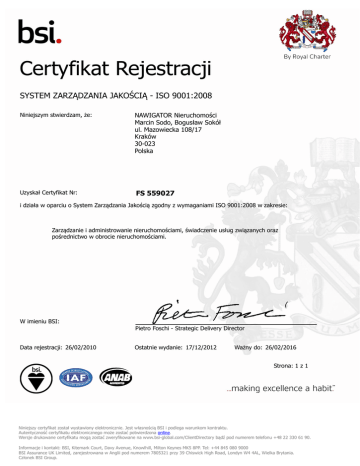 Certyfikat Rejestracji SYSTEM ZARZĄDZANIA JAKOŚCIĄ - ISO 9001:2008 Niniejszym stwierdzam, że: NAWIGATOR Nieruchomości Marcin Sodo, Bogusław Sokół ul. Mazowiecka 108/17 Kraków 30-023 Polska Uzyskał Certyfikat Nr: FS 559027 i działa w oparciu o System Zarządzania Jakością zgodny z wymaganiami ISO 9001:2008 w zakresie: Zarządzanie i administrowanie nieruchomościami, świadczenie usług związanych oraz pośrednictwo w obrocie nieruchomościami. W imieniu BSI: Pietro Foschi - Strategic Delivery Director Data rejestracji: 26/02/2010 Ostatnie wydanie: 17/12/2012 Ważny do: 26/02/2016 Strona: 1 z 1 Niniejszy certyfikat został wystawiony elektronicznie. Jest własnością BSI i podlega warunkom kontraktu. Autentyczność certyfikatu elektronicznego może zostać potwierdzona online. Wersje drukowane certyfikatu mogą zostać zweryfikowane na www.bsi-global.com/ClientDirectory bądź pod numerem telefonu +48 22 330 61 90. Informacje i kontakt: BSI, Kitemark Court, Davy Avenue, Knowlhill, Milton Keynes MK5 8PP. Tel: +44 845 080 9000 BSI Assurance UK Limited, zarejestrowana w Anglii pod numerem 7805321 przy 39 Chiswick High Road, Londyn W4 4AL, Wielka Brytania. Członek BSI Group.