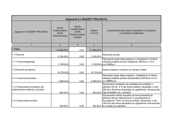 Załącznik 6.1 BUDŻET PROJEKTU Załącznik 6.1 BUDŻET PROJEKTU Koszty kwalifikowalne (EUR) Wnioskodawca Koszty kwalifikowalne (EUR) Partner krajowy projektu Razem ( 4=2+3) Uzasadnienie planowanych wydatków w powiązaniu z określonymi działaniami 1 2 3 4 5 1. Płace 1.1 Personel 21 890,00 € 0,00 21 890,00 € 2 160,00 € 0,00 2 160,00 € 1.1.1 Praca Księgowego 2 160,00 € 0,00 19 730,00 € 0,00 Koszty jak poniżej Planowane koszty będą związane z niezbędnymi w trakcie realizacji projektu pracami księgowej (180 Euro x 12 m2 160,00 € cy=2160Eur) 1.2 Personel zewnętrzny Koszty związane z pracami na umowę o dzieło: 1.2.1 Praca Koordynatora 2 880,00 € 0,00 800,00 € 0,00 400,00 € 0,00 1.2.2 Opracowanie konspektu dla wykładowców prelekcji w szkołach 1.2.3 Opracowanie ankiety 19 730,00 € Planowane koszty będą związane z niezbędnymi w trakcie realizacji projektu pracami koordynatora (240 Euro x12 m2 880,00 € cy=2880Euro). Opracowanie konspektu dla wykładowców prelekcji w szkołach (20 str. A 4) dla strony polskiej i słowackie, w tym 200 Euro dla strony słowackiej za uzgodnienie i tłumaczeniej 800,00 € tego konspektu na j. słowacki. Opracowanie ankiety wspólnie ze stroną słowacką do zebrania danych statystycznych o pszczelarstwie w Euroregionie "Tatry” po stronie polskiej i słowackiej, w tym 150 Euro dla strony słowackiej za uzgodnienie i tłumaczeniej 400,00 € tej ankiety na j.słowacki. 1.2.4 Przeprowadzenie instruktażu 200,00 € 0,00 Przeprowadzenie instruktażu dla 22 wykładowców ( w tym 2 ze słowacji) prelekcji w szkołach polskich i słowackich (2 200,00 € godz. x 100 Euro=200 Euro), 1.2.5 Zebranie danych statystycznych 1.2.6 Prelekcje w szkołach 6 400,00 € 0,00 6 000,00 € 0,00 1 000,00 € 0,00 Prelekcje w szkołach przez wykładowców 6 000,00 € 100 szkołach prelekcje x 60 Euro= 6.000 Euro) Zebranie ankiet z kół i opracowanie danych statystycznych o pszczelarstwie z „Euroregionu Tatry” oraz uzgodnienie danych z partnerem słowackim (10 dni X 2 osoby x 50 Euro= 1 000,00 € 1000 Euro), 900,00 € 0,00 Opracowanie referatu i przeprowadzenie wykładu w trakcie M. Konferencji 30 minut (6 x 150 Euro=900 Euro), po 3 900,00 € wykładowców z Polski i Słowacji 250,00 € 0,00 Przygotowanie pasiek do prezentacji w trakcie 250,00 € Międzynarodowej Konferencji (5 pasiekX50 Euro)=250 Euro 1.2.7 Zebranie ankiet z kół i opracowanie danych statystycznych 1.2.8 Opracowanie referatu i przeprowadzenie wykładu 1.2.9 Przygotowanie pasiek do prezentacji 6 400,00 € 1.2.10 Przygotowanie do druku publikacji 2. Podróże (pociąg, autobus, samochód, etc.) 2.1 Podróże międzynarodowe 2.2 Podróże krajowe Zebranie danych statystycznych o pszczelarstwie z Euroregionie "Tatry” na podstawie ankiet (32kół x 200Euro=6400 Euro) po stronie polskiej i słowackiej, w tym 10 kół ze strony słowackiej 900,00 € 0,00 900,00 € 1 200,00 € 0,00 1 200,00 € 0,00 1 200,00 € 0,00 0,00 € 0,00 1 200,00 € 2.2.1 Transport pszczelarzy 1 200,00 € 0,00 € 1 200,00 € Przygotowanie do druku publikacji referatów z wykładów na konferencji i danych statystycznych wraz z tłumaczeniami na język polski i słowacki 40 str. A-4 lub 80str. A-5 Nie dotyczy Jak poniżej Transport 80 pszczelarzy do 5 pasiek - wynajęcie dwóch autobusów na trasie Nowy Targ - Stróża koło Nowego Sącza 3. Wyposażenie (meble, komputery, etc.) 8 750,00 € 0,00 € 8 750,00 € 3.1 Zakup zestawów multimedialnych 8 750,00 € 4. Spotkania i promocja projektu 4.1 Wyżywienie 0,00 10 120,00 € 0,00 € 2 080,00 € 0,00 € 640,00 € 0,00 € 2 080,00 € Zawiera poniższe koszty: Spotkanie integracyjne Pszczelarzy z Słowacji i Polski w trakcie I dnia Konferencji 80 x 8,00 Euro=640 Euro (obiad + 640,00 € spotkanie przy ognisku ewent. obiadokolacja). 0,00 € Wyżywienie dla wykładowców ( 6 wykł. x 2 (kolacja+obiad) x 240,00 € 20 Euro=240 Euro ( z Polski I Słowacji) 4.1.1 Spotkanie integracyjne 4.1.2 Wyżywienie dla wykładowców 4.1.3 Obiad dla gości specjalnych i uczestników Międzynarodowej Konferencji 4.2 Zakwaterowanie 8 750,00 € Zestawy(laptop + rzutnik + ekran) są niezbędne do przygotowywania i przeprowadzenia prelekcji w szkołach podczas realizacji projektu i będzie wykorzystywany do cyklicznie prowadzonych zebrań szkoleniowych w kołach i prelekcji w szkołach po zakończeniu realizacji projektu, jako element wdrożenia projektu, gdyż istniejące urządzenia w szkołach stwarzają trudności w ich wykorzystaniu, ograniczają możliwość kontaktu i przygotowywania materiałów szkoleniowych przez poszczególne koła pszczelarskie zgodnie z wymaganiami dla ich terenu działania. Proponuje się zakup Zestawów dla 7kół, będą one wykorzystywane prze 32 Koła Pszczelarskie KZP, rozłożone wzdłuż granicy Polsko-Słowackiej na terenie Euroregionu "Tatry".7szt. Zestawów X 1250 Euro =8750 Euro. Natomiast koszt elementów pojedyńczego zestawu wynosi::laptop-530 Euro, rzutnik-600 Euro, ekran-120 Euro = 1250 Euro. 240,00 € 10 120,00 € Obiad dla gości specjalnych i uczestników Międzynarodowej Konferencji podczas II dnia Konferencji (150 osób x 8 Euro = 1200 Euro) 1 200,00 € 0,00 € 1 200,00 € 2 240,00 € 0,00 € 2 240,00 € Zakwaterowanie jak poniżej 4.2.1 Zakwaterowanie wykladowców 240,00 € 4.2.2 Zakwaterowanie uczestników Konferencji 4.3 Publikacje, studia (bez wypłat) 0,00 € 2 000,00 € 0,00 € Zakwaterowanie uczestników Konferencji 1 dzień x 80 2 000,00 € osóbx25 Euro=2000 Euro, w tym 30 osób ze słowacji 4 100,00 € 0,00 € 4 100,00 € 1 500,00 € 0,00 € 2 250,00 € 0,00 € 150,00 € 0,00 € 200,00 € 0,00 € 0,00 € Działania związane z Międzynarodową Konferencją i 1 700,00 € konkursem dla szkół: 4.3.2 Druk publikacji 4.3.4 Druk ankiety 4.4 Inne (np. wynajem sal konferencyjnych) 4.4.1 Wynajęcie pomieszczenia 4.4.2 Upominki 4.4.3 Zakup materiałów, tablic informacyjn
