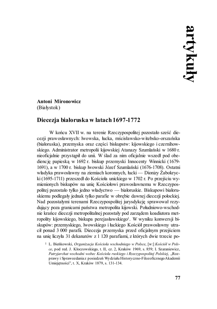 artykuły Antoni Mironowicz (Białystok) Diecezja białoruska w latach 1697-1772 W końcu XVII w. na terenie Rzeczypospolitej pozostało sześć diecezji prawosławnych: lwowska, łucka, mścisławsko-witebsko-orszańska (białoruska), przemyska oraz części biskupstw: kijowskiego i czernihowskiego. Administrator metropolii kijowskiej Atanazy Szumlański w 1680 r. nieoficjalnie przystąpił do unii. W ślad za nim oficjalnie wszedł pod obediencję papieską w 1692 r. biskup przemyski Innocenty Winnicki (16791691), a w 1700 r. biskup lwowski Józef Szumlański (1676-1708). Ostatni władyka prawosławny na ziemiach koronnych, łucki — Dionizy Żabokrycki (1695-1711) przeszedł do Kościoła unickiego w 1702 r. Po przejściu wymienionych biskupów na unię Kościołowi prawosławnemu w Rzeczypospolitej pozostało tylko jedno władyctwo — białoruskie. Biskupowi białoruskiemu podlegały jednak tylko parafie w obrębie dawnej diecezji połockiej. Nad pozostałymi terenami Rzeczypospolitej jurysdykcję sprawował rezydujący poza granicami państwa metropolita kijowski. Południowo-wschodnie krańce diecezji metropolitalnej pozostały pod zarządem koadiutora metropolity kijowskiego, biskupa perejasławskiego1 . W wyniku konwersji biskupów: przemyskiego, lwowskiego i łuckiego Kościół prawosławny utracił ponad 3 000 parafii. Diecezja przemyska przed oficjalnym przejściem na unię liczyła 31 dekanatów z 1 120 parafiami, z których dwie trzecie po1 L. Bieńkowski, Organizacja Kościoła wschodniego w Polsce, [w:] Kościół w Polsce, pod red. J. Kłoczowskiego, t. II, cz. 2, Kraków 1969, s. 859; I. Szaraniewicz, Patryjarchat wschodni wobec Kościoła ruskiego i Rzeczypospolitej Polskiej, „Rozprawy i Sprawozdania z posiedzeń Wydziału Historyczno-Filozoficznego Akademii Umiejętności”, t. X, Kraków 1879, s. 131-134. 77 zostawały przy prawosławiu. Przed przystąpieniem do unii biskupstwo lwowskie liczyło 35 dekanatów z 1 286 parafiami prawosławnymi2 . Biskupstwo łucko-ostrogskie obejmowało obszar Wołynia. Na terenie diecezji łuckoostrogskiej funkcjonowało w 1664 r. tysiąc parafii prawosławnych3 . Ich liczba w 1702 r. nie zmniejszyła się, kiedy władyctwo łuckie przyjęło unię. Istotne zmiany w polityce wobec Kościoła prawosławnego w Rzeczypospolitej nastąpiły po śmierci Jana III Sobieskiego (1674-1696). August II Sas (1687-1732) na początku swego panowania potwierdził prawa dysydentom religijnym oraz przywileje licznych monasterów i cerkwi prawosławnych4 . Diecezja białoruska po śmierci biskupa Teodozego Wasilewicza (1669-1678) formalnie pozostawała nie obsadzona5 . Obsada na katedrze białoruskiej nastąpiła dopiero po interwencji rezydenta rosyjskiego w Warszawie Aleksego Nikitina u króla polskiego. Aleksy Nikitin, z polecenia cara Piotra I i na prośbę mieszkańców Mohylewa, domagał się od króla Augusta II Sasa zapewnienia praw ludności prawosławnej. Monarcha, pod presją Rosji, rozwiązał sprawę obsady diecezji białoruskiej. Na godność władyki mohylewskiego został wybrany Serapion Polchowski (1697-1704), archimandryta słucki, zatwierdzony przywilejem królewskim 30 września 1697 r. Uroczysta konsekracja nowego biskupa odbyła się 14 września 1698 r. w monasterze kijowsko-pieczerskim. Sakramentu święceń Serapionowi Polchowskiemu udzielił metropolita Barlaam Jasiński w asyście Dymitra Tuptałły (późniejszego św. Dymitra, biskupa rostowskiego)6 . W akcie nominacyjnym biskup Serapion otrzymał eparchię białoruską z Mohylewem, Mścisławiem i Orszą, łącznie ze wszystkimi dobrami, katedralnym monasterem św. Spasa w Mohylewie i wsiami do niego należącymi. Przywilej gwarantował również swobodę działalności władyki w granicach jego diecezji „bez żadnej tak unitów Ritus Graeci, jako i ludu polskiego przeszkody”7 . Na mocy tego przywileju władyka Serapion objął katedrę mohylewską w grudniu 1699 r. 2 3 4 5 6 7 78 Monumenta Ucrainae Historica, ed. A. Septyckyj, vol. IV (1671-1701) Romae 1967, s. 293-332; A. M ironowicz, Kościół prawosławny w dawnej Rzeczypospolitej, Białystok 2001, s. 234-236. A. M ironowicz, Kościół prawosławny i unicki w połowie XVII wieku, „Acta PolonoRuthenica”, t. II, pod red. B. Białokozowicza, Olsztyn 1997, s. 71-79. Dokumenta praw y wolności Obywatelom Korony Polskiey y W. X. Lit. Religii Greckiey Orientalney wyznawcom służące..., Warszawa 1767, k. 75. O poprzednich losach diecezji białoruskiej por.: A. M ironowicz, Teodozy Wasilewicz, archimandryta słucki, biskup białoruski, Białystok 1997; tenże, Metropolita Józef Nielubowicz Tukalski, Białystok 1998; tenże, Sylwester Kossow, władyka białoruski, metropolita kijowski, Białystok 1999. F. I. Titow, Russkaja prawosławnaja Cerkow’ w Polsko-Litowskom Gosudarstwie w XVII-XVIII w., t. II, cz. 2, Kijew 1905, s. 386-387; A. Deruga, Piotr Wielki a unici i unia kościelna 1700-1711, Wilno 1936, s. 46; S. T. Gołubiew, Gedeon Odorskij, „Trudy Kijewskoj Duchownoj Akadiemii”, Kijów 1900, s. 183. A. Deruga, Piotr Wielki a unici..., s. 43-44. Unormowanie spraw związanych z obsadą biskupstwa białoruskiego nie zahamowało rozszerzenia unii. Na sejmie warszawskim 1699 r. uchwalono konstytucję, która zobowiązywała króla do zwołania synodu unitów i prawosławnych, aby tych ostatnich podporządkować jurysdykcji papieża. Na sejmie tym zabroniono prawosławnym zamieszkiwania w Kamieńcu Podolskim8 . Zwierzchność biskupa unickiego uznało w 1702 r. stauropigialne bractwo lwowskie. Zmiana wyznania przez ordynariuszy diecezji przemyskiej, łuckiej i lwowskiej spowodowała przejście na unię większości klasztorów prawosławnych. Do unii przystąpiły ośrodki zakonne w Biesiadach (1700), Bilczu (1700), Czortkowie (1700), Dobrzanach (1700), Dubiszczach (1695), Gródku (1700), Hołowczyńcach (1700), Hołubicach (1700), Horodyszczu (1702), Hoszczy (1700), Hoszowie (1700), Jasnogrodzie (1720), Jaz