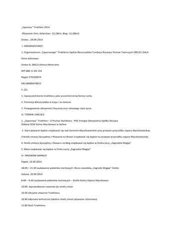 „Zaprowy” Triathlon 2014 (Pływanie-1km, Kolarstwo -33,18km, Bieg -12,28km) Orelec , 20.09.2014 I. ORGANIZATORZY 1. Organizatorem „Zaporowego” Triathlonu będzie Bieszczadzka Fundacja Rozwoju Postaw Twórczych ORELEC GALA Dane adresowe: Orelec 8, 38623 Uhrece Mineralne NIP 688-11-85-154 Regon 370269474 KRS 00000470072. II. CEL 1. Upowszechnienie triathlonu jako wszechstronnej formy ruchu. 2. Promocja Bieszczadów w kraju i na świecie. 3. Propagowanie aktywności fizycznej oraz zdrowego stylu życia. III. TERMIN I MIEJSCE 1. „Zaporowy” Triathlon – O Puchar Dyrektora - PGE Energia Odnawialna Spółka Akcyjna Oddział ZEW Solina-Myczkowce w Solinie 2. Start pływacki będzie znajdować się nad Jeziorem Myczkowieckim przy prawym przyczółku zapory Myczkowieckiej 3 Strefa zmiany dyscypliny z Pływania na Rower znajdować się będzie na prawym przyczółku zapory Myczkowieckiej 4. Strefa zmiany dyscypliny z Roweru na Bieg znajdować się będzie w Orelcu przy „Zagrodzie Magija” 5. Meta znajdować się będzie w Orelcu przy „Zagrodzie Magija” IV. PROGRAM IMPREZY Piątek, 19.09.2014 18:00 – 21:30 wydawanie pakietów startowych -Biuro zawodów „Zagroda Magija” Orelec Sobota, 20.09.2014 8:00 – 9:30 wydawanie pakietów startowych – Strefa Startu Zapora Myczkowce 10:00 wprowadzanie rowerów do strefy zmian 10:30 oficjalne otwarcie Triathlonu 10:40 odprawa techniczna (okolice strefy zmian pływanie- kolarstwo) 11:00 Start Triathlonu 15:00 – 16:30 wydawanie rowerów ze strefy zmian będzie w Orelcu przy „Zagrodzie Magija” 18:00 zamknięcie trasy 18:00 – 18:30 ceremonia wręczania nagród w Orelcu przy „Zagrodzie Magija” 19:00- Zabawa Plenerowa, Koncert, Ognisko V. DYSTANS I TRASA 1. Pływanie na dystansie 1km (1 pętla). Spodziewana temperatura wody ok. 18-22°C. Głębokość jeziora do 15m. Start z brzegu zapory. Pomiar trasy GPS http://connect.garmin.com/course/6904712 2. Rower na dystansie 33,18 km (1 pętla ). Trasa drogą publiczną w ruchu. Pomiar trasy GPS http://connect.garmin.com/course/6932361. Oznaczenia oraz zabezpieczenie na głównych skrzyżowaniach. Kask obowiązkowy na całej trasie kolarskiej. Ruch drogowy nie będzie zatrzymany i przejazd odbędzie się zgodnie z przepisami ruchu drogowego. Dozwolone rowery do jazdy na czas i kierownice triathlonowe. 3. Bieg – 12,28km (1 pętla). Trasa górska (leśna) Oznaczenia długości trasy co 1km. Pomiar trasy GPS. http://connect.garmin.com/course/6907674 4. Limit czasu –nie obowiązuje (wszystkie osoby które dotrą do mety zostaną skalyfikowane) VI.BIURO ZAWODÓW 1. Biuro zawodów będzie mieściło się w „Zagrodzie Magija”- Wesoła Stodoła w Orelecu. www.zagrodamagija.pl 2. Biuro zawodów będzie czynne w dniu 19.09.2014 w godzinach 18:00-21:30. VII. PUNKTY ODŚWIEŻANIA 1. W punktach odświeżania dostępna będzie woda mineralna niegazowana, napoje izotonicze. VIII. TOALETY PRZENOŚNE 1. Toalety przenośne ustawione będą w okolicach startu i mety oraz w Zagrodzie Magija. IX. POMIAR CZASU 1. Elektroniczny pomiar czasu. X. KLASYFIKACJE i KATEGORIE WIEKOWE OPEN – wszyscy uczestnicy M1 i K1 (18-29 lat) M2 i K2 (30-39 lat) M3 i K3 (40-49 lat) M4 i K4 (50+) XI. NAGRODY 1. Pierwszych trzech zawodników i pierwsze trzy zawodniczki w każdej kategorii otrzymają pamiątkowe statuetki. 2. Nagrody rzeczowe zostaną rozlosowane wśród wszystkich uczestników, którzy ukończyli „Zaprowy” Triathlon 3. Nagrody pieniężnych – w zależności od pozyskanych sponsorów. 4. Każdy zawodnik, który ukończy „Zaporowy” Triathlon otrzyma okolicznościowy medal, XII. WARUNKI UCZESTNICTWA 1. W zawodach mogą wziąć udział osoby, które najpóźniej w dniu startu, mają ukończone 18 lat i przedstawią swój dowód tożsamości wraz ze zdjęciem oraz podpiszą oświadczenie o starcie z własnej woli i że w dniu ich stan zdrowia pozwala na ekstremalny wysiłek fizyczny. XIII. ZGŁOSZENIA 1. Zgłoszenia do Zaporowego” Triathlonu będą przyjmowane jedynie za pośrednictwem oficjalnej strony internetowej www.zaporytriathlon.pl/zgloszenia 2. Termin uregulowania opłaty startowej następuje do 14 dni od daty wysłania formularz zgłoszeniowego. 3. Po wypełnieniu formularza zgłoszeniowego i opłaceniu wpisowego zawodnik będzie umieszczony na liście startowej. 4. O terminie zgłoszenia decyduje data dokonania wpłaty wpisowego. Wszystkie koszty wpłaty wpisowego pokrywa osoba wpłacająca. 5. Obowiązuje limit uczestników 100 osób. 6. W przypadku osiągnięcia limitu 100 uczestników, każda kolejna osoba, która zgłosi się na zawody zostanie umieszczona na liście rezerwowej. 7. Zgłoszenia przyjmowane będą do dnia 01.09.2014, po tym terminie dopisanie się do listy startowej lub rezerwowej nie będzie możliwe. XIV. Opłaty 1. W zawodach „Zaporowy” Triathlon - opłaty w wysokości: 120,00 PLN płatne -jeżeli uczestnik zapisze się do dnia 31.07.2014 i dokona w tym terminie opłaty startowej 140,00 PLN płatne - jeżeli uczestnik zapisze się do 14.09.2014 i dokona w tym terminie opłaty startowej 160 PLN płatne w dniu zawodów 2. Termin wpłaty rozumiany jest jako data przyjścia przelewu na konto organizatora. 3. Wpłaty dokonywane tradycyjnym przelewem należy kierować na konto: …………………………………………………. W tytule przelewu powinno znaleźć się ”nazwisko i imię, opłata startowa „Zaporowy” Triathlon 2014″. 4. W przypadku zgłoszeń po 20 sierpnia 2014 r. organizator nie gwarantuje zawodnikowi/zawodniczce otrzymania pełnego pakietu startowego. 5. Organizator wystawia rachunek wyłącznie na żądanie w terminie do 7 dni od daty zaksięgowania opłaty startowej na koncie. 8. Dokonując zgłoszenia na zawody zawodnik oświadcza, że wyraża zgodę na wystawienie i przesłanie rachunki w formie elektronicznej przez ………………………………. , zgodnie z Rozporządzeniem Ministra Finansów z dnia 17 grudnia 2010r. w spra