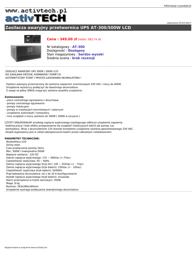 Informacje o produkcie Utworzono 03-03-2017 Zasilacza awaryjny przetwornica UPS AT-300/500W LCD Cena : 349,00 zł (netto: 283,74 zł) Nr katalogowy : AT-300 Dostępność : Dostępny Stan magazynowy : bardzo wysoki Średnia ocena : brak recenzji ZASILACZ AWARYJNY UPS 300W / 500W LCD DO ZASILANIA PIECÓW, KOMINKÓW I POMP CO AUTOMATYCZNY START I PROCES ŁADOWANIA AKUMULATORA ! Zasilacz awaryjny przeznaczony do zasilania napięciem znamionowym 230 VAC i mocy do 400W. Urządzenie wystarczy podłączyć do dowolnego akumulatora. Z uwagi na pełny SINUS mogą być zasilane wszelkie urządzenia. Zastosowanie: - piece centralnego ogrzewania z dmuchawą - pompy centralnego ogrzewania - pompy indukcyjne - pompy w instalacjach kominkowych i solarnych - urządzenia automatyki i komputery - inne urządzeń o mocy zasilania do 300W ( 500W w szczycie ) CZYSTY SINUSOIDALNY przebieg napięcia wyjściowego (zasilającego odbiory) urządzenie zapewnia stabilną pracę i brak efektu przegrzewania się urządzeń indukcyjnych takich jak pompy czy wentylatory. Wraz z akumulatorem 12V stanowi kompletne urządzenie zasilania gwarantowanego 230 VAC. Zespół wyposażony jest w układ zabezpieczenia baterii przed całkowitym rozładowaniem. PARAMETRY TECHNICZNE: Wyświetlacz LCD Zimny start. Czas przełączania poniżej 10ms Moc: 300W / maksymalna 500W Napięcie zasilania : 12V DC Zakres napięcia wejściowego: 175 ~ 290Vac (+-7Vac) Częstotliwość wejściowa: 50 ~ 60Hz Zakres napięcia wyjściowego (tryb AC): 195 ~ 255Vac (+ - 7Vac) Zakres napięcia wyjściowego (tryb baterii): 230Vac (+ - 10Vac) Częstotliwość wyjściowa (tryb baterii): 50/60Hz Prąd ładowania akumulatora: od 1 do 10 A (konfigurowane) Kształt napięcia wyjściowego (tryb baterii): sinusoida Alarm przeciążenia w trybie sieciowym: 350W Waga. 8 kg Rozmiar: 293x280x160mm Urządzenie wymaga podłączenia zewnętrznego akumulatora Wygenerowano w programie www.oscGold.com
