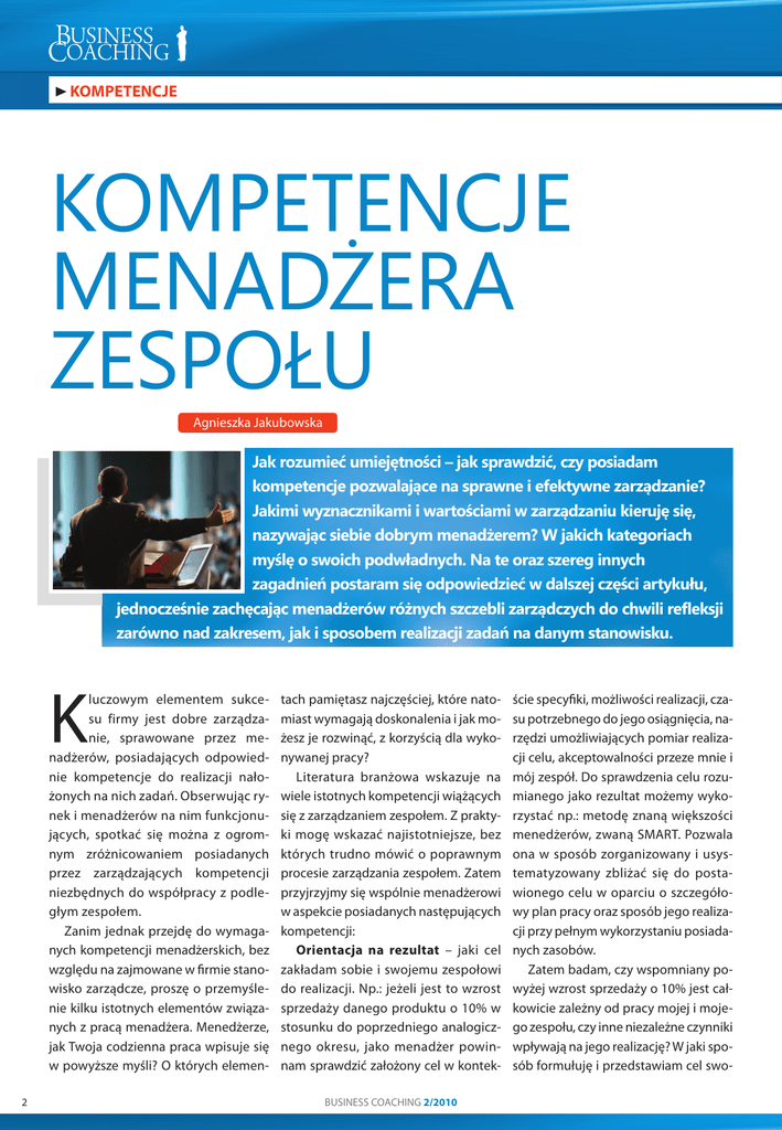 KOMPETENCJE KOMPETENCJE MENADŻERA ZESPOŁU Agnieszka Jakubowska Jak rozumieć umiejętności – jak sprawdzić, czy posiadam kompetencje pozwalające na sprawne i efektywne zarządzanie? Jakimi wyznacznikami i wartościami w zarządzaniu kieruję się, nazywając siebie dobrym menadżerem? W jakich kategoriach myślę o swoich podwładnych. Na te oraz szereg innych zagadnień postaram się odpowiedzieć w dalszej części artykułu, jednocześnie zachęcając menadżerów różnych szczebli zarządczych do chwili refleksji zarówno nad zakresem, jak i sposobem realizacji zadań na danym stanowisku. K luczowym elementem sukcesu firmy jest dobre zarządzanie, sprawowane przez menadżerów, posiadających odpowiednie kompetencje do realizacji nałożonych na nich zadań. Obserwując rynek i menadżerów na nim funkcjonujących, spotkać się można z ogromnym zróżnicowaniem posiadanych przez zarządzających kompetencji niezbędnych do współpracy z podległym zespołem. Zanim jednak przejdę do wymaganych kompetencji menadżerskich, bez względu na zajmowane w firmie stanowisko zarządcze, proszę o przemyślenie kilku istotnych elementów związanych z pracą menadżera. Menedżerze, jak Twoja codzienna praca wpisuje się w powyższe myśli? O których elemen2 tach pamiętasz najczęściej, które natomiast wymagają doskonalenia i jak możesz je rozwinąć, z korzyścią dla wykonywanej pracy? Literatura branżowa wskazuje na wiele istotnych kompetencji wiążących się z zarządzaniem zespołem. Z praktyki mogę wskazać najistotniejsze, bez których trudno mówić o poprawnym procesie zarządzania zespołem. Zatem przyjrzyjmy się wspólnie menadżerowi w aspekcie posiadanych następujących kompetencji: Orientacja na rezultat – jaki cel zakładam sobie i swojemu zespołowi do realizacji. Np.: jeżeli jest to wzrost sprzedaży danego produktu o 10% w stosunku do poprzedniego analogicznego okresu, jako menadżer powinnam sprawdzić założony cel w kontekBUSINESS COACHING 2/2010 ście specyfiki, możliwości realizacji, czasu potrzebnego do jego osiągnięcia, narzędzi umożliwiających pomiar realizacji celu, akceptowalności przeze mnie i mój zespół. Do sprawdzenia celu rozumianego jako rezultat możemy wykorzystać np.: metodę znaną większości menedżerów, zwaną SMART. Pozwala ona w sposób zorganizowany i usystematyzowany zbliżać się do postawionego celu w oparciu o szczegółowy plan pracy oraz sposób jego realizacji przy pełnym wykorzystaniu posiadanych zasobów. Zatem badam, czy wspomniany powyżej wzrost sprzedaży o 10% jest całkowicie zależny od pracy mojej i mojego zespołu, czy inne niezależne czynniki wpływają na jego realizację? W jaki sposób formułuję i przedstawiam cel swo- >>> Kompetencje menadżera zespołu jemu zespołowi? Jako kolejne konieczne do wykonania zadanie, czy być może nowe interesujące wyzwanie, z dużym zapleczem wymiernych korzyści dla realizujących cel? W jaki sposób mogę zmierzyć osiągnięty rezultat i czy wykorzystane narzędzie jest obiektywne, uwzględniające wszystkie znane mi okoliczności realizacji celu? Z praktyki wnoszę, iż szczera odpowiedź na postawione powyżej pytania determinuje orientację menadżera na rezultat. Bowiem gdy cel nie jest atrakcyjny dla wykonawcy, spada zainteresowanie założonym rezultatem. Myślenie strategiczne, czyli orientacja na biznes – jak przytoczony powyżej przykład wzrostu sprzedaży umiejscowić nie tylko w kontekście zadań swojego zespołu, lecz szerzej, w perspektywie pracy pozostałych jednostek organizacyjnych powiązanych z realizacją celu. Np.: dział wsparcia sprzedaży, czy obsługi serwisowej klienta. Planowanie pracy, delegowanie uprawnień oraz rozliczanie zadań – jak ja, jako menadżer, powinnam zaplanować pracę, aby zrealizować powyżej przedstawiony cel. Jakie są moje priorytety związane z jego wykonaniem, jakie uprawnienia mogę delegować, na kogo rządkującego ważność i pilność realii dlaczego? Jakimi narzędziami posłużę zowanych zadań (Tabela 1). się, oceniając stopień realizacji zadania? Praca i współpraca w zespole – zeW jaki sposób udzielę informacji zwrot- spół tworzą ludzie. Jedyni i niepowta- Do sprawdzenia celu rozumianego jako rezultat możemy wykorzystać np.: metodę znaną większości menedżerów, zwaną SMART nej podległym pracownikom? Odwołując się do swojej praktyki mogę zaryzykować stwierdzenie, iż znajomość odpowiedzi na powyższe pytania determinuje posiadanie opisanej kompetencji. W celu uporządkowania zagadnień związanych z wyborem priorytetów, proponuję wykonanie ćwiczenia po- rzalni. Pamiętaj, że stosując w rozmowie szeroką paletę korzyści wynikającą z realizacji celu jaki przed tobą postawiono, zwiększasz możliwości dotarcia indywidualnie do każdego człowieka w zespole, potęgując efekt współpracy i zorientowania zespołu wokół zadania. Zastanów się nad swoją rolą pełnioną w ze- Tabela 1. Matryca priorytetów Zadania ważne i pilne: Zadania ważne i niepilne: Zadania wykonujemy w pierwszej kolejności. Szczególnie istotną cechą jest planowanie tego Cechuje je wysoki stopień ważności oraz zbliża- typu zadań, np.: doskonalenie. jący się termin realizacji. Zadania nieważne i pilne: Zadania nieważne i niepilne: Zadania możemy delegować lub prosić o wsparcie przy ich realizacji. Warto przemyśleć, kto jeszcze oprócz mnie potrafi dobrze je wykonać? Np.: korespondencja. Zadania, które wykonujemy w wolnym czasie, bez negatywnych konsekwencji dla pozostałych aktywności. Opracowała: A.Jakubowska na podstawie S.Covey 7 nawyków skutecznego działania, Dom Wydawniczy Rebis Sp.z o.o. 5 GŁÓWNYCH MYŚLI 1. 3. Za osiągniętym wynikiem stoją ludzie, którzy na niego zapracowali, doceń ich trud. 2. Pamiętaj o priorytetach, deleguj zadania i nadzoruj ich realizację, jednocześnie dając przestrzeń na twórcze myślenie. 4. 5. Twój zesp