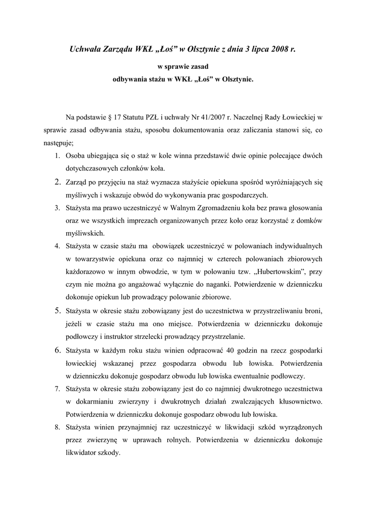 Uchwała Zarządu WKŁ „Łoś” w Olsztynie z dnia 3 lipca 2008 r. w sprawie zasad odbywania stażu w WKŁ „Łoś” w Olsztynie. Na podstawie § 17 Statutu PZŁ i uchwały Nr 41/2007 r. Naczelnej Rady Łowieckiej w sprawie zasad odbywania stażu, sposobu dokumentowania oraz zaliczania stanowi się, co następuje; 1. Osoba ubiegająca się o staż w kole winna przedstawić dwie opinie polecające dwóch dotychczasowych członków koła. 2. Zarząd po przyjęciu na staż wyznacza stażyście opiekuna spośród wyróżniających się myśliwych i wskazuje obwód do wykonywania prac gospodarczych. 3. Stażysta ma prawo uczestniczyć w Walnym Zgromadzeniu koła bez prawa głosowania oraz we wszystkich imprezach organizowanych przez koło oraz korzystać z domków myśliwskich. 4. Stażysta w czasie stażu ma obowiązek uczestniczyć w polowaniach indywidualnych w towarzystwie opiekuna oraz co najmniej w czterech polowaniach zbiorowych każdorazowo w innym obwodzie, w tym w polowaniu tzw. „Hubertowskim”, przy czym nie można go angażować wyłącznie do naganki. Potwierdzenie w dzienniczku dokonuje opiekun lub prowadzący polowanie zbiorowe. 5. Stażysta w okresie stażu zobowiązany jest do uczestnictwa w przystrzeliwaniu broni, jeżeli w czasie stażu ma ono miejsce. Potwierdzenia w dzienniczku dokonuje podłowczy i instruktor strzelecki prowadzący przystrzelanie. 6. Stażysta w każdym roku stażu winien odpracować 40 godzin na rzecz gospodarki łowieckiej wskazanej przez gospodarza obwodu lub łowiska. Potwierdzenia w dzienniczku dokonuje gospodarz obwodu lub łowiska ewentualnie podłowczy. 7. Stażysta w okresie stażu zobowiązany jest do co najmniej dwukrotnego uczestnictwa w dokarmianiu zwierzyny i dwukrotnych działań zwalczających kłusownictwo. Potwierdzenia w dzienniczku dokonuje gospodarz obwodu lub łowiska. 8. Stażysta winien przynajmniej raz uczestniczyć w likwidacji szkód wyrządzonych przez zwierzynę w uprawach rolnych. Potwierdzenia w dzienniczku dokonuje likwidator szkody. 9. Stażysta w okresie stażu winien uczestniczyć w jednej imprezie kynologicznej – próby lub konkursy psów myśliwskich. Potwierdzenia w dzienniczku dokonuje opiekun. 10. Staż kończy jego zaliczenie po uprzednim sprawdzeniu przez zarząd koła wiadomości z zakresu łowiectwa, zapisów w historii koła, znajomości obwodów koła oraz po kontroli dzienniczku stażysty o sformułowanych obowiązków wobec koła. potwierdzonym wykonaniu powyżej