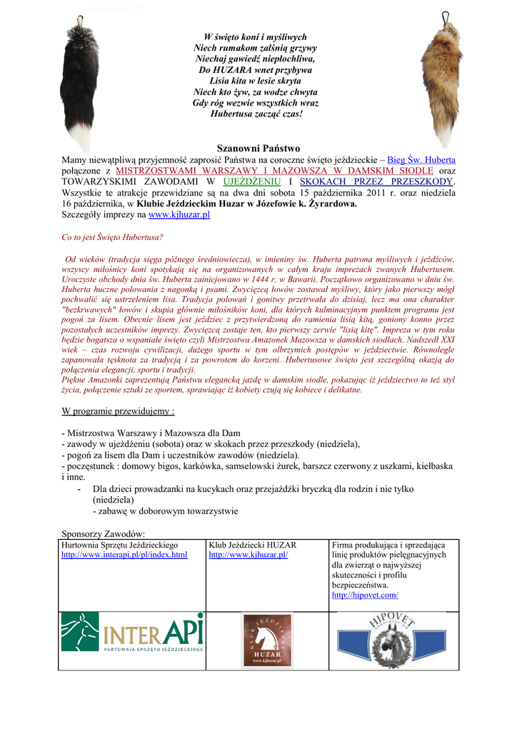 W święto koni i myśliwych Niech rumakom zalśnią grzywy Niechaj gawiedź niepłochliwa, Do HUZARA wnet przybywa Lisia kita w lesie skryta Niech kto żyw, za wodze chwyta Gdy róg wezwie wszystkich wraz Hubertusa zacząć czas! Szanowni Państwo Mamy niewątpliwą przyjemność zaprosić Państwa na coroczne święto jeździeckie – Bieg Św. Huberta połączone z MISTRZOSTWAMI WARSZAWY I MAZOWSZA W DAMSKIM SIODLE oraz TOWARZYSKIMI ZAWODAMI W UJEŻDŻENIU I SKOKACH PRZEZ PRZESZKODY. Wszystkie te atrakcje przewidziane są na dwa dni sobota 15 października 2011 r. oraz niedziela 16 października, w Klubie Jeździeckim Huzar w Józefowie k. Żyrardowa. Szczegóły imprezy na www.kjhuzar.pl Co to jest Święto Hubertusa? Od wieków (tradycja sięga późnego średniowiecza), w imieniny św. Huberta patrona myśliwych i jeźdźców, wszyscy miłośnicy koni spotykają się na organizowanych w całym kraju imprezach zwanych Hubertusem. Uroczyste obchody dnia św. Huberta zainicjowano w 1444 r. w Bawarii. Początkowo organizowano w dniu św. Huberta huczne polowania z nagonką i psami. Zwycięzcą łowów zostawał myśliwy, który jako pierwszy mógł pochwalić się ustrzeleniem lisa. Tradycja polowań i gonitwy przetrwała do dzisiaj, lecz ma ona charakter "bezkrwawych" łowów i skupia głównie miłośników koni, dla których kulminacyjnym punktem programu jest pogoń za lisem. Obecnie lisem jest jeździec z przytwierdzoną do ramienia lisią kitą, goniony konno przez pozostałych uczestników imprezy. Zwycięzcą zostaje ten, kto pierwszy zerwie "lisią kitę". Impreza w tym roku będzie bogatsza o wspaniałe święto czyli Mistrzostwa Amazonek Mazowsza w damskich siodłach. Nadszedł XXI wiek – czas rozwoju cywilizacji, dużego sportu w tym olbrzymich postępów w jeździectwie. Równolegle zapanowała tęsknota za tradycją i za powrotem do korzeni. Hubertusowe święto jest szczególną okazją do połączenia elegancji, sportu i tradycji. Piękne Amazonki zaprezentują Państwu elegancką jazdę w damskim siodle, pokazując iż jeździectwo to też styl życia, połączenie sztuki ze sportem, sprawiając iż kobiety czują się kobiece i delikatne. W programie przewidujemy : - Mistrzostwa Warszawy i Mazowsza dla Dam - zawody w ujeżdżeniu (sobota) oraz w skokach przez przeszkody (niedziela), - pogoń za lisem dla Dam i uczestników zawodów (niedziela). - poczęstunek : domowy bigos, karkówka, samselowski żurek, barszcz czerwony z uszkami, kiełbaska i inne. - Dla dzieci prowadzanki na kucykach oraz przejażdżki bryczką dla rodzin i nie tylko (niedziela) - zabawę w doborowym towarzystwie Sponsorzy Zawodów: Hurtownia Sprzętu Jeździeckiego http://www.interapi.pl/pl/index.html Klub Jeździecki HUZAR http://www.kjhuzar.pl/ Firma produkująca i sprzedająca linię produktów pielęgnacyjnych dla zwierząt o najwyższej skuteczności i profilu bezpieczeństwa. http://hipovet.com/