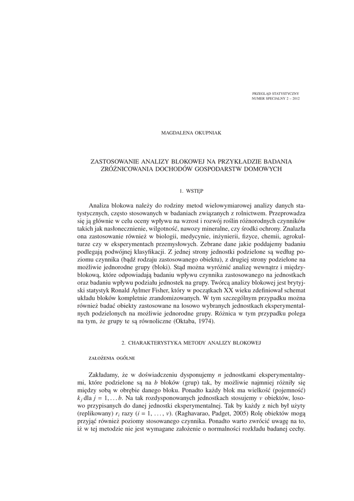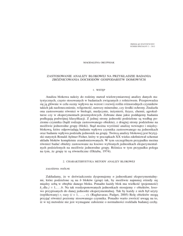PRZEGLĄD STATYSTYCZNY NUMER SPECJALNY 2 – 2012 MAGDALENA OKUPNIAK ZASTOSOWANIE ANALIZY BLOKOWEJ NA PRZYKŁADZIE BADANIA ZRÓŻNICOWANIA DOCHODÓW GOSPODARSTW DOMOWYCH 1. WSTĘP Analiza blokowa należy do rodziny metod wielowymiarowej analizy danych statystycznych, często stosowanych w badaniach związanych z rolnictwem. Przeprowadza się ją głównie w celu oceny wpływu na wzrost i rozwój roślin różnorodnych czynników takich jak nasłonecznienie, wilgotność, nawozy mineralne, czy środki ochrony. Znalazła ona zastosowanie również w biologii, medycynie, inżynierii, fizyce, chemii, agrokulturze czy w eksperymentach przemysłowych. Zebrane dane jakie poddajemy badaniu podlegają podwójnej klasyfikacji. Z jednej strony jednostki podzielone są według poziomu czynnika (bądź rodzaju zastosowanego obiektu), z drugiej strony podzielone na możliwie jednorodne grupy (bloki). Stąd można wyróżnić analizę wewnątrz i międzyblokową, które odpowiadają badaniu wpływu czynnika zastosowanego na jednostkach oraz badaniu wpływu podziału jednostek na grupy. Twórcą analizy blokowej jest brytyjski statystyk Ronald Aylmer Fisher, który w początkach XX wieku zdefiniował schemat układu bloków kompletnie zrandomizowanych. W tym szczególnym przypadku można również badać obiekty zastosowane na losowo wybranych jednostkach eksperymentalnych podzielonych na możliwie jednorodne grupy. Różnica w tym przypadku polega na tym, że grupy te są równoliczne (Oktaba, 1974). 2. CHARAKTERYSTYKA METODY ANALIZY BLOKOWEJ założenia ogólne Zakładamy, że w doświadczeniu dysponujemy n jednostkami eksperymentalnymi, które podzielone są na b bloków (grup) tak, by możliwie najmniej różniły się między sobą w obrębie danego bloku. Ponadto każdy blok ma wielkość (pojemność) k j dla j = 1, . . . b. Na tak rozdysponowanych jednostkach stosujemy v obiektów, losowo przypisanych do danej jednostki eksperymentalnej. Tak by każdy z nich był użyty (replikowany) ri razy (i = 1, . . . , v). (Raghavarao, Padget, 2005) Rolę obiektów mogą przyjąć również poziomy stosowanego czynnika. Ponadto warto zwrócić uwagę na to, iż w tej metodzie nie jest wymagane założenie o normalności rozkładu badanej cechy. 238 Magdalena Okupniak Model doświadczenia jest następujący: Y = μIn + Δ τ + D β + ε , (1) gdzie: Y – wartość badanej zmiennej, μ – średnia ogólna, τ – wektor efektów obiektowych, β – wektor efektów blokowych, ε – wektor błędów losowych, Δ = (δws ), gdzie: ⎧ ⎪ ⎪ ⎨ 0 s−ta obserwacja nie jest związana z obiektem w, δws = ⎪ ⎪ ⎩ 1 s−ta obserwacja dotyczy w−tego obiektu. D = (γzs ), gdzie: ⎧ ⎪ ⎪ ⎨ 0 γzs = ⎪ ⎪ ⎩ 1 s−ta obserwacja nie pochodzi z z−tego bloku, s−ta obserwacja pochodzi z z−tego bloku. Warto zwrócić uwagę na to, że w doświadczeniu prowadzonym według metody układu bloków nie ma interakcji między efektem blokowym, a efektem obiektowym. Macierz Δ jest wymiaru v × n, natomiast macierz D wymiaru b × n. O błędach losowych ε zakładamy, że 1) ε jest wektorem nieskorelowanych błędów losowych, 2 2) ε ∼ N 0n , σ In . Ponadto należy zdefiniować pojęcie kontrastu: Liniową funkcję parametryczną ρ wektora ρ = ρ1 , ρ2 , . . . , ρd nazywamy kontrastem, jeśli Id = 0. Kontrast nazywamy kontrastem elementarnym, jeśli ma tylko dwa niezerowe elementy i są one równe -1 i 1 (Raghavarao, Padget, 2005). Analiza wewna˛trzblokowa Badanie prowadzone według analizy wewnątrzblokowej polega na tym, że eliminujemy efekt podziału jednostek eksperymentalnych na bloki i rozważamy problem, czy efekty pochodzące od zastosowanych obiektów mają wpływ na wyniki doświadczenia. Ze względu na nieestymowalność każdego parametru z osobna, analizujemy następujący układ hipotez: H0 : τ1 − τv = τ2 − τv = . . . = τv−1 − τv = 0 H1 : ∼ H0 (2) co możemy zrobić powołując się na następujące twierdzenie (Raghavarao, Padget, 2005): Zastosowanie analizy blokowej na przykładzie badania zróżnicowania dochodów gospodarstw domowych 239 Wszystkie elementarne kontrasty efektów obiektowych są estymowalne wtedy i tylko wtedy, gdy rz (C) = v − 1. Powyższy układ hipotez możemy weryfikować za pomocą statystyki Walda (Raghavarao, Padget, 2005): Q C−Q v−1 F = 2 , (3) R0 n−b−v+1 gdzie: C = R − NK −1 N , C − – g-odwrotność macierzy C, Q = T − NK −1 B, R20 = SST − SSB − SSTr|B . Macierz R jest macierzą diagonalną, R = diag(r1r2 , . . . , rv ). Podobnie macierz K, gdzie K = diag (k1 , k2 , . . . , kb ) . Macierz incydencji N jest wymiaru v × b. Dalsze oznaczenia są następujące: v B = (B1 , . . . , Bb ) , gdzie B j = Yij i=1 T = (T 1 , . . . , T v ) , gdzie T i = b j=1 Yij analiza mie˛dzyblokowa Badanie prowadzone według analizy międzyblokowej polega na tym, że eliminujemy efekty pochodzące od zastosowanych obiektów i rozważamy problem, czy efekty wywodzące się z podziału jednostek eksperymentalnych na bloki mają wpływ na wyniki doświadczenia. Również w tym wypadku, ze względu na nieestymowalność każdego parametru z osobna, analizujemy poniższy układ hipotez: H0 : β1 − βb = β2 − βb = . . . = βb−1 − βb = 0 H1 : ∼ H0 (4) Wykorzystując poniższe twierdzenie (Raghavarao, Padget, 2005), które rozwiązuje problem nieestymowalności parametrów: Wszystkie elementarne kontrasty efektów blokowych są estymowalne wtedy i tylko wtedy, gdy rz (D∗ ) = b − 1. Hipotezę zerową możemy weryfikować przy pomocy statystyki Walda (Raghavarao, Padget, 2005): P (D∗ )− P b−1 , F = 2 (5) R0 n−b−v+1 gdzie: D∗ = K − N R−1 N, 240 Magdalena Okupniak (D∗ )− – g-odwrotność macierzy D∗ , P = B − N R−1 T , R02 = SS T − SS Tr − SS B|Tr . 3. SCHEMAT PRZEPROWADZONEGO BADANIA Dochód jest jednym z zasadniczych czynników służących do określania poziomu zamożności i sposobu życia, poz