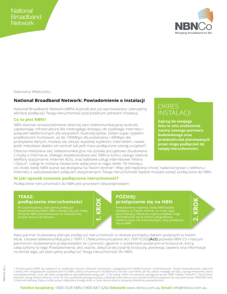 Szanowny Właścicielu, National Broadband Network: Powiadomienie o instalacji National Broadband Network (NBN) Australii jest już wprowadzany i planujemy wkrótce podłączyć Twoją nieruchomość pod podanym adresem instalacji. Co to jest NBN? OKRES INSTALACJI Zajrzyj do swojego NBN stanowi unowocześnienie obecnej sieci telekomunikacyjnej Australii, listu w celu znalezienia zapewniając infrastrukturę dla niedrogiego dostępu do szybkiego Internetu i nazwy naszego partnera połączeń telefonicznych dla wszystkich Australijczyków. Dzięki super szybkim budowlanego oraz prędkościom hurtowym, aż do 100Mbps dla pobierania i 40Mbps dla przedziału dat planowanych przesyłania danych, możesz się cieszyć wysokiej szybkości Internetem, nawet, przez niego podłączeń do jeżeli mieszkasz daleko od centrali lub jeśli masz podłączone szereg urządzeń1. twojej nieruchomości. Obecna miedziana sieć telekomunikacyjna nie została początkowo zbudowana z myślą o Internecie. Dlatego światłowodowa sieć NBN w końcu zastąpi obecne telefony stacjonarne, Internet ADSL oraz kablowe usługi internetowe Telstra i Optus2. Usługi te zostaną ostatecznie wyłączone w ciągu około 18 miesięcy od chwili, kiedy NBN stanie się dostępna na Twoim terenie3. Więc jeśli będziesz chcieć nadal korzystać z telefonu i Internetu z zastosowaniem połączeń stacjonarnych, Twoja nieruchomość będzie musiała zostać podłączona do NBN. W jaki sposób zostanie podłączona nieruchomość? W czasie budowy, planujemy podłączyć światłowodowy kabel NBN z twojej ulicy do małej skrzynki NBN zainstalowanej na zewnętrznej stronie domu lub biznesu. PÓŹNIEJ: przełączenie się na NBN Powiadomimy najemcę, kiedy NBN będzie dostępna na Twoim terenie, co może zająć parę miesięcy. Wówczas najemca będzie mógł skontaktować się ze swoim usługodawcą telefonicznym lub internetowym, żeby przełączyć się na NBN. 2. krok TERAZ: podłączenie nieruchomości 1. krok Podłączenie nieruchomości do NBN jest procesem dwustopniowym: NBN0003_NA_2 Nasz partner budowlany planuje podłączyć nieruchomość w okresie pomiędzy datami podanymi w twoim liście. Ustawa telekomunikacyjna z 1997 r. (Telecommunications Act 1997 (Cth) (Act) pozwala NBN Co i naszym partnerom budowlanym przeprowadzić te czynności zgodnie z ustaleniami podanymi w broszurze, którą załączyliśmy to tego Powiadomienia. Jest ważne, żebyś przeczytał tę broszurę, ponieważ zawiera ona informacje na temat tego, jak planujemy podłączyć Twoją nieruchomość do NBN. 1 Projektujemy NBN, by zapewnić te szybkości naszym klientom hurtowym, usługodawcom telefonicznym i internetowym. Twoje doświadczenie, włącznie z faktycznie osiągniętymi szybkościami na NBN, zależy od pewnych niezależnych od nas czynników, jak np. jakość twojego sprzętu, oprogramowanie, plany szerokopasmowe, oraz, jak twój usługodawca zaprojektował swoją sieć. 2 Do usług, które nie zostaną zastąpione przez NBN należą: TransACT, OptiComm, niektóre usługi Telstra Velocity i inne. W celu uzyskania pełnego wykazu, odwiedź www.nbnco.com.au/switchoff lub zadzwoń do nas pod numer 1800 687 626. 3 Internet kablowy Optus może zostać odłączony innego dnia, o czym obecni klienci zostaną oddzielnie powiadomieni.. Telefon bezpłatny 1800 OUR NBN (1800 687 626) Odwiedź www.nbnco.com.au Email [email protected] Ile to będzie kosztować? Standardowa instalacja sprzętu NBN w twoim domu lub biznesie jest bezpłatna. Kiedy już NBN będzie dostępna na twoim terenie, a mieszkaniec jest gotowy się przełączyć do NBN, będzie wiele konkurencyjnych planów NBN ze strony szeregu usługodawców telefonicznych i internetowych. Mieszkańcy powinni zapytać preferowanego przez ciebie usługodawcę, czy nie nalicza jeszcze jakichś innych opłat. Czy musisz być w domu w czasie instalacji? Nie, ale, gdyby partner budowlany miał jakieś problemy z dostępem z zewnątrz do domu lub biznesu, porozmawia on bezpośrednio z Twoim najemcą, czy mógłby przyjechać, lub zostawi swoje dane kontaktowe z prośbą, żeby się z nim skontaktował. Na razie nie musisz nic robić Powiadomimy najemcę, kiedy NBN będzie dostępna na tym terenie, co może zająć parę miesięcy. Będzie on mógł wówczas skontaktować się z preferowanym przez siebie usługodawcą telefonicznym lub internetowym, by przełączyć się na NBN. Po więcej informacji, lub, jeżeli nie chcesz podłączyć swojej nieruchomości do NBN zgodnie z planem, prosimy zapoznać się z załączoną broszurą i zadzwonić do nas pod numer 1800 687 626, jeśli masz jakieś pytania. Z poważaniem, Kieren Cooney Dyrektor ds. Komunikacji, NBN Co Usługi dla ludzi głuchych oraz z upośledzeniem słuchu lub wymowy Jeżeli jesteś głuchy lub masz upośledzony słuch albo wymowę, skontaktuj się z nami przez Krajową Służbę Przekaźnikową: • TTY zadzwoń pod numer 1800 555 677 i wciśnij 1800 687 626 • Użytkownicy telefonu Speak and Listen proszeni są zadzwonić pod numer 1800 555 727 i wcisnąć 1800 687 626 • Użytkownicy Internet relay mogą połączyć się z www.iprelay.com.au/call i wcisnąć 1800 687 626. Usługi tłumaczeniowe Jeśli potrzebujesz tłumacza ustnego, prosimy zadzwonić do Telefonicznej Służby Tłumaczy (TIS National) pod numer 131 450 i poprosić o połączenie z NBN Co Contact Centre pod numerem 1800 687 626. Powiadomienie o instalacji – szczegóły. Niniejsza broszura zawiera informacje o tym, jak planujemy podłączyć twoją nieruchomość do National Broadband Network (NBN). NBN Co, jest licencjonowanym nośnikiem telekomunikacyjnym. Zgodnie z Ustawą Telekomunikacyjną z 1997 r. (Ustawą) i Telekomunikacyjnym Kodeksem Praktyk z 1997 r. (Kodeksem), NBN Co i nasi partnerzy budowlani mają prawo wejść na teren twojej posiadłości w celu podjęcia zajęć instalacyjnych koniecznych dla podłączenia twojej nieruchomości do NBN, jak przedstawion