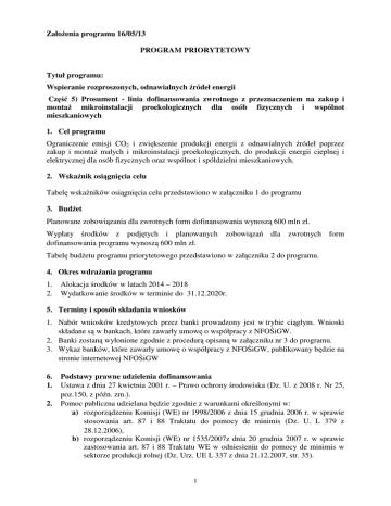 Założenia programu 16/05/13 PROGRAM PRIORYTETOWY Tytuł programu: Wspieranie rozproszonych, odnawialnych źródeł energii Część 5) Prosument - linia dofinansowania zwrotnego z przeznaczeniem na zakup i montaż mikroinstalacji proekologicznych dla osób fizycznych i wspólnot mieszkaniowych 1. Cel programu Ograniczenie emisji CO2 i zwiększenie produkcji energii z odnawialnych źródeł poprzez zakup i montaż małych i mikroinstalacji proekologicznych, do produkcji energii cieplnej i elektrycznej dla osób fizycznych oraz wspólnot i spółdzielni mieszkaniowych. 2. Wskaźnik osiągnięcia celu Tabelę wskaźników osiągnięcia celu przedstawiono w załączniku 1 do programu 3. Budżet Planowane zobowiązania dla zwrotnych form dofinansowania wynoszą 600 mln zł. Wypłaty środków z podjętych i planowanych zobowiązań dla zwrotnych form dofinansowania programu wynoszą 600 mln zł. Tabelę budżetu programu priorytetowego przedstawiono w załączniku 2 do programu. 4. Okres wdrażania programu 1. 2. Alokacja środków w latach 2014 – 2018 Wydatkowanie środków w terminie do 31.12.2020r. 5. Terminy i sposób składania wniosków 1. Nabór wniosków kredytowych przez banki prowadzony jest w trybie ciągłym. Wnioski składane są w bankach, które zawarły umowę o współpracy z NFOŚiGW. 2. Banki zostaną wyłonione zgodnie z procedurą opisaną w załączniku nr 3 do programu. 3. Wykaz banków, które zawarły umowę o współpracy z NFOŚiGW, publikowany będzie na stronie internetowej NFOŚiGW 6. 1. 2. Podstawy prawne udzielenia dofinansowania Ustawa z dnia 27 kwietnia 2001 r. – Prawo ochrony środowiska (Dz. U. z 2008 r. Nr 25, poz.150, z późn. zm.). Pomoc publiczna udzielana będzie zgodnie z warunkami określonymi w: a) rozporządzeniu Komisji (WE) nr 1998/2006 z dnia 15 grudnia 2006 r. w sprawie stosowania art. 87 i 88 Traktatu do pomocy de minimis (Dz. U. L 379 z 28.12.2006), b) rozporządzeniu Komisji (WE) nr 1535/2007z dnia 20 grudnia 2007 r. w sprawie zastosowania art. 87 i 88 Traktatu WE w odniesieniu do pomocy de minimis w sektorze produkcji rolnej (Dz. Urz. UE L 337 z dnia 21.12.2007, str. 35). 1 Wskazane rozporządzenia obowiązują do 31.12.2013 r. Po tym terminie dofinansowanie stanowiące pomoc publiczną będzie udzielane zgodnie z warunkami dopuszczalności pomocy określonymi w przepisach zastępujących dotychczasowe. 7. Szczegółowe zasady udzielenia dofinansowania 7.1 Formy dofinansowania Środki udostępnione bankom na udzielenie kredytów bankowych. 7.2 Intensywność dofinansowania 1) Kredyt bankowy do 100% kosztów kwalifikowanych przedsięwzięcia ze środków udostępnionych bankom przez NFOŚiGW. 2) Wartość pomocy publicznej wynikająca z dofinansowania nie może przekraczać dopuszczalnej wartości pomocy de minimis. 7.3 Warunki dofinansowania 1) Kredyt na realizację przedsięwzięcia udzielany jest przez bank ze środków udostępnionych przez NFOŚiGW; 2) Udostępnienie środków bankowi nastąpi na podstawie umowy o współpracy zawartej z NFOŚiGW; 3) Środki przekazywane będą na wniosek banku, w terminach i na warunkach określonych w umowie o współpracy; 4) Bank ustanawia zabezpieczenie udzielonego kredytu. Bank gwarantuje zwrot środków na rzecz NFOŚiGW w przypadkach określonych w umowie zawartej między NFOŚiGW i bankiem; 5) Maksymalna kwota kredytu - do 100% kosztów kwalifikowanych przedsięwzięcia, o których mowa w ust.7.5 pkt 1 i 2, nie więcej niż: - 100 tys. zł dla osoby fizycznej, - 300 tys.zł dla wspólnoty /spółdzielni mieszkaniowej Łączna kwota kredytu na realizację przedsięwzięcia, o którym mowa w ust.7.5, pkt. 3, nie więcej niż: - 150 tys. zł dla osoby fizycznej, - 400 tys. zł dla wspólnoty /spółdzielni mieszkaniowej; 6) Oprocentowanie kredytu dla kredytobiorcy – 1%; 7) Łączna wysokość prowizji i opłat związanych z kredytem – nie więcej niż 6 % kwoty kredytu, w tym wysokość prowizji za udzielenie kredytu w pierwszym roku nie więcej niż 3%, a pozostała pobierana w kolejnych latach, proporcjonalnie do okresu i kwoty spłacanego kredytu; 8) Maksymalny okres kredytowania wynosi: - 7 lat dla osób fizycznych, - 12 lat dla wspólnot/spółdzielni mieszkaniowych, 9) Maksymalny okres realizacji inwestycji wynosi 18 miesięcy od daty zawarcia umowy kredytu; 10) Maksymalny okres karencji w spłacie kapitału kredytu wynosi 6 miesięcy od daty zakończenia przedsięwzięcia; 2 11) Kontrolę prawidłowości realizacji przedsięwzięcia i wykorzystania środków z kredytu przeprowadza bank; 12) Bank realizuje wszystkie obowiązki organu udzielającego pomocy publicznej, 13) Wymagana jest wysoka jakość instalowanych urządzeń, potwierdzona certyfikatami określonymi w wymaganiach technicznych (Załącznik nr 4 do programu priorytetowego) oraz gwarancja producenta urządzeń na co najmniej 5 lat od daty zakupu. 14) Wymagana jest instalacja liczników energii cieplnej i/lub elektrycznej 15) Dofinansowaniu nie podlegają przedsięwzięcia zrealizowane przed dniem zawarcia umowy kredytu. 16) Na przedsięwzięcie może być udzielony jeden kredyt w ramach programu. 7.4 Beneficjenci prawo do dysponowania budynkiem a) Osoby fizyczne posiadające mieszkalnym/mieszkaniem albo o ile dopuszczają to warunki techniczne, określone dla danego typu źródła , prawo do dysponowania budynkiem mieszkalnym w budowie. b) Wspólnoty mieszkaniowe inwestujące w instalacje proekologiczne we własnych budynkach wielorodzinnych c) Spółdzielnie mieszkaniowe inwestujące w instalacje proekologiczne w zarządzanych przez siebie budynkach wielorodzinnych Przez „dysponowanie” nieruchomością należy rozumieć: a) prawo własności (w tym współwłasność); b) użytkowanie wieczyste. 7.5 Rodzaje przedsięwzięć 1) Zakup i montaż małych i mikroinstalacji odnawialnych źródeł energii do produkcji energii cieplnej i elektrycznej dla budynku mieszkalnego jednorodzinnego lub wielorodzinnego: a) źród