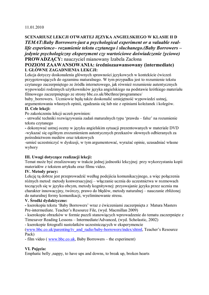 11.01.2010 SCENARIUSZ LEKCJI OTWARTEJ JĘZYKA ANGIELSKIEGO W KLASIE II D TEMAT:Baby Borrowers-just a psychological experiment or a valuable reallife experience– rozumienie tekstu czytanego i słuchanego.(Baby Borrowers – jedynie psychologiczny eksperyment czy wartościowe doświadczenie życiowe) PROWADZĄCY: nauczyciel mianowany Izabela Zacłona POZIOM ZAAWANSOWANIA: średniozaawansowany (intermediate) I. GŁÓWNE ZAGADNIENIA LEKCJI: Lekcja dotyczy doskonalenia głównych sprawności językowych w kontekście ćwiczeń przygotowujących do egzaminu maturalnego. W tym przypadku jest to rozumienie tekstu czytanego zaczerpniętego ze źródła internetowego, jak również rozumienie autentycznych wypowiedzi rodzimych użytkowników języka angielskiego na podstawie krótkiego materiału filmowego zaczerpniętego ze strony bbc.co.uk/bbcthree/programmes/ baby_borrowers. Uczniowie będą także doskonalić umiejętność wypowiedzi ustnej, argumentowania własnych opinii, zgadzania się lub nie z opiniami koleżanek i kolegów. II. Cele lekcji: Po zakończeniu lekcji uczeń powinien: - utrwalić techniki rozwiązywania zadań maturalnych typu ‘prawda – fałsz’ na rozumienie tekstu czytanego - dokonywać ustnej oceny w języku angielskim sytuacji prezentowanych w materiale DVD -wykazać się ogólnym zrozumieniem autentycznych przekazów słownych odbieranych za pośrednictwem mediów oraz tekstowych -umieć uczestniczyć w dyskusji, w tym argumentować, wyrażać opinie, uzasadniać własne wybory III. Uwagi dotyczące realizacji lekcji: Temat może być zrealizowany w trakcie jednej jednostki lekcyjnej przy wykorzystaniu kopii materiałów z tekstem artykułu oraz filmu video. IV. Metody pracy: Lekcję tą dobrze jest przeprowadzić według podejścia komunikacyjnego, a więc połączenia różnych metod: metody konwersacyjnej – włączanie ucznia do uczestnictwa w rozmowach toczących się w języku obcym, metody kognitywnej: przyswajanie języka przez ucznia ma charakter innowacyjny, twórczy, prawo do błędów, metody naturalnej – nauczanie zbliżonej do naturalnej formy komunikacji, wyeliminowanie stresu. V. Środki dydaktyczne: - kserokopia tekstu ‘Baby Borrowers’ wraz z ćwiczeniami zaczerpnięta z Matura Masters Pre-intermediate. Teacher’s Resource File, (wyd. Macmillan 2009) - kserokopie obrazków w formie puzzli stanowiących wprowadzenie do tematu zaczerpnięte z Timesaver Reading Lessons – Intermediate/Advanced, (wyd. Scholastic, 2002) - kserokopie fotografii nastolatków uczestniczących w eksperymencie (www.bbc.co.uk/parenting/tv_and_radio/baby-borrowers/index/shtml, Teacher’s Resource Pack) - film video ( www.bbc.co.uk, Baby Borrowers – the experiment) VI. Pojęcia: Emphatic belly ,nappy, to have ups and downs, to break up, broken hearts VII. Elementy zgodności z podstawą programową: Treści nauczania: - Słownictwo dotyczące życia codziennego - Rozwijanie sprawności mówienia - Rozwijanie sprawności czytania - Rozwijanie integracji sprawności językowych - Uzyskiwanie szerokich umiejętności językowych poprzez kontakt z autentycznymi wypowiedziami ustnymi i pisemnymi z uwzględnieniem różnych rejestrów językowych, stylu formalnego i nieformalnego -Korzystanie z wiedzy i umiejętności nabytych w trakcie nauki pozostałych przedmiotów - Rozwijanie indywidualnych strategii uczenia się VIII. Przebieg lekcji: a) WPROWADZENIE: - nauczyciel dzieli uczniów na trzy grupy. Każda grupa otrzymuje obrazek w formie puzzli, który mają złożyć aby dowiedzieć się jaka tematyka będzie poruszana w trakcie lekcji. - uczniowie wypowiadają się na temat swoich przewidywań (Np. nauka opieki na dzieckiem, wczesne rodzicielstwo, zajęcia szkolne dotyczące nauki opieki nad dzieckiem) - nauczyciel pyta czy uczniowie zdecydowaliby się na eksperyment związany z opieką nad imitacją małego dziecka w formie lalki - krótka wymiana zdań -nauczyciel rozdaje trzem grupom ilustracje przedstawiające zdjęcia par nastolatków wraz z malutkimi dziećmi - zadaję uczniom pytanie czy zamiast lalki zdecydowaliby się na opiekę nad prawdziwym dzieckiem, prosi o uzasadnienie b) ROZWINIĘCIE: ANALIZA TREŚCI EKSPERYMENTU NA PODSTAWIE FILMU DVD ‘BABY BORROWERS’ - uczniowie obejrzą film, którego tematyka opiera się na przewidywaniach z początkowej fazy lekcji. Dzieli uczniów na trzy grupy. Każda z grup ma skupić się na jednym aspekcie całego eksperymentu • Grupa 1: Idea eksperymentu • Grupa 2: Zdania rodziców na temat pożyczania dzieci • Grupa 3: Pary nastolatków biorących udział w eksperymencie: kim są, jakie są, czy ktoś im pomaga w opiece nad dziećmi. - omówienie treści eksperymentu na podstawie filmu ROZUMIENIE TEKSTU CZYTANEGO: - nauczyciel prosi uczniów aby zanim przeczytają artykuł ‘BABY BORROWERS’ wyrazili swoje zdanie na temat nastoletnich par. Do tego celu zaznaczają, z którymi zdaniami zgadzają się, częściowo się zgadzają lub całkowicie się nie zgadzają ( PRACA W PARACH A NASTĘPNIE PORÓWNAWCZA W GRUPACH PO 4 OSOBY) - krótkie omówienie: nauczyciel – uczniowie - nauczyciel prosi uczniów aby na podstawie krótkiego wstępu do artykułu i wiedzy z filmu DVD własnymi słowami zdefiniowali BABY BORROWERS - omówienie: nauczyciel – uczniowie - nauczyciel prosi uczniów aby przeczytali artykuł na temat całego eksperymentu BABY BORROWERS a następnie zdecydowali , które ze zdań pod tekstem są zgodne z treścią tekstu, a które nie, a także wskazali fragment w tekście jeśli zdanie jest fałszywe - uczniowie przypominają technikę rozwiązywania zadań typu PRAWDA-FAŁSZ - realizacja zadania – PRACA INDYWIDUALNA - sprawdzenie poprawności realizacji zadania c) ZAKOŃCZENIE: Nauczyciel prosi uczniów o wyrażenie opinii na temat całego eksperymentu na podstawie pytań (PRACA W PARACH) • Czy BABY BORROWERS to dobry eksperyment i czy chciałbyś wziąć w nim udział? Uzasadnij. • Co sądz