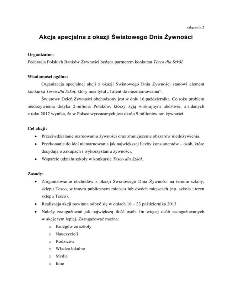 załącznik 2 Akcja specjalna z okazji Światowego Dnia Żywności Organizator: Federacja Polskich Banków Żywności będąca partnerem konkursu Tesco dla Szkół. Wiadomości ogólne: Organizacja specjalnej akcji z okazji Światowego Dnia Żywności stanowi element konkursu Tesco dla Szkół, który nosi tytuł „Talent do niezmarnowania”. Światowy Dzień Żywności obchodzony jest w dniu 16 października. Co roku problem niedożywienia dotyka 2 miliona Polaków, którzy żyją w skrajnym ubóstwie, a z danych z roku 2012 wynika, że w Polsce wyrzucanych jest około 9 milionów ton żywności. Cel akcji: • Przeciwdziałanie marnowaniu żywności oraz zmniejszenie obszarów niedożywienia. • Przekonanie do idei niemarnowania jak największej liczby konsumentów – osób, które decydują o zakupach i wykorzystaniu żywności. • Wsparcie udziału szkoły w konkursie Tesco dla Szkół. Zasady: • Zorganizowanie obchodów z okazji Światowego Dnia Żywności na terenie szkoły, sklepu Tesco, w innym publicznym miejscu lub dwóch miejscach (np. szkoła i teren sklepu Tesco). • Realizacja akcji powinna odbyć się w dniach 16 – 23 października 2013 • Należy zaangażować jak największą ilość osób. Im więcej osób zaangażowanych w akcje tym lepiej. Zaangażować można: o Kolegów ze szkoły o Nauczycieli o Rodziców o Władza lokalne o Media o Inne • Jak zorganizować akcję na terenie sklepu Tesco? o Należy zgłosić się do biura obsługi klienta z informacją, że chce się wykonać akcję i z kierownikiem należy uzgodnić zadany przeprowadzenia akcji (dzień i godziny) • Co można wykonać na potrzeby akcji: o Roznoszenie ulotek o Happening o Flashmob (określenie, którym przyjęło się nazywać sztuczny tłum ludzi gromadzących się niespodziewanie w miejscu publicznym w celu przeprowadzenia krótkotrwałego zdarzenia, zazwyczaj zaskakującego dla przypadkowych świadków). o Inne pomysły osób realizujących akcję • Wykonanie sprawozdania z przebiegu akcji i przekazanie go organizatorowi konkursu na adres [email protected] do dnia 8 listopada 2013 roku. W mali podać należy: o Pełne dane szkoły o Nazwa zespołu o Dane kontaktowe opiekuna o Relacja musi być zawarta w formularzu dostępnym do pobrania ze strony www.tescodlaszkol.pl o Relacja powinna zawierać: Krótki opis (do 500 słów) Maksymalnie 5 zdjęć przedstawiających akcję i wklejonych w plik tekstowy Jedno z tych zdjęć powinno zostać dodatkowo wysłane jako plik .jpg razem z wypełnionym formularzem Ocena prac: • Prace oceniane będą przez specjalistów z Federacji Polskich Banków Żywności • Co będzie brane pod uwagę? o Liczba uczestników obchodów, w tym konsumentów, którzy zetknęli się z akcją o Zaangażowanie dodatkowych partnerów (np. władze, lokalne media) o Kreatywność • Każdy zespół, który weźmie udział w akcji otrzyma 100 punktów do nadesłanego filmu. Punkty zostaną dodane filmom wszystkich zespołów, które prześlą prawidłowe relacje do dnia 8 listopada 2013 r. • Dodatkowo autorzy trzech najlepszych prac otrzymają: o I miejsce – 1 500 punktów o II miejsce – 1 000 punktów o III miejsce – 500 punktów Ogłoszenie wyników: Zwycięzcy zostaną ogłoszeniu na stronie internetowej do dnia 26 listopada 2013 roku.