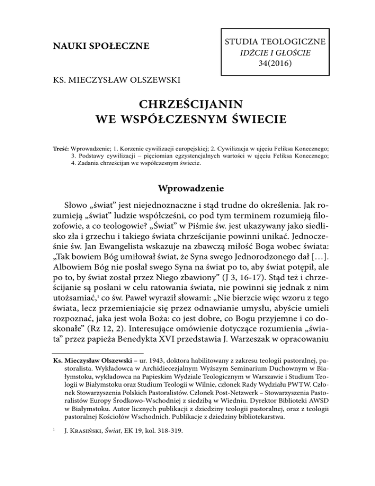 Studia Teologiczne IDŹCIE I GŁOŚCIE 34(2016) Nauki społeczne Ks. Mieczysław Olszewski CHRZEŚCIJANIN WE WSPÓŁCZESNYM ŚWIECIE Treść: Wprowadzenie; 1. Korzenie cywilizacji europejskiej; 2. Cywilizacja w ujęciu Feliksa Konecznego; 3. Podstawy cywilizacji – pięciomian egzystencjalnych wartości w ujęciu Feliksa Konecznego; 4. Zadania chrześcijan we współczesnym świecie. Wprowadzenie Słowo „świat” jest niejednoznaczne i stąd trudne do określenia. Jak rozumieją „świat” ludzie współcześni, co pod tym terminem rozumieją filozofowie, a co teologowie? „Świat” w Piśmie św. jest ukazywany jako siedlisko zła i grzechu i takiego świata chrześcijanie powinni unikać. Jednocześnie św. Jan Ewangelista wskazuje na zbawczą miłość Boga wobec świata: „Tak bowiem Bóg umiłował świat, że Syna swego Jednorodzonego dał […]. Albowiem Bóg nie posłał swego Syna na świat po to, aby świat potępił, ale po to, by świat został przez Niego zbawiony” (J 3, 16-17). Stąd też i chrześcijanie są posłani w celu ratowania świata, nie powinni się jednak z nim utożsamiać,1 co św. Paweł wyraził słowami: „Nie bierzcie więc wzoru z tego świata, lecz przemieniajcie się przez odnawianie umysłu, abyście umieli rozpoznać, jaka jest wola Boża: co jest dobre, co Bogu przyjemne i co doskonałe” (Rz 12, 2). Interesujące omówienie dotyczące rozumienia „świata” przez papieża Benedykta XVI przedstawia J. Warzeszak w opracowaniu Ks. Mieczysław Olszewski – ur. 1943, doktora habilitowany z zakresu teologii pastoralnej, pastoralista. Wykładowca w Archidiecezjalnym Wyższym Seminarium Duchownym w Białymstoku, wykładowca na Papieskim Wydziale Teologicznym w Warszawie i Studium Teologii w Białymstoku oraz Studium Teologii w Wilnie, członek Rady Wydziału PWTW. Członek Stowarzyszenia Polskich Pastoralistów. Członek Post-Netzwerk – Stowarzyszenia Pastoralistów Europy Środkowo-Wschodniej z siedzibą w Wiedniu. Dyrektor Biblioteki AWSD w Białymstoku. Autor licznych publikacji z dziedziny teologii pastoralnej, oraz z teologii pastoralnej Kościołów Wschodnich. Publikacje z dziedziny bibliotekarstwa. 1 J. Krasiński, Świat, EK 19, kol. 318-319. Ks. Mieczysław Olszewski pt. „Spojrzenie Benedykta XVI na świat współczesny” i czyni to w różnych ujęciach: teologicznych, filozoficznych, społecznych.2 Ponadto sam papież Benedykt XVI dostrzega w twórczości św. Jana Pawła II szczególne spojrzenie na świat współczesny: „Jan Paweł II dotykał tych rzeczy, które były zupełnie pomijane w propozycjach współczesnego świata konsumpcji i „przemysłu wolnego czasu”. (…) Dzisiaj wszystko zwraca się w stronę osiągnięcia jak najlepszych rezultatów i coraz większej funkcjonalności. Polityk musi umieć przekazać młodzieńczy zapał w taki sposób, aby wygrać wybory; nowoczesne zawody menedżerskie wymagają dobrej kondycji fizycznej. W dziwny sposób w społeczeństwie, które starzeje się w mgnieniu oka, nieustannie wzrasta kult młodości. Choroby i starość są jak najgłębiej ukrywane. A jednak Jan Paweł II nie ukrywał ich – nie mógł i nie chciał ich ukrywać. Właśnie w ten sposób wypełniał w stosunku do nas swoją wielką misję.”3 Wiadomo też, że świat jakkolwiek rozumiany, kieruje się pewnymi wartościami, mającymi wpływ na życie, na podejmowane decyzje czy to w życiu osobistym, społecznym czy ogólnopaństwowym. Kierowanie się w życiu pewnymi wartościami prowadzi do określenia całościowego tych wartości ujętych w jakiś system, czy też systemy. Systemy te nazywane są przez jednych cywilizacją, przez innych zaś kulturą.4 Samuel Huntington określa cywilizację „najwyższym kulturowym stopniem ugrupowania ludzi i najszerszą płaszczyzną kulturowej tożsamości”.5 Tymczasem uznaną za jedno z ciekawszych określeń cywilizacji, którą żyje i rozwija się społeczność, czy jeszcze bardziej jako naród, jest określenie jej przez Feliksa Konecznego jako metody życia społecznego, w której znajdą się i kultura (piękno) i rozwój techniczny (dobrobyt) i ład społeczny. W niniejszym artykule, pragnącym ukazać „świat współczesny”, który niestety daleko odbiega od wartości pielęgnowanych od zarania istnienia Europy, wyrażane w pojęciu „cywilizacja europejska”, opieram się w znacznej mierze na wstępie Antona Hilckman’a do książki F. Konecznego, On 2 3 4 5 J. Warzseszak, Spojrzenie Benedykta XVI na świat współczesny, Warszawskie Studia teologiczne T. XXVIII/2 2015, s. 19-50. Benedykt XVI, Jan Paweł II. Mój umiłowany Poprzednik, Częstochowa 2007, s. 30-31. Wciąż toczy się dyskusja na temat określenia cywilizacji9, czy wręcz zrównania jej z kulturą. Zob. L. Gawor, Dwie teorie cywilizacji, naturalistyczna Erazma Majewskiego i kulturowa Feliksa Konecznego, w: A. Drabarek (red.), Natura a kultura, Lublin 1995, s. 21-30; J. Skoczyński, Cywilizacja, w: W. Kwaśniewicz, (red.), Encyklopedia socjologii, Warszawa 1998, T. I, s. 101-103; S. Sowiński, Między kulturą a cywilizacją. Pojęcie kultury i cywilizacji w polskiej eurodebacie, Przegląd Europejski 1(2002), s. 192-208. Cytat za: S. Sowiński, Między kulturą a cywilizacją, dz. cyt., s. 193. 360 Chrześcijanin we współczesnym świecie wydanej w Londynie w 1962 roku, omawiającego koncepcję cywilizacji Konecznego. Można jednak dzisiaj dostrzec także u innych autorów znamienne wypowiedzi, według których ze zrozumienia cywilizacji możemy uczyć się dla teraźniejszości: „Wydarzenia z najbliższej przeszłości nie wystarczą jednak, aby wyjaśnić teraźniejszość w całej jej złożoności. Teraźniejszość bowiem na różnych poziomach jest przedłużeniem innych, znacznie bardziej oddalonych w czasie doświadczeń. Żywi się wiekami, które się wypełniły, i całą ewolucją historyczną, jaką przeżyła ludzkość do chwili obecnej”, jak mówi Braude