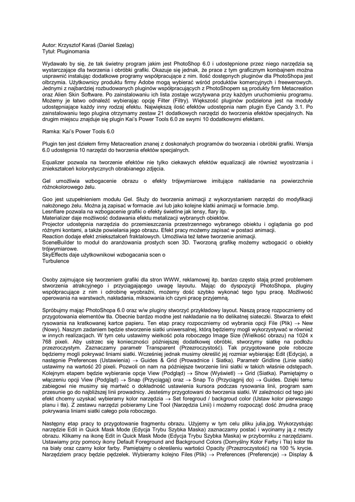 Autor: Krzysztof Karaś (Daniel Szelag) Tytuł: Pluginomania Wydawało by się, że tak świetny program jakim jest PhotoShop 6.0 i udostępnione przez niego narzędzia są wystarczające dla tworzenia i obróbki grafiki. Okazuje się jednak, że prace z tym graficznym kombajnem można usprawnić instalując dodatkowe programy współpracujące z nim. Ilość dostępnych pluginów dla PhotoShopa jest olbrzymia. Użytkownicy produktu firmy Adobe mogą wybierać wśród produktów komercyjnych i freewerowych. Jednymi z najbardziej rozbudowanych pluginów współpracujących z PhotoShopem są produkty firm Metacreation oraz Alien Skin Software. Po zainstalowaniu ich lista zostaje wczytywana przy każdym uruchomieniu programu. Możemy je łatwo odnaleźć wybierając opcję Filter (Filtry). Większość pluginów podzielona jest na moduły udostępniające każdy inny rodzaj efektu. Największą ilość efektów udostępnia nam plugin Eye Candy 3.1. Po zainstalowaniu tego plugina otrzymamy zestaw 21 dodatkowych narzędzi do tworzenia efektów specjalnych. Na drugim miejscu znajduje się plugin Kai’s Power Tools 6.0 ze swymi 10 dodatkowymi efektami. Ramka: Kai’s Power Tools 6.0 Plugin ten jest dziełem firmy Metacreation znanej z doskonałych programów do tworzenia i obróbki grafiki. Wersja 6.0 udostępnia 10 narzędzi do tworzenia efektów specjalnych. Equalizer pozwala na tworzenie efektów nie tylko ciekawych efektów equalizacji ale również wyostrzania i zniekształceń kolorystycznych obrabianego zdjęcia. Gel umożliwia wzbogacenie obrazu o różnokolorowego żelu. efekty trójwymiarowe imitujące nakładanie na powierzchnie Goo jest uzupełnieniem modułu Gel. Służy do tworzenia animacji z wykorzystaniem narzędzi do modyfikacji nałożonego żelu. Można ją zapisać w formacie .avi lub jako kolejne klatki animacji w formacie .bmp. Lesnflare pozwala na wzbogacenie grafiki o efekty świetlne jak lensy, flary itp. Materializer daje możliwość dodawania efektu metalizacji wybranych obiektów. Projector udostępnia narzędzia do przemieszczania przestrzennego wybranego obiektu i oglądania go pod różnymi kontami, a także powielania jego obrazu. Efekt pracy możemy zapisać w postaci animacji. Reaction dodaje efekt zniekształceń fraktalowych. Umożliwia też łatwe tworzenie animacji. SceneBuilder to moduł do aranżowania prostych scen 3D. Tworzoną grafikę możemy wzbogacić o obiekty trójwymiarowe. SkyEffects daje użytkownikowi wzbogacania scen o Turbulence Osoby zajmujące się tworzeniem grafiki dla stron WWW, reklamowej itp. bardzo często stają przed problemem stworzenia atrakcyjnego i przyciągającego uwagę layoutu. Mając do dyspozycji PhotoShopa, pluginy współpracujące z nim i odrobinę wyobraźni, możemy dość szybko wykonać tego typu pracę. Możliwość operowania na warstwach, nakładania, miksowania ich czyni pracę przyjemną. Spróbujmy mając PhotoShopa 6.0 oraz w/w pluginy stworzyć przykładowy layout. Naszą pracę rozpoczniemy od przygotowania elementów tła. Obecnie bardzo modne jest nakładanie na tło delikatnej siateczki. Stwarza to efekt rysowania na kratkowanej kartce papieru. Ten etap pracy rozpoczniemy od wybrania opcji File (Plik) ® New (Nowy). Naszym zadaniem będzie stworzenie siatki uniwersalnej, którą będziemy mogli wykorzystywać w również w innych realizacjach. W tym celu ustawimy wielkość pola roboczego Image Size (Wielkość obrazu) na 1024 x 768 pixeli. Aby ustrzec się konieczności późniejszej dodatkowej obróbki, stworzymy siatkę na podłożu przezroczystym. Zaznaczamy parametr Transparent (Przezroczystość). Tak przygotowane pole robocze będziemy mogli pokrywać liniami siatki. Wcześniej jednak musimy określić jej rozmiar wybierając Edit (Edycja), a następnie Preferences (Ustawienia) ® Guides & Grid (Prowadnice i Siatka). Parametr Gridline (Linie siatki) ustawimy na wartość 20 pixeli. Pozwoli on nam na późniejsze tworzenie linii siatki w takich właśnie odstępach. Kolejnym etapem będzie wybieranie opcje View (Podgląd) ® Show (Wyświetl) ® Grid (Siatka). Pamiętajmy o włączeniu opcji View (Podgląd) ® Snap (Przyciągaj) oraz ® Snap To (Przyciągnij do) ® Guides. Dzięki temu zabiegowi nie musimy się martwić o dokładność ustawienia kursora podczas rysowania linii, program sam przesunie go do najbliższej linii prowadnicy. Jesteśmy przygotowani do tworzenia siatki. W zależności od tego jaki efekt chcemy uzyskać wybieramy kolor narzędzia ® Set foregroud / backgroud color (Ustaw kolor pierwszego planu i tła). Z zestawu narzędzi pobieramy Line Tool (Narzędzia Linii) i możemy rozpocząć dość żmudna pracę pokrywania liniami siatki całego pola roboczego. Następny etap pracy to przygotowanie fragmentu obrazu. Użyjemy w tym celu pliku julia.jpg. Wykorzystując narzędzie Edit in Quick Mask Mode (Edycja Trybu Szybka Maska) zaznaczamy postać i wycinamy ją z reszty obrazu. Klikamy na ikonę Edit in Quick Mask Mode (Edycja Trybu Szybka Maska) w przyborniku z narzędziami. Ustawiamy przy pomocy ikony Default Foreground and Background Colors (Domyślny Kolor Farby i Tła) kolor tła na biały oraz czarny kolor farby. Pamiętajmy o określeniu wartości Opacity (Przezroczystość) na 100 % krycie. Narzędziem pracy będzie pędzelek. Wybieramy kolejno Files (Plik) ® Preferences (Preferencje) ® Display & Cursors (Wyświetlanie i Kursor). Zaznaczając Brush Size w polu Painting Cursors (Kursor Punktowy), określamy wskaźnik myszy jako domyślny rodzaj pędzla. Operacja ta zapewni większą precyzję malowania. następnie malujemy wzdłuż wewnętrznej krawędzi obiektu, który chcemy zaznaczyć. Wypełniamy maski przy pomocy Paint Bucket Tool (Narzędzie Wiaderko z Farbą). Po zakończeniu tego procesu przełączamy się w tryb Standart Mode (Tryb Standardowy) i poleceniem Select (Selekcja) ® Inwerse (Odwrócenie) odwracamy zaznaczenie obiektu. Teraz możemy przystąpić do 