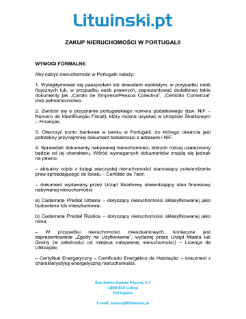 ZAKUP NIERUCHOMOŚCI W PORTUGALII WYMOGI FORMALNE Aby nabyć nieruchomość w Portugalii należy: 1. Wylegitymować się paszportem lub dowodem osobistym, w przypadku osób fizycznych lub, w przypadku osób prawnych, zaprezentować dodatkowo takie dokumenty jak „Cartão de Empresa/Pessoa Colectiva”, „Certidão Comercial” i/lub pełnomocnictwo. 2. Zwrócić się o przyznanie portugalskiego numeru podatkowego (tzw. NIF – Número de Identificação Fiscal), który można uzyskać w Urzędzie Skarbowym – Finanças. 3. Otworzyć konto bankowe w banku w Portugalii, do którego otwarcia jest potrzebny przynajmniej dokument tożsamości z adresem i NIF. 4. Sprawdzić dokumenty nabywanej nieruchomości, których rodzaj uzależniony będzie od jej charakteru. Wśród wymaganych dokumentów znajdą się jednak na pewno: – aktualny odpis z księgi wieczystej nieruchomości stanowiący potwierdzenie praw sprzedającego do lokalu – Certidão de Teor; – dokument wydawany przez Urząd Skarbowy stwierdzający stan finansowy nabywanej nieruchomości: a) Caderneta Predial Urbana – dotyczący nieruchomości sklasyfikowanej jako budowlana lub mieszkaniowa; b) Caderneta Predial Rústica – dotyczący nieruchomości sklasyfikowanej jako rolna; – W przypadku nieruchomości mieszkaniowych, konieczne jest zaprezentowanie „Zgody na Użytkowanie”, wydanej przez Urząd Miasta lub Gminy (w zależności od miejsca nabywanej nieruchomości) – Licença de Utilização; – Certyfikat Energetyczny – Certificado Energético de Habitação – dokument z charakterystyką energetyczną nieruchomości; Rua Mário Gomes Páscoa, 6 C 1600-824 Lisboa Portugalia E-mail: [email protected] – Dowody zapłaty podatku transakcyjnego (IMT) i opłaty skarbowej (IS). 5. Zawrzeć umowę kupna – sprzedaży nieruchomości w postaci aktu notarialnego u notariusza lub w postaci „Documento Particular” u adwokata; 6. Umowa kupna – sprzedaży, sporządzona przez notariusza lub adwokata, powinna zostać zarejestrowana w „Urzędzie Rejestru Nieruchomości” – Conservatória do Registo Predial. 7. Na zadeklarowanie lokalnego podatku od nieruchomości IMI (Imposto Municipal sobre Imóveis) kupujący ma 60 dni od daty podpisania umowy. PROCEDURA 1. Rezerwacja (Contrato de Reserva) Umowa o rezerwację i wpłata kwoty rezerwacji najczęściej ma miejsce w przypadku korzystania z pośrednika nieruchomości. Jej kwota może być różna, od kilkuset euro do kilkudziesięciu tysięcy euro. Powoduje, że zarezerwowana nieruchomość zostaje wycofana z oficjalnej sprzedaży przez pośrednika nieruchomości. W Portugalii zwyczajowo jest ona zwracana, jeśli nie dojdzie do transakcji. 2. Umowa przedwstępna kupna-sprzedaży (Contrato Promessa Compra e Venda) Umowa przedwstępna jest zawierana zwyczajowo na jeden do kilku miesięcy przed realizacją umowy sprzedaży. Przy jej zawarciu dochodzi tez do wpłaty zaliczki, zwykle od 10% do 30% wartości nieruchomości. Umowa określa też datę, którą strony określają jako ostateczną do podpisania umowy kupnasprzedaży. Odstąpienie od umowy przedwstępnej powoduje przepadek kwoty zaliczki, chyba że w samej umowie zastrzeże się pewne sytuacje, np. odmowę finansowania przez bank. 3. Umowa sprzedaży nieruchomości (Escritura) Może zostać podpisana u notariusza (zalecane) lub u adwokata. Wtedy dochodzi do zapłaty reszty kwoty transakcji, opłat notarialnych i podatków od transakcji nieruchomości. Elektroniczna rejestracja tej transakcji w rejestrze nieruchomości następuje w tym samym dniu. Rua Mário Gomes Páscoa, 6 C 1600-824 Lisboa Portugalia E-mail: [email protected] KOSZTY ZAKUPU NIERUCHOMOŚCI W PORTUGALII 1. Podatek od nabywanej nieruchomości – czyli IMT (Imposto Municipal sobre as Transmissões). Dla nieruchomości o wartości powyżej 574.323€ wysokość podatku wynosi 6% od wartości nieruchomości. W przypadku nieruchomości o niższej wartości procent ten jest niższy i zależny od kwoty transakcji. Podatek IMT, dotyczący aktów przekazania praw własności gruntów i budynków sklasyfikowanych jako rolne, wynosi 5%. Pozostałe sytuacje: IMT w wysokości 6,5% lub 10%. 2. Jednorazowa płata skarbowa – IS (Imposto do Selo): 0,8% wartości nabywanej nieruchomości. 3. Lokalny podatek od nieruchomości – czyli IMI (Imposto Municipal sobre Imóveis), jest ustalany przez lokalne urzędy miast i gmin. Maksymalne stawki tego podatku płaconego w relacji do wartości katastralnej nieruchomości (VPT) wynoszą: a) 0,8% od nieruchomości sklasyfikowanych jako rolne; b) zwykle od 0,3% do 0,5% od nieruchomości sklasyfikowanych jako budowlane. 4. Coroczna opłata skarbowa – IS (Imposto do Selo): stawka 1% dla nieruchomości budowlanych o wartości katastralnej nieruchomości (VPT) powyżej 1.000.000€. 5. Taksa notarialna, zwykle mieści się w przedziale od 200€ do 500€. 6. Wynagrodzenie lub też prowizja pośrednika (jeśli kupujący zdecyduje się na jego pomoc): wartość zależna od kwoty transakcji i od konkretnej umowy. 7. Koszty rejestru w „Urzędzie Rejestru Nieruchomości” (Registo Predial): około 250€. Opracował: Tomasz Litwiński, biegły rewident w Portugalii www.litwinski.pt Stan prawny: lipiec 2016 Rua Mário Gomes Páscoa, 6 C 1600-824 Lisboa Portugalia E-mail: [email protected]