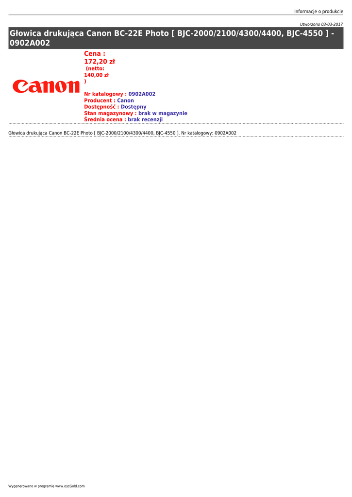 Informacje o produkcie Utworzono 03-03-2017 Głowica drukująca Canon BC-22E Photo [ BJC-2000/2100/4300/4400, BJC-4550 ] 0902A002 Cena : 172,20 zł (netto: 140,00 zł ) Nr katalogowy : 0902A002 Producent : Canon Dostępność : Dostępny Stan magazynowy : brak w magazynie Średnia ocena : brak recenzji Głowica drukująca Canon BC-22E Photo [ BJC-2000/2100/4300/4400, BJC-4550 ]. Nr katalogowy: 0902A002 Wygenerowano w programie www.oscGold.com