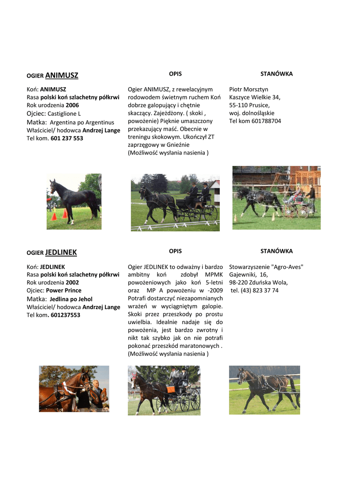 OGIER ANIMUSZ Koń: ANIMUSZ Rasa polski koń szlachetny półkrwi Rok urodzenia 2006 Ojciec: Castiglione L Matka: Argentina po Argentinus Właściciel/ hodowca Andrzej Lange Tel kom. 601 237 553 OGIER JEDLINEK Koń: JEDLINEK Rasa polski koń szlachetny półkrwi Rok urodzenia 2002 Ojciec: Power Prince Matka: Jedlina po Jehol Właściciel/ hodowca Andrzej Lange Tel kom. 601237553 OPIS Ogier ANIMUSZ, z rewelacyjnym rodowodem świetnym ruchem Koń dobrze galopujący i chętnie skaczący. Zajeżdżony. ( skoki , powożenie) Pięknie umaszczony przekazujący maść. Obecnie w treningu skokowym. Ukończył ZT zaprzęgowy w Gnieźnie (Możliwość wysłania nasienia ) OPIS STANÓWKA Piotr Morsztyn Kaszyce Wielkie 34, 55-110 Prusice, woj. dolnośląskie Tel kom 601788704 STANÓWKA Ogier JEDLINEK to odważny i bardzo Stowarzyszenie "Agro-Aves" ambitny koń zdobył MPMK Gajewniki, 16, powożeniowych jako koń 5-letni 98-220 Zduńska Wola, oraz MP A powożeniu w -2009 tel. (43) 823 37 74 Potrafi dostarczyć niezapomnianych wrażeń w wyciągniętym galopie. Skoki przez przeszkody po prostu uwielbia. Idealnie nadaje się do powożenia, jest bardzo zwrotny i nikt tak szybko jak on nie potrafi pokonać przeszkód maratonowych . (Możliwość wysłania nasienia )
