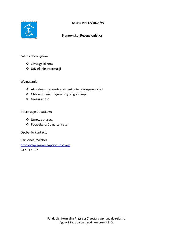 Oferta Nr: 17/2014/W Stanowisko: Recepcjonistka Zakres obowiązków Obsługa klienta Udzielanie informacji Wymagania Aktualne orzeczenie o stopniu niepełnosprawności Mile widziana znajomość j. angielskiego Niekaralność Informacje dodatkowe Umowa o pracę Potrzeba osób na cały etat Osoba do kontaktu Bartłomiej Wróbel [email protected] 537 017 397 Fundacja „Normalna Przyszłość” została wpisana do rejestru Agencji Zatrudnienia pod numerem 8330.