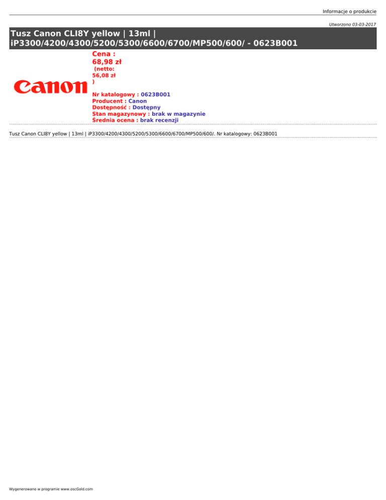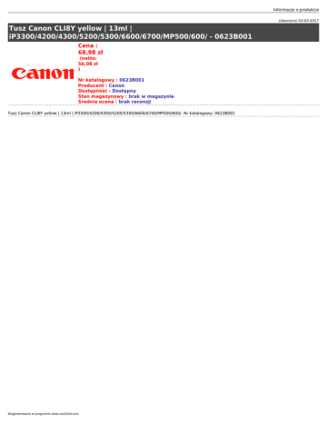 Informacje o produkcie Utworzono 03-03-2017 Tusz Canon CLI8Y yellow | 13ml | iP3300/4200/4300/5200/5300/6600/6700/MP500/600/ - 0623B001 Cena : 68,98 zł (netto: 56,08 zł ) Nr katalogowy : 0623B001 Producent : Canon Dostępność : Dostępny Stan magazynowy : brak w magazynie Średnia ocena : brak recenzji Tusz Canon CLI8Y yellow | 13ml | iP3300/4200/4300/5200/5300/6600/6700/MP500/600/. Nr katalogowy: 0623B001 Wygenerowano w programie www.oscGold.com