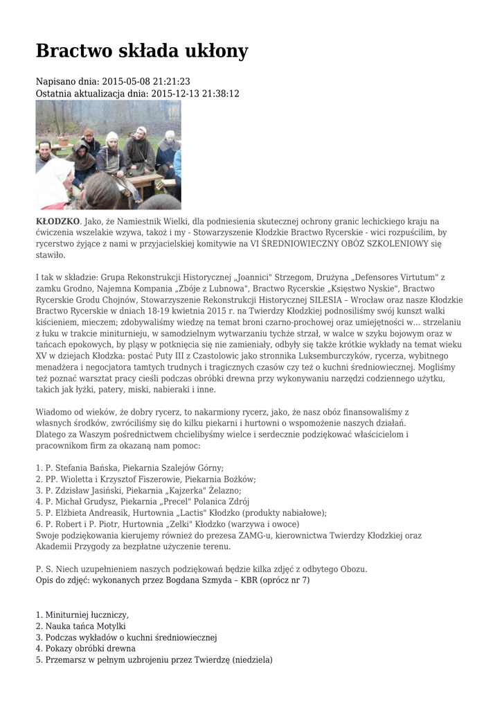 Bractwo składa ukłony Napisano dnia: 2015-05-08 21:21:23 Ostatnia aktualizacja dnia: 2015-12-13 21:38:12 KŁODZKO. Jako, że Namiestnik Wielki, dla podniesienia skutecznej ochrony granic lechickiego kraju na ćwiczenia wszelakie wzywa, takoż i my - Stowarzyszenie Kłodzkie Bractwo Rycerskie - wici rozpuścilim, by rycerstwo żyjące z nami w przyjacielskiej komitywie na VI ŚREDNIOWIECZNY OBÓZ SZKOLENIOWY się stawiło. I tak w składzie: Grupa Rekonstrukcji Historycznej „Joannici" Strzegom, Drużyna „Defensores Virtutum" z zamku Grodno, Najemna Kompania „Zbóje z Lubnowa", Bractwo Rycerskie „Księstwo Nyskie", Bractwo Rycerskie Grodu Chojnów, Stowarzyszenie Rekonstrukcji Historycznej SILESIA – Wrocław oraz nasze Kłodzkie Bractwo Rycerskie w dniach 18-19 kwietnia 2015 r. na Twierdzy Kłodzkiej podnosiliśmy swój kunszt walki kiścieniem, mieczem; zdobywaliśmy wiedzę na temat broni czarno-prochowej oraz umiejętności w… strzelaniu z łuku w trakcie miniturnieju, w samodzielnym wytwarzaniu tychże strzał, w walce w szyku bojowym oraz w tańcach epokowych, by pląsy w potknięcia się nie zamieniały, odbyły się także krótkie wykłady na temat wieku XV w dziejach Kłodzka: postać Puty III z Czastolowic jako stronnika Luksemburczyków, rycerza, wybitnego menadżera i negocjatora tamtych trudnych i tragicznych czasów czy też o kuchni średniowiecznej. Mogliśmy też poznać warsztat pracy cieśli podczas obróbki drewna przy wykonywaniu narzędzi codziennego użytku, takich jak łyżki, patery, miski, nabieraki i inne. Wiadomo od wieków, że dobry rycerz, to nakarmiony rycerz, jako, że nasz obóz finansowaliśmy z własnych środków, zwróciliśmy się do kilku piekarni i hurtowni o wspomożenie naszych działań. Dlatego za Waszym pośrednictwem chcielibyśmy wielce i serdecznie podziękować właścicielom i pracownikom firm za okazaną nam pomoc: 1. P. Stefania Bańska, Piekarnia Szalejów Górny; 2. PP. Wioletta i Krzysztof Fiszerowie, Piekarnia Bożków; 3. P. Zdzisław Jasiński, Piekarnia „Kajzerka" Żelazno; 4. P. Michał Grudysz, Piekarnia „Precel" Polanica Zdrój 5. P. Elżbieta Andreasik, Hurtownia „Lactis" Kłodzko (produkty nabiałowe); 6. P. Robert i P. Piotr, Hurtownia „Zelki" Kłodzko (warzywa i owoce) Swoje podziękowania kierujemy również do prezesa ZAMG-u, kierownictwa Twierdzy Kłodzkiej oraz Akademii Przygody za bezpłatne użyczenie terenu. P. S. Niech uzupełnieniem naszych podziękowań będzie kilka zdjęć z odbytego Obozu. Opis do zdjęć: wykonanych przez Bogdana Szmyda – KBR (oprócz nr 7) 1. Miniturniej łuczniczy, 2. Nauka tańca Motylki 3. Podczas wykładów o kuchni średniowiecznej 4. Pokazy obróbki drewna 5. Przemarsz w pełnym uzbrojeniu przez Twierdzę (niedziela) 6. Szkolenie z obsługi broni czarno-prochowej 7. Uroczyste wręczanie nominacji nowym członkom Bractwa - foto: Ewelina Rusin-Kozub - BR „Księstwo Nyskie" 8. Zdjęcie grupowe - niedziela Bogdan Szmyd E-mail: [email protected] Sekretarz Stowarzyszenia lub [email protected] Kłodzkie Bractwo Rycerskie
