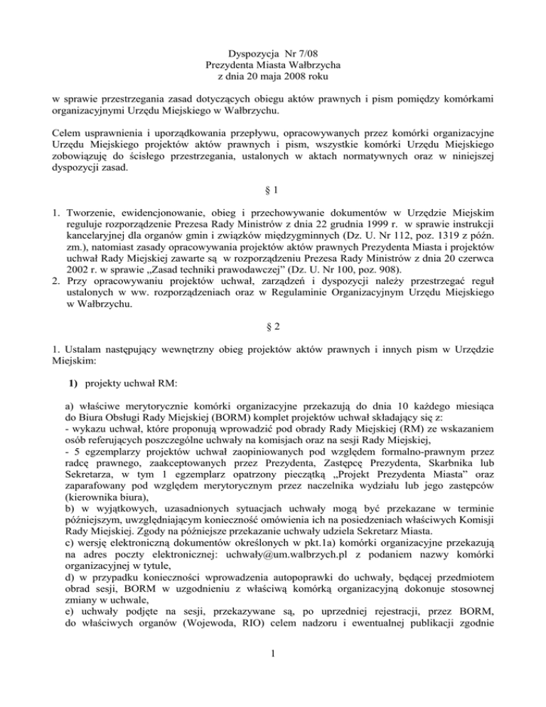 Dyspozycja Nr 7/08 Prezydenta Miasta Wałbrzycha z dnia 20 maja 2008 roku w sprawie przestrzegania zasad dotyczących obiegu aktów prawnych i pism pomiędzy komórkami organizacyjnymi Urzędu Miejskiego w Wałbrzychu. Celem usprawnienia i uporządkowania przepływu, opracowywanych przez komórki organizacyjne Urzędu Miejskiego projektów aktów prawnych i pism, wszystkie komórki Urzędu Miejskiego zobowiązuję do ścisłego przestrzegania, ustalonych w aktach normatywnych oraz w niniejszej dyspozycji zasad. §1 1. Tworzenie, ewidencjonowanie, obieg i przechowywanie dokumentów w Urzędzie Miejskim reguluje rozporządzenie Prezesa Rady Ministrów z dnia 22 grudnia 1999 r. w sprawie instrukcji kancelaryjnej dla organów gmin i związków międzygminnych (Dz. U. Nr 112, poz. 1319 z późn. zm.), natomiast zasady opracowywania projektów aktów prawnych Prezydenta Miasta i projektów uchwał Rady Miejskiej zawarte są w rozporządzeniu Prezesa Rady Ministrów z dnia 20 czerwca 2002 r. w sprawie „Zasad techniki prawodawczej” (Dz. U. Nr 100, poz. 908). 2. Przy opracowywaniu projektów uchwał, zarządzeń i dyspozycji należy przestrzegać reguł ustalonych w ww. rozporządzeniach oraz w Regulaminie Organizacyjnym Urzędu Miejskiego w Wałbrzychu. §2 1. Ustalam następujący wewnętrzny obieg projektów aktów prawnych i innych pism w Urzędzie Miejskim: 1) projekty uchwał RM: a) właściwe merytorycznie komórki organizacyjne przekazują do dnia 10 każdego miesiąca do Biura Obsługi Rady Miejskiej (BORM) komplet projektów uchwał składający się z: - wykazu uchwał, które proponują wprowadzić pod obrady Rady Miejskiej (RM) ze wskazaniem osób referujących poszczególne uchwały na komisjach oraz na sesji Rady Miejskiej, - 5 egzemplarzy projektów uchwał zaopiniowanych pod względem formalno-prawnym przez radcę prawnego, zaakceptowanych przez Prezydenta, Zastępcę Prezydenta, Skarbnika lub Sekretarza, w tym 1 egzemplarz opatrzony pieczątką „Projekt Prezydenta Miasta” oraz zaparafowany pod względem merytorycznym przez naczelnika wydziału lub jego zastępców (kierownika biura), b) w wyjątkowych, uzasadnionych sytuacjach uchwały mogą być przekazane w terminie późniejszym, uwzględniającym konieczność omówienia ich na posiedzeniach właściwych Komisji Rady Miejskiej. Zgody na późniejsze przekazanie uchwały udziela Sekretarz Miasta. c) wersję elektroniczną dokumentów określonych w pkt.1a) komórki organizacyjne przekazują na adres poczty elektronicznej: uchwał[email protected] z podaniem nazwy komórki organizacyjnej w tytule, d) w przypadku konieczności wprowadzenia autopoprawki do uchwały, będącej przedmiotem obrad sesji, BORM w uzgodnieniu z właściwą komórką organizacyjną dokonuje stosownej zmiany w uchwale, e) uchwały podjęte na sesji, przekazywane są, po uprzedniej rejestracji, przez BORM, do właściwych organów (Wojewoda, RIO) celem nadzoru i ewentualnej publikacji zgodnie 1 z obowiązującymi uregulowaniami oraz merytorycznym komórkom celem realizacji. Komplet uchwał podjętych na sesji Biuro Obsługi Rady Miejskiej przekazuje również do Działu Organizacyjnego i Jakości do wiadomości oraz pocztą elektroniczną celem publikacji w BIP, f) gminne jednostki organizacyjne opracowują uchwały przy współudziale merytorycznych komórek organizacyjnych Urzędu Miejskiego, g) w przypadku podjętych w stosunku do uchwał w trybie nadzoru rozstrzygnięć nadzorczych i sygnalizacji, zobowiązuje się BORM do niezwłocznego przekazywania ich do Biura Prawnego, właściwych komórek organizacyjnych oraz Działu Organizacyjnego i Jakości, który dokonuje aktualizacji odnośnych informacji w BIP. 2) Zarządzenia i dyspozycje Prezydenta Miasta: a) projekty zarządzeń i dyspozycji Prezydenta opracowane przez merytoryczne komórki organizacyjne, parafowane są pod względem merytorycznym przez naczelników wydziałów lub ich zastępców (kierowników biur), b) po podpisaniu projektu zarządzenia pod względem formalno – prawnym przez radcę prawnego, przedkładane są one do Działu Organizacyjnego i Jakości, który dla każdego projektu zarządzenia prowadzi tzw. metryczkę, na której odnotowuje: - datę wpływu projektu zarządzenia lub dyspozycji do Działu Organizacyjnego i Jakości, - datę przekazania przez DOiJ do Kancelarii Prezydenta Miasta, która przekazuje projekt aktu prawnego Prezydentowi Miasta do podpisu, c) po podpisaniu aktu prawnego Prezydenta (zarządzenia, dyspozycji), Kancelaria Prezydenta przekazuje go niezwłocznie do Działu Organizacyjnego i Jakości, gdzie następuje jego rejestracja oraz przekazanie do komórki merytorycznej odpowiedzialnej za jego realizację, d) właściwe komórki organizacyjne odpowiedzialne za realizację zarządzeń i dyspozycji przekazują je osobom zainteresowanym. 3) Interpelacje, wnioski i zapytania: a) interpelacje, wnioski i zapytania ewidencjonowane są w BORM, do którego należy niezwłoczne przekazywanie ich do merytorycznych komórek organizacyjnych z wiadomością do – Kancelarii Prezydenta, b) naczelnicy wydziałów i kierownicy biur przygotowują projekty odpowiedzi, które po zaparafowaniu przedkładają do podpisania przez resortowych Zastępców Prezydenta, Sekretarza lub Skarbnika, c) po podpisaniu odpowiedzi merytoryczne komórki organizacyjne przedkładają je do BORM oraz do Działu Organizacyjnego i Jakości, d) treść odpowiedzi na wskazane przez Kierownika Kancelarii Prezydenta interpelacje, wnioski i zapytania przed ich przekazaniem zainteresowanym, winna być z nim uzgadniana, e) termin przekazania odpowiedzi na interpelacje radnych wynosi 21 dni, f) termin przekazania odpowiedzi na wnioski i zapytania radnych wynosi 14 dni. 4) Skargi i wnioski mieszkańców : a) skargi i wnioski skierowane bezpośrednio do właściwych komórek organizacyjnych, naczelnicy wydziałów lub kierownicy biur winni niezwłocznie zarejestrować w centralnym rejestrze skarg