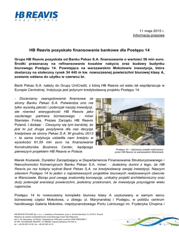 11 maja 2015 r. Informacja prasowa HB Reavis pozyskało finansowanie bankowe dla Postępu 14 Grupa HB Reavis pozyskała od Banku Pekao S.A. finansowanie o warto ci 58 mln euro. rodki przeznaczy na refinansowanie kosztów nabycia oraz budowy budynku biurowego Postępu 14. Powstająca na warszawskim Mokotowie inwestycja, która dostarczy na stołeczny rynek 34 445 m kw. nowoczesnej powierzchni biurowej klasy A, zostanie oddana do użytku w czerwcu br. Bank Pekao S.A. należy do Grupy UniCredit, z którą HB Reavis od wielu lat współpracuje w Europie Centralnej. Instytucja jest jedynym kredytodawcą projektu Postępu 14. - Doceniamy zaangażowanie finansowe ze strony Banku Pekao S.A. Potwierdza ono nie tylko wysoką jakość i potencjał naszej inwestycji, ale również wiarygodność HB Reavis jako zaufanego partnera biznesowego - mówi Stanislav Frnka, Prezes Zarządu HB Reavis Poland. I dodaje: - Cieszymy się tym bardziej, że jest to już druga pozytywna dla nas decyzja kredytowa ze strony Pekao S.A. W grudniu 2013 r. ta sama instytucja udzieliła nam kredytu w wysokości 61,55 mln euro na finansowanie Konstruktorska Business Center, będącego pierwszym projektem HB Reavis w Polsce. Postępu 14 – najnowszy projekt realizowany przez HB Reavis na warszawskim Mokotowie Marek Koziarek, Dyrektor Zarządzający w Departamencie Finansowania Strukturyzowanego i Nieruchomo ci Komercyjnych Banku Pekao S.A. mówiŚ - Jesteśmy dumni z tego, że HB Reavis po raz kolejny wybrał Bank Pekao S.A. na kredytodawcę swojej inwestycji. Naszym zdaniem Postępu 14 to jeden z najciekawszych projektów biurowych realizowanych obecnie w Warszawie. Biorąc pod uwagę znakomitą koncepcję, unikalny projekt architektoniczny oraz duży potencjał aranżacji powierzchni, jesteśmy przekonani, że inwestycja przyciągnie wielu najemców. Postępu 14 to nowoczesny kompleks biurowy klasy A usytuowany w samym sercu biznesowej czę ci Mokotowa, u zbiegu ul. Marynarskiej i Postępu, w pobliżu centrum handlowego Galeria Mokotów, międzynarodowego Portu Lotniczego im. Fryderyka Chopina i HB REAVIS POLAND Sp. z o.o., z siedzibą w Warszawie, przy ul. Konstruktorskiej 13, 02-673, Poland Wpisana do rejestru przedsiębiorców prowadzonego przez Sąd Rejonowy dla m. St. Warszawy, XII Wydz. Gospodarczy KRS pod numerem KRS 0000309617, Nr NIPŚ 5272580238, REGONŚ 141488564, kapitał zakładowy 50 000 zł. tel.: +48-22-203 44 20, fax: +48-22-203 44 21 www.hbreavis.com południowej obwodnicy Warszawy. Ogromnym atutem projektu jest strategiczna lokalizacja w bezpo rednim sąsiedztwie licznych przystanków autobusowych i tramwajowych oraz nieopodal stacji szybkiej kolei miejskiej (SKM). Dodatkowo, położenie inwestycji bezpo rednio przy ruchliwej arterii komunikacyjnej zapewni najemcom optymalną ekspozycję ich logotypów. Zarówno projekt, jak i sama budowa zostały zaplanowane tak, aby spełniały wymogi najwyższego poziomu wiadectwa ekologicznego – BREEAM Excellent. Postępu 14 jest drugą – po oddanym do użytku w marcu 2013 r. kompleksie Konstruktorska Business Center – inwestycją HB Reavis na warszawskim Mokotowie i jednocze nie trzecim projektem realizowanym przez dewelopera w Warszawie. Firma HB Reavis działa w Polsce od 2008 r. W ciągu zaledwie kliku lat stała się jednym z najbardziej aktywnych deweloperów w Warszawie. Potwierdzeniem jej znaczącej pozycji na polskim rynku nieruchomo ci komercyjnych są liczne wyróżnienia, w tym m.in. tytuł „Dewelopera Roku 2015” w konkursie CEE Quality Awards, „Dewelopera Roku w Europie rodkowo-Wschodniej” w prestiżowym Eurobuild Awards, czy „Najlepszego Inwestora Roku z regionu CEE” w ramach FDI Poland Investor Awards. Dotychczas spółka dostarczyła na stołeczny rynek ponad 95 000 m kw. nowoczesnej powierzchni biurowej zlokalizowanej w ramach dwóch kompleksówŚ Konstruktorska Business Center i Gdański Business Center I. Trzy następne projekty o łącznej powierzchni przekraczającej 154 000 m kw. są obecnie w trakcie realizacji. O grupie HB Reavis HB Reavis to międzynarodowa grupa deweloperska założona w 1993 roku w Bratysławie, działająca na kluczowych rynkach Europy rodkowo-Wschodniej (Polska, Czechy, Słowacja, Węgry) oraz w Wielkiej Brytanii i Turcji. Dotychczas grupa zrealizowała 750 000 m kw. nowoczesnej powierzchni biurowej, handlowo-rozrywkowej i logistycznej, a kolejny 1 milion m kw. znajduje się obecnie w realizacji lub w procesach przygotowawczych. HB Reavis wykorzystuje zintegrowany model biznesu, który obejmuje działania deweloperskie i wykonawcze oraz zarządzanie majątkiem i inwestycjami. W całej Europie Grupa zatrudnia ponad 400 osób oraz dysponuje aktywami w wysoko ci 1,8 miliarda euro, o warto ci netto na poziomie 964 milionów euro, co zapewnia jej silną pozycję rynkową. Więcej informacji znajduje się na stronie internetowej http://www.hbreavis.com. Informacje dla mediówŚ Monika Kalinowska PR Manager HB Reavis E-mail: [email protected] Kom.: +48 696 803 116 Magdalena Sobota Senior Account Manager Grayling E-mail: [email protected] Kom.: +48 609 099 041 HB REAVIS POLAND Sp. z o.o., z siedzibą w Warszawie, przy ul. Konstruktorskiej 13, 02-673, Poland Wpisana do rejestru przedsiębiorców prowadzonego przez Sąd Rejonowy dla m. St. Warszawy, XII Wydz. Gospodarczy KRS pod numerem KRS 0000309617, Nr NIPŚ 5272580238, REGONŚ 141488564, kapitał zakładowy 50 000 zł. tel.: +48-22-203 44 20, fax: +48-22-203 44 21 www.hbreavis.com