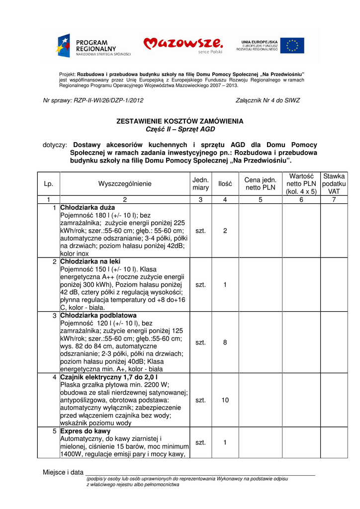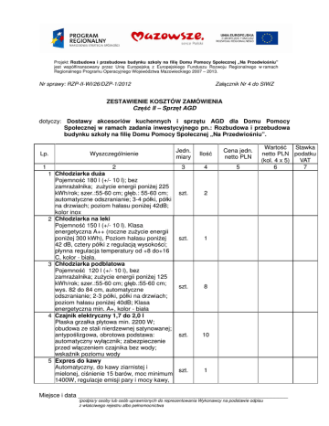 Projekt: Rozbudowa i przebudowa budynku szkoły na fili Domu Pomocy Społecznej „Na Przedwio niu” jest współfinansowany przez Uni Europejsk z Europejskiego Funduszu Rozwoju Regionalnego w ramach Regionalnego Programu Operacyjnego Województwa Mazowieckiego 2007 – 2013. Nr sprawy: RZP-II-WI/26/DZP-1/2012 Zał cznik Nr 4 do SIWZ ZESTAWIENIE KOSZTÓW ZAMÓWIENIA Cz II – Sprz t AGD dotyczy: Dostawy akcesoriów kuchennych i sprz tu AGD dla Domu Pomocy Społecznej w ramach zadania inwestycyjnego pn.: Rozbudowa i przebudowa budynku szkoły na fili Domu Pomocy Społecznej „Na Przedwio niu”. Lp. 1 Wyszczególnienie 2 1 Chłodziarka du a Pojemno 180 l (+/- 10 l); bez zamra alnika; zu ycie energii poni ej 225 kWh/rok; szer.:55-60 cm; gł b.: 55-60 cm; automatyczne odszranianie; 3-4 półki, półki na drzwiach; poziom hałasu poni ej 42dB; kolor inox 2 Chłodziarka na leki Pojemno 150 l (+/- 10 l). Klasa energetyczna A++ (roczne zu ycie energii poni ej 300 kWh), Poziom hałasu poni ej 42 dB, cztery półki z regulacj wysoko ci; płynna regulacja temperatury od +8 do+16 C, kolor - biała. 3 Chłodziarka podblatowa Pojemno 120 l (+/- 10 l), bez zamra alnika; zu ycie energii poni ej 125 kWh/rok; szer.:55-60 cm; gł b.:55-60 cm; wys. 82 do 84 cm, automatyczne odszranianie; 2-3 półki, półki na drzwiach; poziom hałasu poni ej 40dB; Klasa energetyczna min. A+, kolor - biała 4 Czajnik elektryczny 1,7 do 2,0 l Płaska grzałka płytowa min. 2200 W; obudowa ze stali nierdzewnej satynowanej; antypo lizgowa, obrotowa podstawa: automatyczny wył cznik; zabezpieczenie przed wł czeniem czajnika bez wody; wska nik poziomu wody 5 Expres do kawy Automatyczny, do kawy ziarnistej i mielonej, ci nienie 15 barów, moc minimum 1400W, regulacje emisji pary i mocy kawy, Jedn. miary Ilo 3 4 szt. 2 szt. 1 szt. 8 szt. 10 szt. 1 Cena jedn. netto PLN 5 Warto Stawka netto PLN podatku (kol. 4 x 5) VAT 6 7 Miejsce i data ______________________________________________________________ (podpis/y osoby lub osób uprawnionych do reprezentowania Wykonawcy na podstawie odpisu z wła ciwego rejestru albo pełnomocnictwa Nr sprawy: RZP-II-WI/26/DZP-1/2012 Zał cznik Nr 4 do SIWZ młynek, dysza do spieniania mleka, sterowanie elektroniczne, automatyczny program czyszczenia i odkamieniania wody, płyta podgrzewaj ca fili anki 6 Gofrownica Wbudowany termostat za pomoc którego, temperatura ustawia si automatycznie. szt. 2 Wbudowana lampka kontrolna temperatury. Lampka kontrolna pracy. Trzy pary wymiennych pokrytych teflonem płyt 7 Krajalnica do pieczywa wydajno 150 bochenków na godzin , szt. 1 grubo kromek 11 mm , zasilanie 230V 8 Krajalnica do w dlin i serów Profesjonalna krajalnica automatyczna uniwersalna zarówno do w dlin jak i do szt. 1 serów ,nó , pokrywa no a i płyta oporowa pokryta teflonem, zwi kszona moc nap du umo liwiaj ca niezawodne krojenie sera 9 Kuchenka mikrofalowa Obudowa stal nierdzewna. Pojemno od 25 l do 27 l; Funkcje: gotowanie, szt. 7 podgrzewanie, rozmra anie, grill. Moc: mikrofal minimum 900W, grilla minimum 1200W; bez talerza obrotowego; 10 Malakser Profesjonalny malakser o mocy minimum1300 WAT napi cie trójfazowe 400V dwie pr dko ci 1500 obrotów / minut 3000 obrotów/minut , podstawa silnika z kpl. 1 metalu, pojemnik od 5 l do 6 l ze stali nierdzewnej z uchwytem wraz z dodatkowym no em z z bami i no em z naci ciami 11 Maszyna do zagniatania ciasta z mis Profesjonalny mikser planetarny podłogowy, dzie a o pojemno ci od 40l do 42 l ze stali nierdzewnej, trzy mieszadła, niedemontowana osłona bezpiecze stwa kpl. 1 (stal nierdzewna) funkcja mi kkiego opuszczania dzie y, wyposa ony w timer i wył cznik bezpiecze stwa, płynna r czna regulacja pr dko ci obrotowej narz dzia 12 Maszyna wieloczynno ciowa – wilk do mi sa Moc znamionowa do pracy ci głej kW 0,80, rodzaj wyj cia nap du poziome, regulacja obrotów bezstopniowa, obroty wyj ciowe (obr/min) 50-260 napi cie 230V. kpl. 1 NIEZB DNE PRZYSTAWKI: 1. Maszyna do mi sa stal nierdzewna , wydajno 60-120 kg/h z pier cieniem tn cym - szarpak, nó dwustronnego ci cia, sitko z otworami 2mm + 3mm + 4,5 mm + 6mm + 8mm + 13mm Miejsce i data ______________________________________________________________ (podpis/y osoby lub osób uprawnionych do reprezentowania Wykonawcy na podstawie odpisu z wła ciwego rejestru albo pełnomocnictwa 2/4 Nr sprawy: RZP-II-WI/26/DZP-1/2012 2. Rozdrabniarka do warzyw wraz z tarczami do : -plastry (regulowana grubo od 1 do 10mm) -miazga (ucieranie -miazga + wiórki -wiórki 1,5 mm -wiórki 5 mm -wiórki 12 mm -paski 4 mm regulowana grubo od 1 do 8 mm 3. Mieszarka do ubijania piany, mietany, majonezu, kremów; masa ciasta ci kiego od 1 do 2,5 kg, ubijanie mietany od 4-6 minut, pojemno ci misy 10-11 litrów obowi zkowo pokrywa pojemnika 13 Mikser r czny automatyczne utrzymanie pr dko ci, moc 400WAT, napi cie 230V; pr dko zmienna od 1500 do 9000 obr/min. dla no a; od 250 do 1500 obr/min dla trzepaczki; nó dzwon, trzepaczka i podstawa ze stali nierdzewnej; podstawa wyposa ona w system szczelno ci na trzech poziomach + jedno mocowanie cienne ze stali nierdzewnej + uniwersalne mocowanie do pojemnika ze stali nierdzewnej do wszystkich naczy 14 Odkurzacz pokojowy Moc silnika minimum 1400 W; Pojemno worka 3 litry (+/- 0,3 l); Długo przewodu 9 m (+/- 1m) - zwijany do wewn trz; elektroniczna regulacja siły ssania; rura teleskopowa metalowa 15 Sokowirówka Profesjonalna sokowirówka. Automatyczny otwór wsadowy, moc minimum 700 WAT pr dko minimum 300 obrotów na minut , silnik asynchroniczny, ci głe odrzucanie odpadów, przerób do 110 kg na godzin , kosz wiruj cy z tarcz rozdrabniaj c i filtrem ze stali nierdzewnej, pojemnik ze stali nierdzewnej, pojemnik na odpadki 16 Termometr do lodówki termometr lodówkowy, oprawa stal nierdzewna 18/10; uchwyt umo liwiaj cy zawieszenie, zakres temperatury od - 40 stopni C do + 40 stopni C 17 Termometr elektroniczny do gł bokiego tłuszczu termometr do gł bokiego tłuszczu, stal nierdzewn