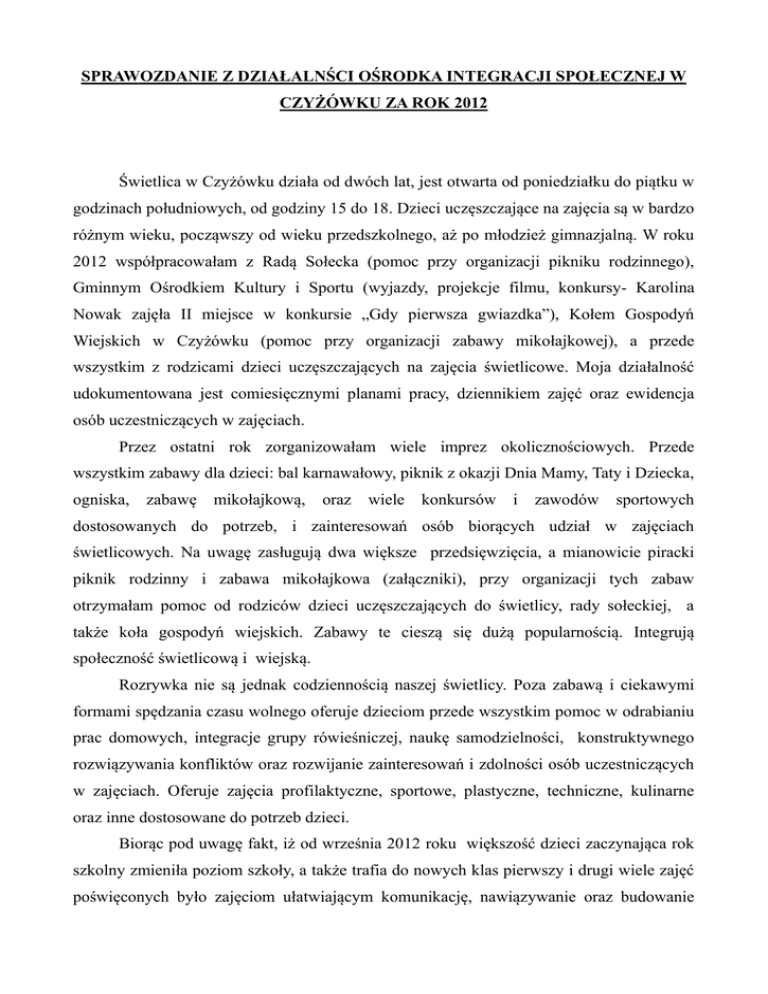 SPRAWOZDANIE Z DZIAŁALNŚCI OŚRODKA INTEGRACJI SPOŁECZNEJ W CZYŻÓWKU ZA ROK 2012 Świetlica w Czyżówku działa od dwóch lat, jest otwarta od poniedziałku do piątku w godzinach południowych, od godziny 15 do 18. Dzieci uczęszczające na zajęcia są w bardzo różnym wieku, począwszy od wieku przedszkolnego, aż po młodzież gimnazjalną. W roku 2012 współpracowałam z Radą Sołecka (pomoc przy organizacji pikniku rodzinnego), Gminnym Ośrodkiem Kultury i Sportu (wyjazdy, projekcje filmu, konkursy- Karolina Nowak zajęła II miejsce w konkursie „Gdy pierwsza gwiazdka”), Kołem Gospodyń Wiejskich w Czyżówku (pomoc przy organizacji zabawy mikołajkowej), a przede wszystkim z rodzicami dzieci uczęszczających na zajęcia świetlicowe. Moja działalność udokumentowana jest comiesięcznymi planami pracy, dziennikiem zajęć oraz ewidencja osób uczestniczących w zajęciach. Przez ostatni rok zorganizowałam wiele imprez okolicznościowych. Przede wszystkim zabawy dla dzieci: bal karnawałowy, piknik z okazji Dnia Mamy, Taty i Dziecka, ogniska, zabawę mikołajkową, oraz wiele konkursów i zawodów sportowych dostosowanych do potrzeb, i zainteresowań osób biorących udział w zajęciach świetlicowych. Na uwagę zasługują dwa większe przedsięwzięcia, a mianowicie piracki piknik rodzinny i zabawa mikołajkowa (załączniki), przy organizacji tych zabaw otrzymałam pomoc od rodziców dzieci uczęszczających do świetlicy, rady sołeckiej, a także koła gospodyń wiejskich. Zabawy te cieszą się dużą popularnością. Integrują społeczność świetlicową i wiejską. Rozrywka nie są jednak codziennością naszej świetlicy. Poza zabawą i ciekawymi formami spędzania czasu wolnego oferuje dzieciom przede wszystkim pomoc w odrabianiu prac domowych, integracje grupy rówieśniczej, naukę samodzielności, konstruktywnego rozwiązywania konfliktów oraz rozwijanie zainteresowań i zdolności osób uczestniczących w zajęciach. Oferuje zajęcia profilaktyczne, sportowe, plastyczne, techniczne, kulinarne oraz inne dostosowane do potrzeb dzieci. Biorąc pod uwagę fakt, iż od września 2012 roku większość dzieci zaczynająca rok szkolny zmieniła poziom szkoły, a także trafia do nowych klas pierwszy i drugi wiele zajęć poświęconych było zajęciom ułatwiającym komunikację, nawiązywanie oraz budowanie kontaktów społecznych, integracje grupy. Wśród rówieśników niezwykle istotna jest asertywność, dlatego proponowałam dzieciom zajęcia gdzie ćwiczyliśmy umiejętność mówienia „nie”, konstruktywne rozwiązywanie konfliktów, a także mówiliśmy o pułapkach i szkodliwości substancji uzależniających. Zajęcia te były prowadzone przez cały okres wakacyjny, a także w tygodniach, w których dzieci powróciły do szkół. Świetlica jest miejscem gdzie powinniśmy chętnie przebywać, więc w planowaniu zajęć staram się brać pod uwagę własne pomysły dzieci, dużą popularnością cieszą się zajęcia kulinarne. Zajęcia profilaktyczne, dla uatrakcyjnienia ich, staram się organizować w formach zabaw, gier czy konkurencji. Często w nich powracamy do tematyki alkoholowej, nikotynowej, a także zdrowotnej. W grupie rówieśniczej uczęszczającej do świetlicy dostrzegalna jest dość silna rywalizacja i konflikty na tym punkcie, dlatego też nieustannie organizuję zajęcia pomagające docenić współpracę, a także rozwiązywać istniejące już konflikty (podchody, ognisko, gry zespołowe i planszowe, wyprawy do lasu). Swoją działalność świetlicową nie tylko w ubiegłym roku, ale i poprzednim ukierunkowałam głównie na propagowanie czynników chroniących przed zachowaniami ryzykownymi. W swojej pracy stosuje przede wszystkim profilaktykę pierwszorzędowa, mająca na celu promocję zdrowego stylu życia i zmniejszenia zasięgu zachowań ryzykownych. Działania prowadzone są w trzech strategiach profilaktycznych, to jest informacyjnej, edukacyjnej oraz alternatyw. Pomagają one w dostarczeniu rzetelnych informacji na temat uzależnień, rozwijają ważne umiejętności psychologiczne i społeczne (radzenia sobie ze stresem, umiejętność nawiązywania kontaktów, rozwiązywania sytuacji trudnych, opierania się naciskom otoczenia), a także pozwalają ukierunkować energię w działalność pozytywną. Staram się, aby podczas pobytu na świetlicy dzieci mogły atrakcyjnie spędzać czas wolny, a także miały alternatywę do zachowań ryzykownych. Sądzę, iż istnienie ośrodka integracji społecznej w Czyżówku pomaga osobom, uczęszczającym do świetlicy, w poznaniu siebie, umożliwia im spotkania z grupą rówieśnicza, co zaspokaja bardzo ważna potrzebę przynależności i akceptacji, daje wiele możliwości rozwijania swoich pasji, ponadto rozwija niezwykle istotne w dzisiejszych czasach działania profilaktyczne. Małgorzata Ślebioda Załączniki Ilustracja 1: Piracki piknik rodzinny- czerwiec 2012 Ilustracja 2: Zabawa mikołajkowa- grudzień 2012 Sprawozdanie z działalności Domu Integracji Społecznej za rok 2012 w miejscowości Czerna gmina Iłowa Działalność integracyjna w w/w placówce opierała się na : - spotkaniach mieszkańców w różnym wieku przy: tenisie stołowym, bilardzie gdzie skorzystało 1067 osób, - prowadzeniu gimnastyki relaksacyjnej, sali fitness, gdzie było obecnych 110 osób. - Prowadzeniu półkolonii w czasie wakacji o tematyce „ grzyby i zioła w naszych lasach i polach” poparte czytaniem podręcznika i wycieczkami do lasu. Ponadto dzieci przygotowywały i sporządzały gofry, które serwowały koleżankom i kolegom. - Grach, zabawach, malowaniu, rysowaniu ukierunkowanym wspólnym celem przez chętne dzieci. - Zebraniach wiejskich, zebraniach rady sołeckiej, wzajemnej współpracy przy rozwiązywaniu sąsiedzkich i obywatelskich problemów. - Przygotowywaniu i przyjmowaniu lokalu od osób wynajmujących (odbyło się pięć imprez) - Dbaniu o czystość i fun