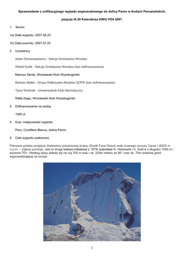 Sprawozdanie z unifikacyjnego wyjazdu wspinaczkowego do doliny Paron w Andach Peruwiańskich, pozycja IA 20 Kalendarza KWiU PZA 2007. 1. Termin 1a) Data wyjazdu: 2007.06.23 1b) Data powrotu: 2007.07.22 2. Uczestnicy Adam Domanasiewicz - Sekcja Grotołazów Wrocław Witold Kubik - Sekcja Grotołazów Wrocław (bez dofinansowania) Mariusz Serda, Wrocławski Klub Wysokogórski Bartosz Małek - Grupa Wałbrzysko-Kłodzka GOPR (bez dofinansowania) Tytus Woźniak - Uniwersytecki Klub Alpinistyczny Rafał Zając, Wrocławski Klub Wysokogórski 3. Dofinansowanie na osobę. 1000 zł 4. Kraj i miejscowość wyjazdu Peru, Cordillera Blanca, dolina Paron. 5. Cele wyjazdu (założone). Pierwsze polskie przejście diretissimy południowej ściany (South Face Direct) mało znanego szczytu Caraz I (6025 m n.p.m. – zdjęcie poniżej). Jest to droga lodowo-mikstowa z 1979r autorstwa N. Hellewella i A. Sole’a o długości 1000 m i wycenie TD+. Według opisu składa się na nią 700 m lodu i ok. 225m mikstu do 80° oraz ok. 75m śnieżnej grani wyprowadzającej na szczyt. 1 6. Treść sprawozdania. Do Limy przylecieliśmy 2007.06.23 wieczorem ale do doliny Paron dotarliśmy dopiero 2007.07.01 z powodu tygodniowego opóźnienia cargo lotniczego, którym leciał nasz sprzęt. Na początek zamierzaliśmy wejść na Caraz I łatwą drogą; po pierwsze dla aklimatyzacji a po drugie dla rozpoznania drogi zejścia po ewentualnym pokonaniu drogi sportowej. 2007.07.03 założyliśmy obóz (4800 m n.p.m.) pod wschodnią ścianą Caraz I. Od początku pobytu w dolinie trapiły nas dolegliwości jelitowe (czyt. potężna sraka :-), które poważnie nas osłabiły, a nawet czasowo wyeliminowały z akcji Bartka, niemniej jednak udało nam się zewrzeć szeregi i 2007.07.06 przed świtem w dwóch zespołach trójkowych (Mariusz, Rafał, Tytus oraz Adam, Witek + Jacek Kubryk z zaprzyjaźnionej grupy trekkingowej) naparliśmy na wschodnią ścianę Caraz I. Mimo nominalnie niewielkiej trudności (D) i przewyższenia (900m) droga okazała się wymagająca, skomplikowana i niebezpieczna ze względu na ilość szczelin i seraków – zgodnie przyznaliśmy, że nikt z nas nigdy wcześniej nie szedł bardziej porąbaną drogą lodowcową. Po przeczekaniu południowego skwaru pod jednym z seraków dotarliśmy na szczyt, a dokładniej w okolice jego śnieżnego wierzchołka, który okazał się 25-metrową śnieżną czapą odgrodzoną od zbocza szczytu potężną poziomą szczeliną. Nie chcąc ryzykować zawalenia tej czapy zadowoliliśmy się zdjęciami przy szczelinie pod wierzchołkiem, na wysokości dokładnie 6000 m n.p.m. wg wskazań GPSa, po czym już po ciemku zeszliśmy do obozu dokładnie tą samą drogą. Górna część wschodniej ściany Caraz I Na wschodniej ścianie Caraz I, w tle Artensoraju Po dniu odpoczynku zeszliśmy do zapory przy jeziorze Paron i przy tej okazji muszę zaznaczyć, że bez pomocy wszystkich kolegów z wyprawy sam nie dałbym rady znieść swojego plecaka – tak byłem wycieńczony tą przeklętą sraczką. 2007.07.09 koledzy zjechali do wsi Caraz uzupełnić prowiant, a następnego dnia Adam, Bartek, Tytus i Witek podeszli do bazy (4900 m n.p.m.) pod pięknym szczytem Artensoraju (6025 m n.p.m.) w głębi doliny Paron. Następnie 2007.07.12 przenieśli obóz na lodowiec pod ścianą (5100 m n.p.m.) i 2007.07.13 zespół Adam i Witek podjął zaawansowaną próbę wejścia na ten szczyt drogą normalną (południowo-wschodnia ściana, trudność D, przewyższenie 700m), lecz został zmuszony do odwrotu ok. 100m pod szczytem z powodu nagłego opadu deszczu ze śniegiem! 2 Należy dodać, że w dniach 2007.07.10-13 codziennie po południu padał śnieg, co miało spory wpływ na warunki w ścianach. Adam Domanasiewicz i Witold Kubik pod wierzchołkiem Caraz I Artesonraju (6025 m n.p.m.) Natomiast 2007.07.10 Mariusz i ja podeszliśmy w górę moreny lodowca pod pn. ścianą szczytu Huandoy, skąd po raz pierwszy obejrzeliśmy południową ścianę Caraz I – cel naszej wyprawy. Zgodnie z informacjami uzyskanymi od miejscowych przewodników w tym roku w ścianach było dużo lodu, a w przypadku „naszej” ściany nawet nadprogramowo dużo – w górnej części, tam gdzie są trudności bariery skalno-lodowej zauważyliśmy pasmo seraków i 3 grzybów śnieżnych wyglądających na jakby przewieszone ... o których opis drogi nie wspominał. 2007.07.11 podeszliśmy z Mariuszem do dolinki (4800 m n.p.m.) pod południową ścianą Caraz I, co zabrało nam 7 i 1/2 godziny (zdecydowanie jest to najbardziej uciążliwe podejście w dolinie Paron) i rozbiliśmy namiot na doskonale gładkiej i poziomej granitowej płycie. Po dniu odpoczynku poszliśmy pod ścianę i zaporęczowaliśmy szczelinę brzeżną, której przełojenie w przewieszonym sypkim śniegu dostarczyło Mariuszowi niemałych emocji. Ponadto samo dojście do lodowca pod ścianą (ok. 1 godz.) okazało się na tyle skomplikowane, że zdecydowaliśmy się poświęcić kolejny dzień na jego oznaczenie kopczykami, bez których niezmiernie trudno byłoby nam trafić pod ścianę po ciemku, zwłaszcza że na planowaną przez nas noc ataku przypadał nów. Diretissima południowej ściany Caraz I (6025m n.p.m.) Mariusz Serda w pd ścianie Caraz I, w tle jezioro Paron 2007.07.15 przed świtem weszliśmy w ścianę i w 12 godzin pokonaliśmy pierwsze 700m lodu i śniegu o nachyleniu do 75°. Mimo asekuracji lotnej poruszaliśmy się wolniej niż planowaliśmy ponieważ cienki lód i sypki śnieg nie dawały możliwości przyzwoitej asekuracji i zakładanie przelotów wymagało mozolnego dokopywania się do skały pod lodem i śniegiem. Zabiwakowaliśmy na wyrąbanej w lodzie półce u podstawy bariery skalno-lodowej na wysokości ok. 5700 m n.p.m. Ponieważ na południe od równika słońce nigdy nie pada na południowe ściany, rano długo czekaliśmy na podniesienie się temperatury i wspinaczkę w barierze skalno-lodowej wznowiliśmy 