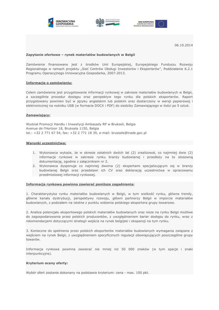 06.10.2014 Zapytanie ofertowe – rynek materiałów budowlanych w Belgii Zamówienie finansowane jest z środków Unii Europejskiej, Europejskiego Funduszu Rozwoju Regionalnego w ramach projektu „Sieć Centrów Obsługi Inwestorów i Eksporterów”, Poddziałanie 6.2.1 Programu Operacyjnego Innowacyjna Gospodarka, 2007-2013. Informacje o zamówieniu: Celem zamówienia jest przygotowanie informacji rynkowej w zakresie materiałów budowlanych w Belgii, a szczególnie procedur dostępu oraz perspektyw tego rynku dla polskich eksporterów. Raport przygotowany powinien być w języku angielskim lub polskim oraz dostarczony w wersji papierowej i elektronicznej na nośniku USB (w formacie DOCX i PDF) do siedziby Zamawiającego w ilości po 5 sztuk. Zamawiający: Wydział Promocji Handlu i Inwestycji Ambasady RP w Brukseli, Belgia Avenue de l'Horizon 18, Bruksela 1150, Belgia tel.: +32 2 771 67 54, fax: +32 2 771 18 39, e-mail: [email protected] Warunki uczestnictwa: 1. 2. Wykonawca wykaże, że w okresie ostatnich dwóch lat (2) zrealizował, co najmniej dwie (2) informacje rynkowe w zakresie rynku branży budowlanej i przedłoży na to stosowną dokumentację, zgodnie z załącznikiem nr 2. Wykonawca dysponuje co najmniej dwoma (2) ekspertami specjalizującym się w branży budowlanej Belgii oraz przedstawi ich CV oraz deklarację uczestnictwa w opracowaniu przedmiotowej informacji rynkowej. Informacja rynkowa powinna zawierać poniższe zagadnienia: 1. Charakterystyka rynku materiałów budowlanych w Belgii, w tym wielkość rynku, główne trendy, główne kanały dystrybucji, perspektywy rozwoju, główni partnerzy Belgii w imporcie materiałów budowlanych, z podziałem na istotne z punktu widzenia polskiego eksportera grupy towarowe. 2. Analiza potencjału eksportowego polskich materiałów budowlanych oraz nisze na rynku Belgii możliwe do zagospodarowania przez polskich producentów, z uwzględnieniem barier dostępu do rynku, wraz z rekomendacjami dotyczącymi strategii wejścia na rynek belgijski i ekspansji na tym rynku. 3. Konieczne do spełnienia przez polskich eksporterów materiałów budowlanych wymagania związane z wejściem na rynek Belgii, z uwzględnieniem specyficznych regulacji obowiązujących poszczególne grupy towarów. Informacja rynkowa powinna zawierać nie mniej niż 50 000 znaków (w tym spacje i znaki interpunkcyjne). Kryterium oceny oferty: Wybór ofert zostanie dokonany na podstawie kryterium: cena - max. 100 pkt. Termin i sposób złożenia oferty: Termin składania ofert do dnia 20 października 2014 r. w siedzibie Zamawiającego lub na adres poczty elektronicznej: [email protected] Czas związania Wykonawcy ofertą: 20 dni kalendarzowych od dnia złożenia oferty. Obligatoryjny termin dostarczenia analizy: Do 17 listopada 2014 r. Kontakt: W przypadku pytań, uprzejmie proszę o kontakt pod adresem email: [email protected] i +32 2 771 67 54. Podana cena za wykonanie informacji rynkowej powinna być w Euro. Z wybranym Wykonawcą zawarta zostanie umowa. Nie podpisanie umowy i nie odesłanie jej przez Wykonawcę do Zamawiającego w terminie 5 dni roboczych od dnia jej otrzymania (drogą elektroniczną) Zamawiający traktować będzie, jako odstąpienie Wykonawcy od realizacji informacji rynkowej. Wynagrodzenie Wykonawcy zostanie wypłacone na podstawie wystawionej przez Wykonawcę, zgodnie z postanowieniami umowy, faktury. Oferta na przedmiot niniejszego zapytania ofertowego powinna zawierać poniższe dokumenty: 1) Ofertę opracowaną zgodnie z Zał. nr 1 do niniejszego zapytania ofertowego. 2) Tabelę zrealizowanych zamówień na potwierdzenie spełnienia obligatoryjnego warunku uczestnictwa. 3) CV ekspertów merytorycznych wraz z ich deklaracją uczestnictwa w projekcie. 4) Aktualny dokument poświadczający istnienie firmy wystawiony nie wcześniej niż 6 miesięcy przed upływem terminu składania oferty. Zastrzeżenia Zamawiającego: WPHI w Brukseli pozostawia sobie możliwość niedokonania wyboru wykonawcy bez podania przyczyny.