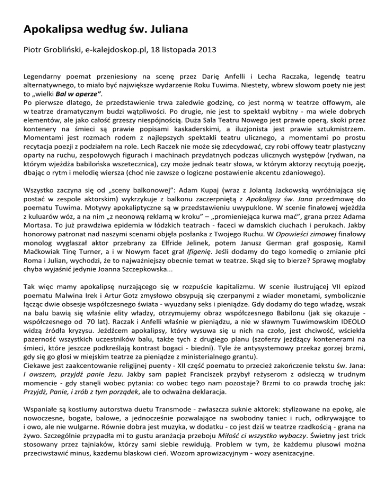 Apokalipsa według św. Juliana Piotr Grobliński, e-kalejdoskop.pl, 18 listopada 2013 Legendarny poemat przeniesiony na scenę przez Darię Anfelli i Lecha Raczaka, legendę teatru alternatywnego, to miało być największe wydarzenie Roku Tuwima. Niestety, wbrew słowom poety nie jest to „wielki Bal w operze”. Po pierwsze dlatego, że przedstawienie trwa zaledwie godzinę, co jest normą w teatrze offowym, ale w teatrze dramatycznym budzi wątpliwości. Po drugie, nie jest to spektakl wybitny - ma wiele dobrych elementów, ale jako całość grzeszy niespójnością. Duża Sala Teatru Nowego jest prawie operą, skoki przez kontenery na śmieci są prawie popisami kaskaderskimi, a iluzjonista jest prawie sztukmistrzem. Momentami jest rozmach rodem z najlepszych spektakli teatru ulicznego, a momentami po prostu recytacja poezji z podziałem na role. Lech Raczek nie może się zdecydować, czy robi offowy teatr plastyczny oparty na ruchu, zespołowych figurach i machinach przydatnych podczas ulicznych występów (rydwan, na którym wjeżdża babilońska wszetecznica), czy może jednak teatr słowa, w którym aktorzy recytują poezję, dbając o rytm i melodię wiersza (choć nie zawsze o logiczne postawienie akcentu zdaniowego). Wszystko zaczyna się od „sceny balkonowej”: Adam Kupaj (wraz z Jolantą Jackowską wyróżniająca się postać w zespole aktorskim) wykrzykuje z balkonu zaczerpniętą z Apokalipsy św. Jana przedmowę do poematu Tuwima. Motywy apokaliptyczne są w przedstawieniu uwypuklone. W scenie finałowej wjeżdża z kuluarów wóz, a na nim „z neonową reklamą w kroku” – „promieniejąca kurwa mać”, grana przez Adama Mortasa. To już prawdziwa epidemia w łódzkich teatrach - faceci w damskich ciuchach i perukach. Jakby honorowy patronat nad naszymi scenami objęła posłanka z Twojego Ruchu. W Opowieści zimowej finałowy monolog wygłaszał aktor przebrany za Elfride Jelinek, potem Janusz German grał gosposię, Kamil Maćkowiak Tinę Turner, a i w Nowym facet grał Ifigenię. Jeśli dodamy do tego komedię o zmianie płci Roma i Julian, wychodzi, że to najważniejszy obecnie temat w teatrze. Skąd się to bierze? Sprawę mogłaby chyba wyjaśnić jedynie Joanna Szczepkowska... Tak więc mamy apokalipsę nurzającego się w rozpuście kapitalizmu. W scenie ilustrującej VII epizod poematu Malwina Irek i Artur Gotz zmysłowo obsypują się czerpanymi z wiader monetami, symbolicznie łącząc dwie obsesje współczesnego świata - wyuzdany seks i pieniądze. Gdy dodamy do tego władzę, wszak na balu bawią się właśnie elity władzy, otrzymujemy obraz współczesnego Babilonu (jak się okazuje współczesnego od 70 lat). Raczak i Anfelli właśnie w pieniądzu, a nie w sławnym Tuwimowskim IDEOLO widzą źródła kryzysu. Jeźdźcem apokalipsy, który wysuwa się u nich na czoło, jest chciwość, wściekła pazerność wszystkich uczestników balu, także tych z drugiego planu (szoferzy jeżdżący kontenerami na śmieci, które jeszcze podkreślają kontrast bogaci - biedni). Tyle że antysystemowy przekaz gorzej brzmi, gdy się go głosi w miejskim teatrze za pieniądze z ministerialnego grantu). Ciekawe jest zaakcentowanie religijnej puenty - XII część poematu to przecież zakończenie tekstu św. Jana: I owszem, przyjdź panie Jezu. Jakby sam papież Franciszek przybył reżyserom z odsieczą w trudnym momencie - gdy stanęli wobec pytania: co wobec tego nam pozostaje? Brzmi to co prawda trochę jak: Przyjdż, Panie, i zrób z tym porządek, ale to odważna deklaracja. Wspaniałe są kostiumy autorstwa duetu Transmode - zwłaszcza suknie aktorek: stylizowane na epokę, ale nowoczesne, bogate, balowe, a jednocześnie pozwalające na swobodny taniec i ruch, odkrywające to i owo, ale nie wulgarne. Równie dobra jest muzyka, w dodatku - co jest dziś w teatrze rzadkością - grana na żywo. Szczególnie przypadła mi to gustu aranżacja przeboju Miłość ci wszystko wybaczy. Świetny jest trick stosowany przez tajniaków, którzy sami siebie rewidują. Problem w tym, że każdemu plusowi można przeciwstawić minus, każdemu blaskowi cień. Wozom aprowizacyjnym - wozy asenizacyjne.